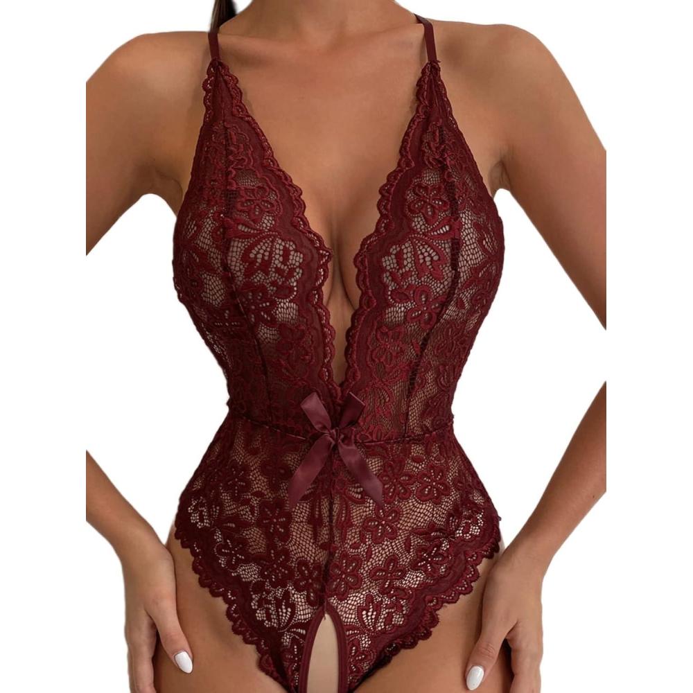 SOLY HUX Women’s Floral Lace Scalloped Trim Criss Cross Back Lingerie Teddy Bodysuit(Solid Maroon)