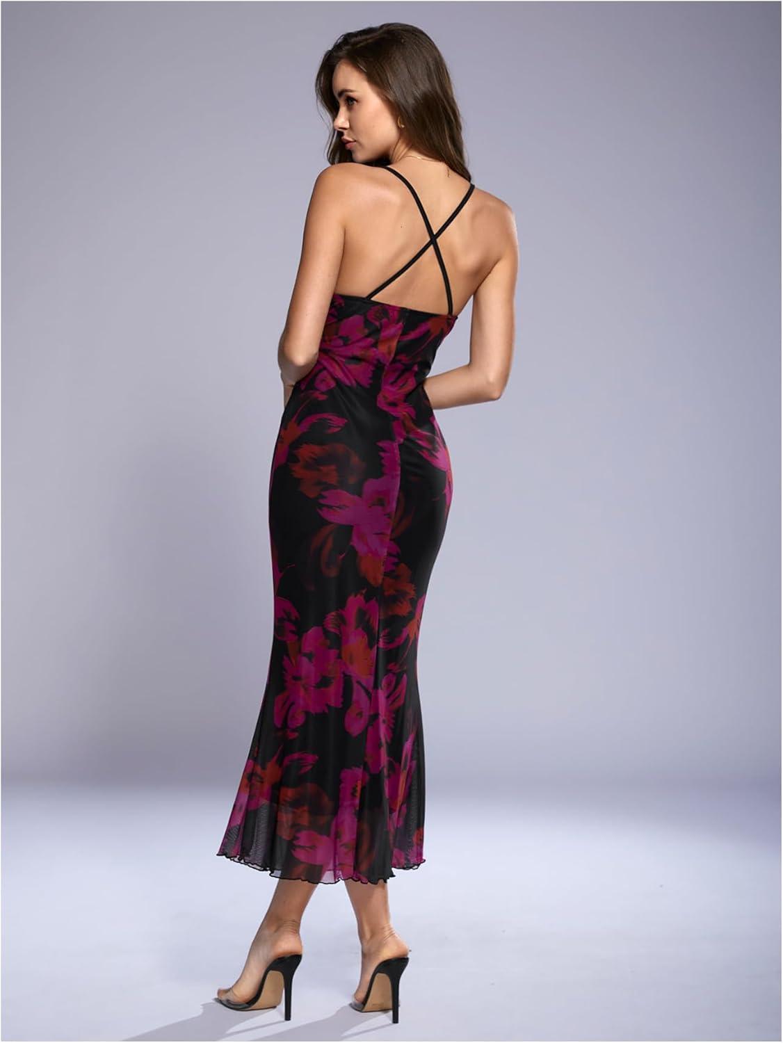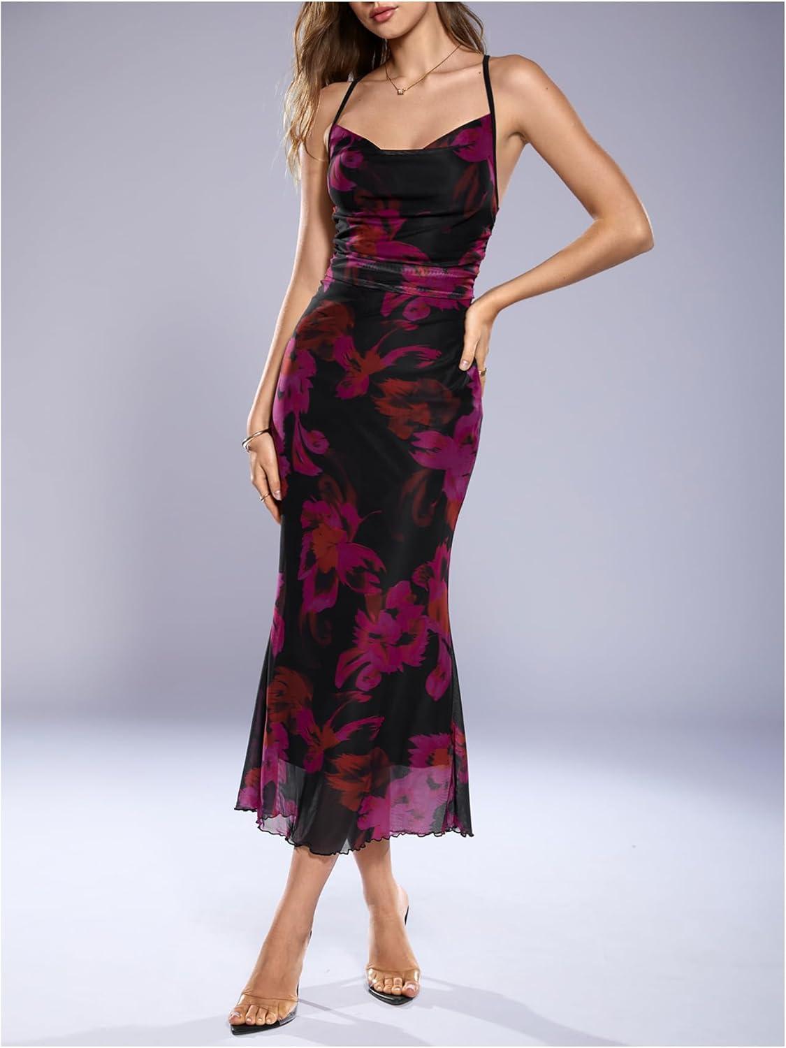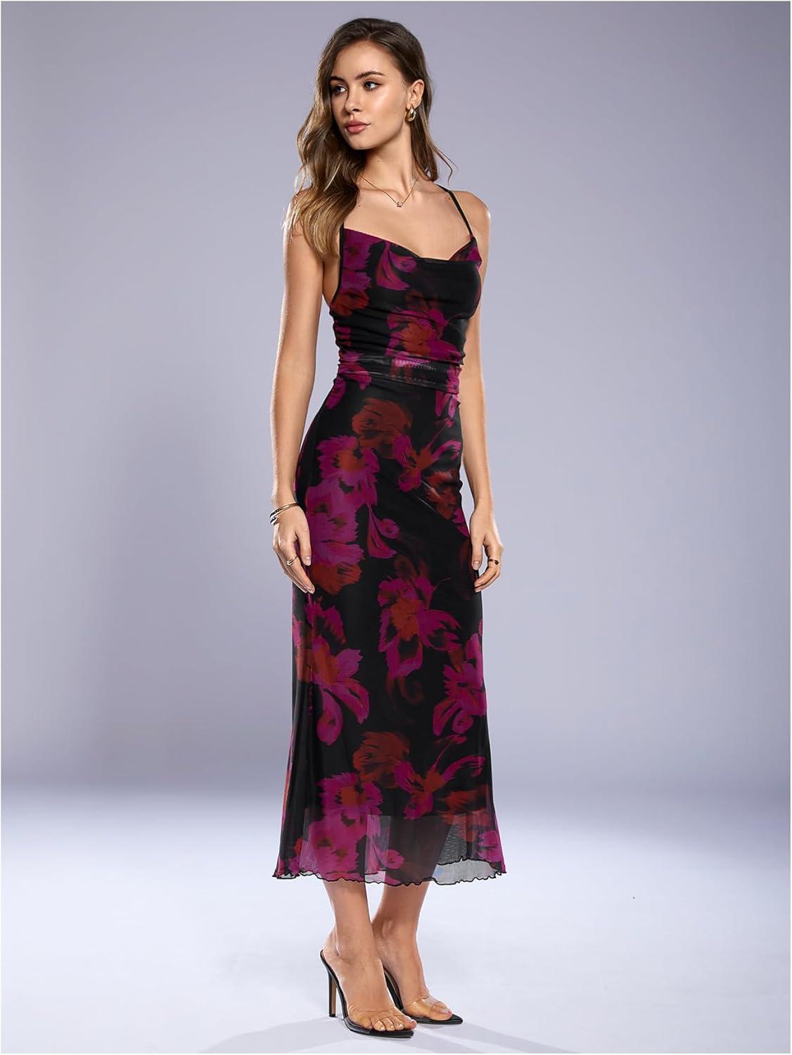 SOLY HUX Women’s Floral Mesh Bodycon Cami Dress Cowl Neck Sleeveless Cocktail Party Wedding Guest Long Maxi Dresses(Multicolor Floral)