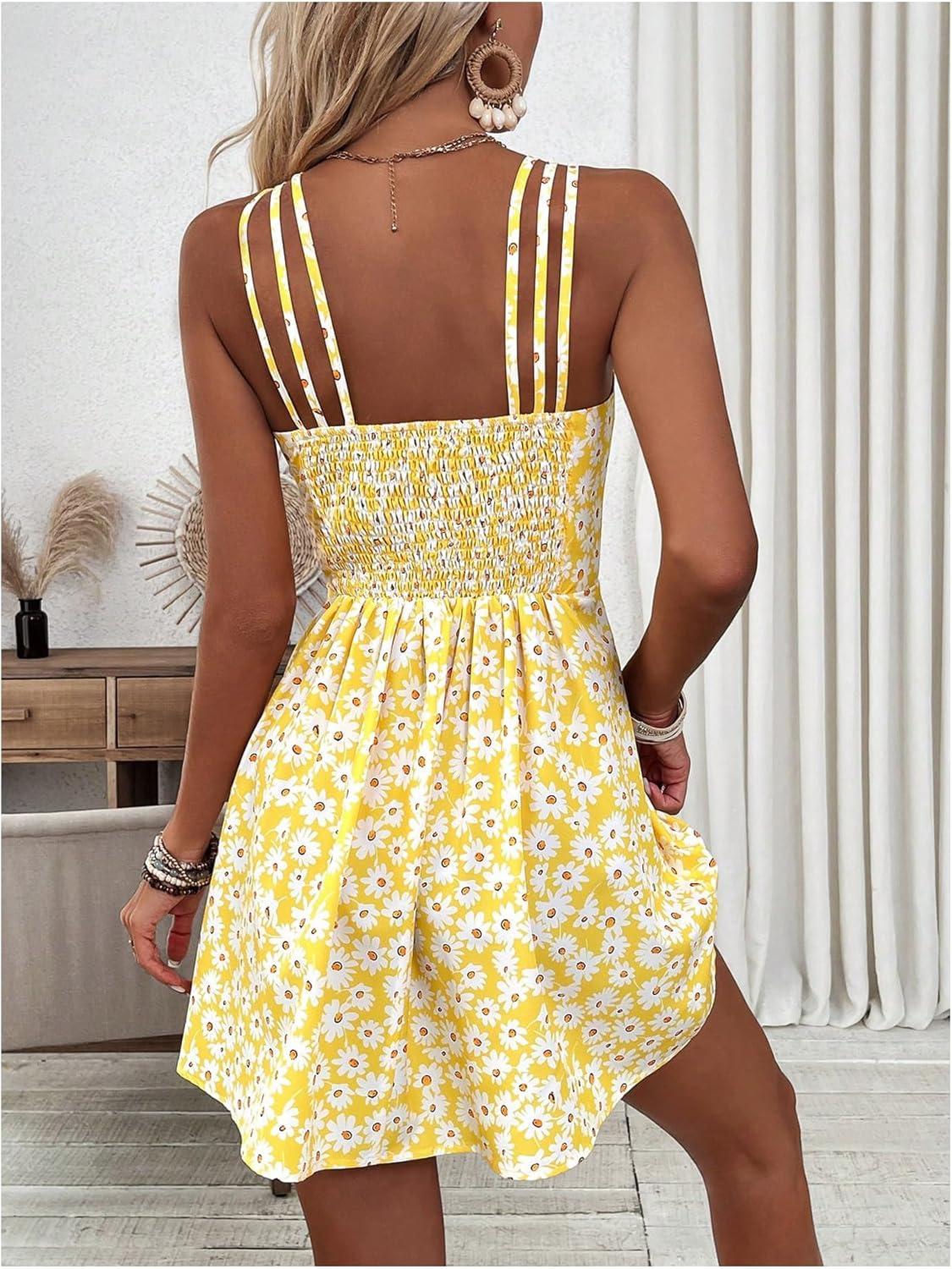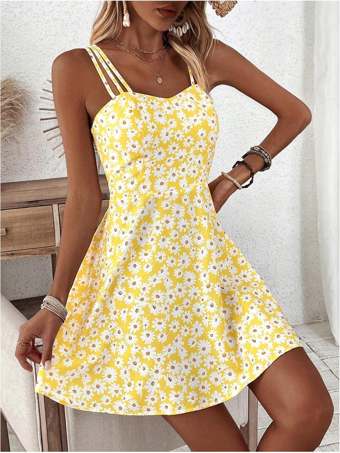SOLY HUX Women’s Floral Print Cami Dress Spaghetti Strap A Line Flowy Summer Mini Dresses Sundress(Yellow Floral)