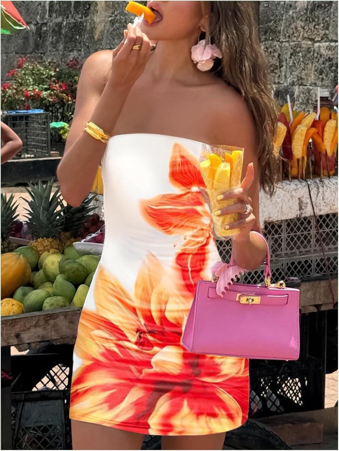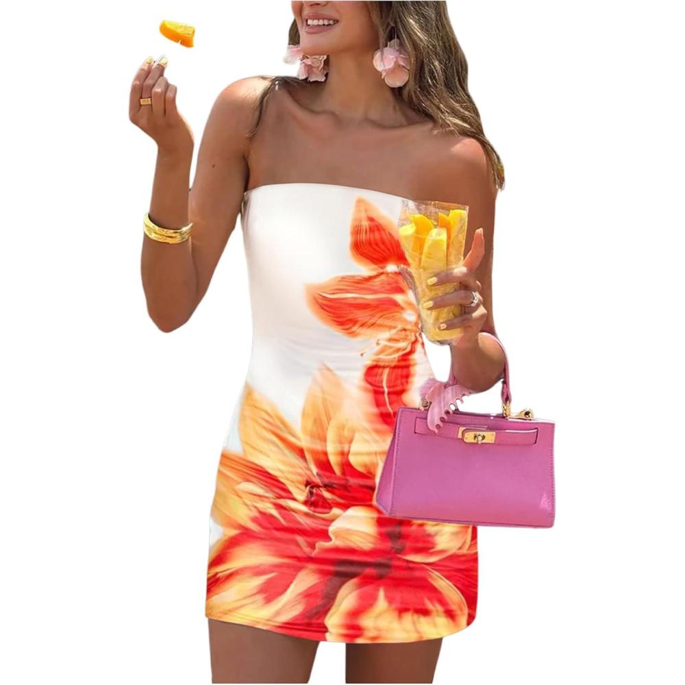 SOLY HUX Women’s Floral Print Mini Tube Dress Strapless Sleeveless Bodycon Dresses(White Flower Printed)
