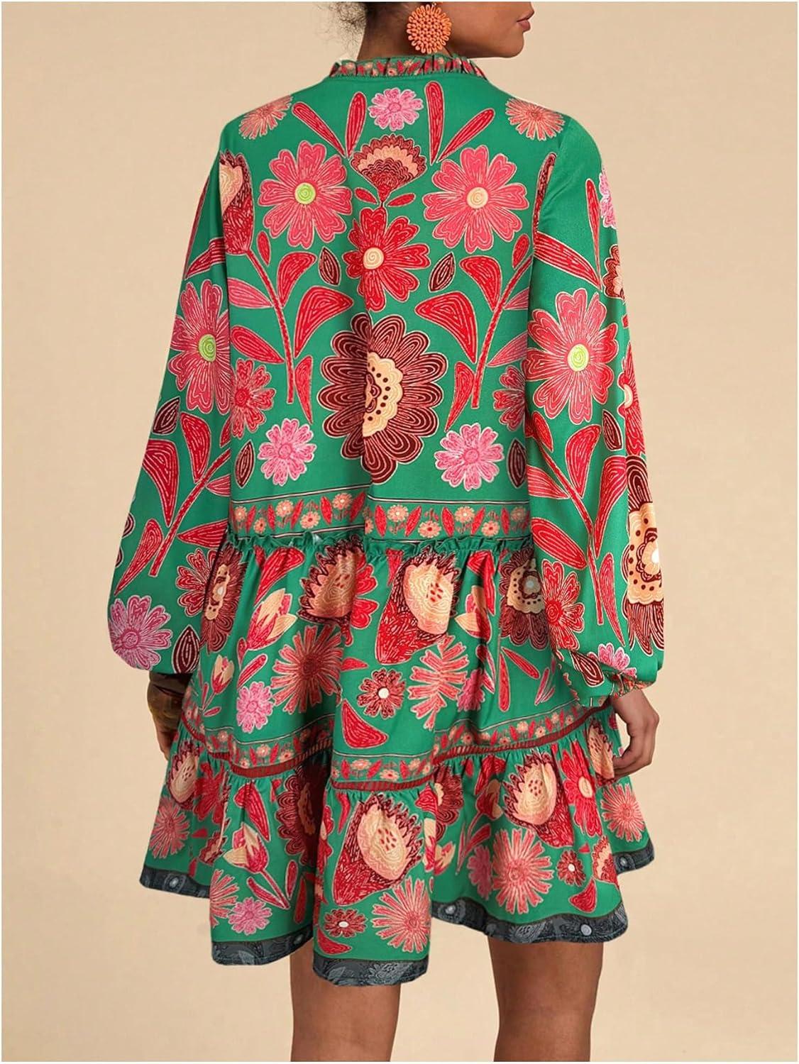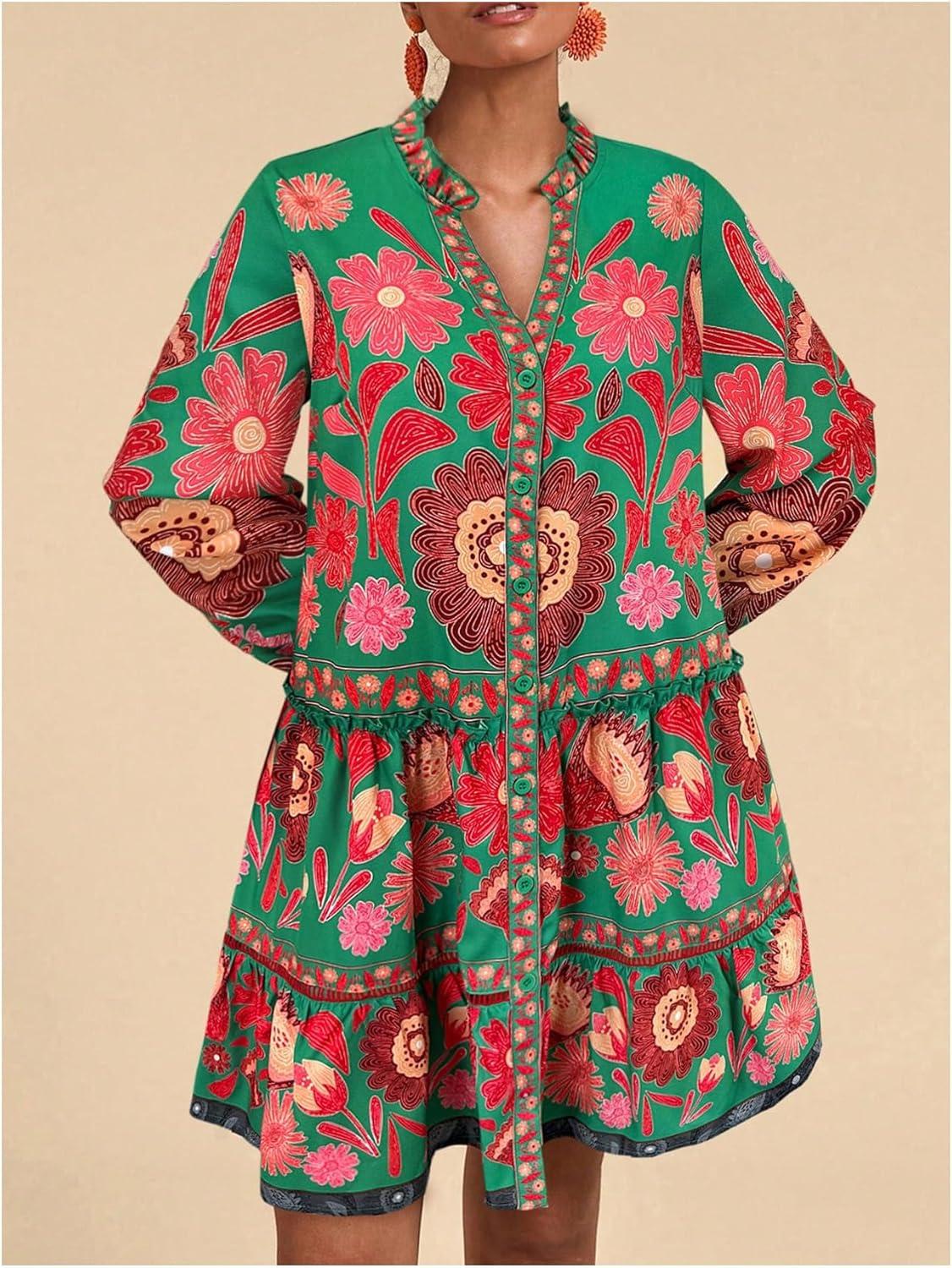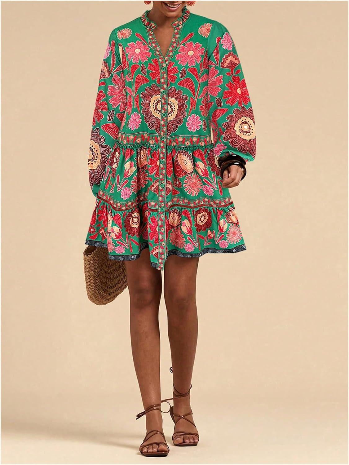 SOLY HUX Women’s Floral Print Summer Short Dresses Boho Beach Long Sleeve Button Down Flowy Smock Dress(Green Floral)