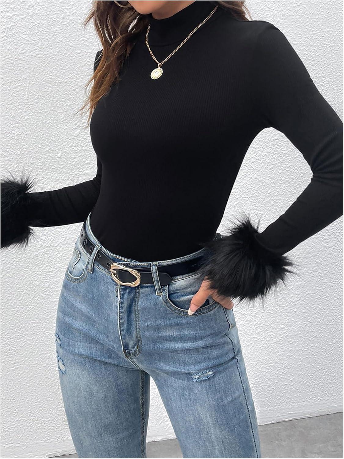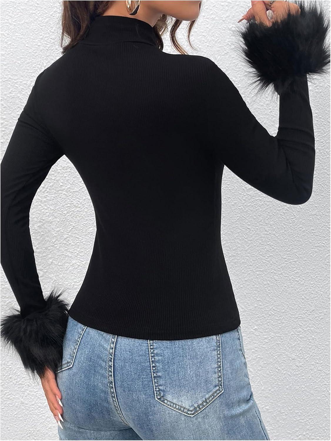 SOLY HUX Women’s Fuzzy Mock Neck T Shirt Long Sleeve Fitted Ribbed Knit Tee Tops(Solid Black)