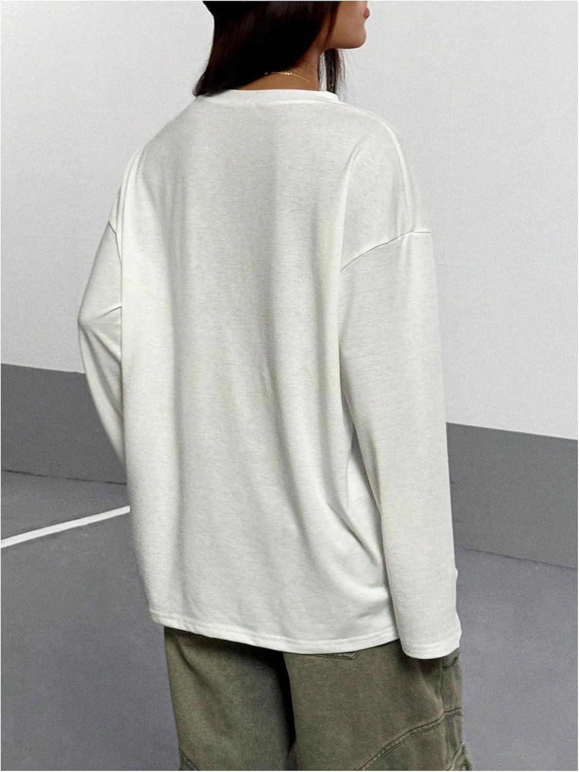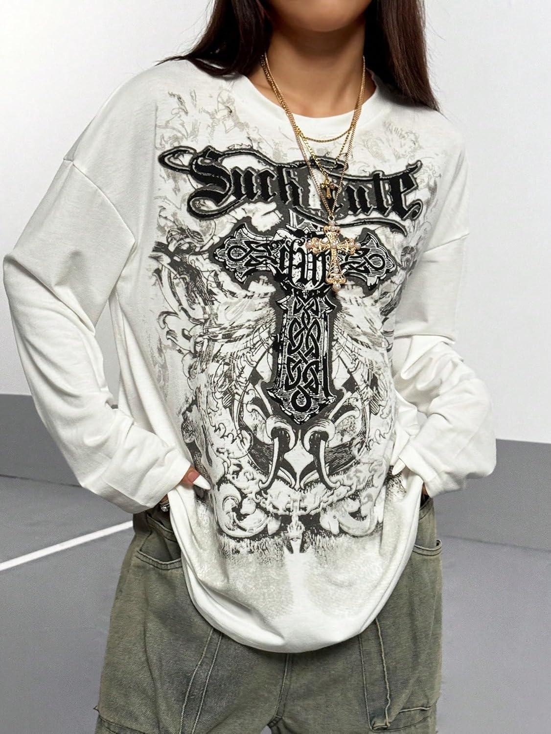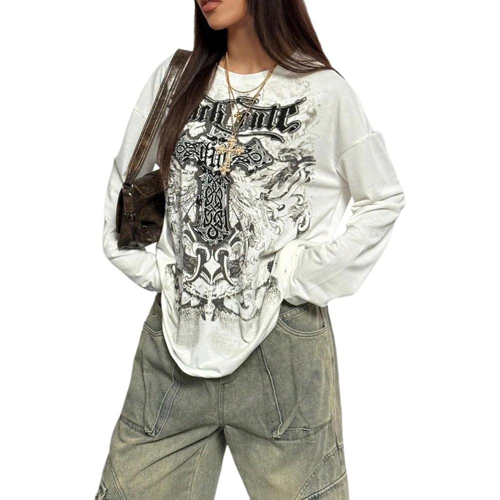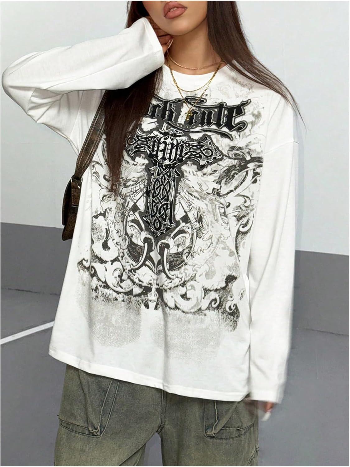 SOLY HUX Women’s Gothic Oversized Tops Long Sleeve Crew Neck Graphic Tee Shirts Y2k Grunge Clothes(White Graphic)