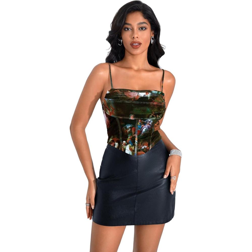 image:imageSOLY HUX Womens Graphic Figure Ruffled Bust Bustier Renaissance Cami Top Sleeveless Slim Fit Y2K Corset Crop TopsDark Khaki Printed