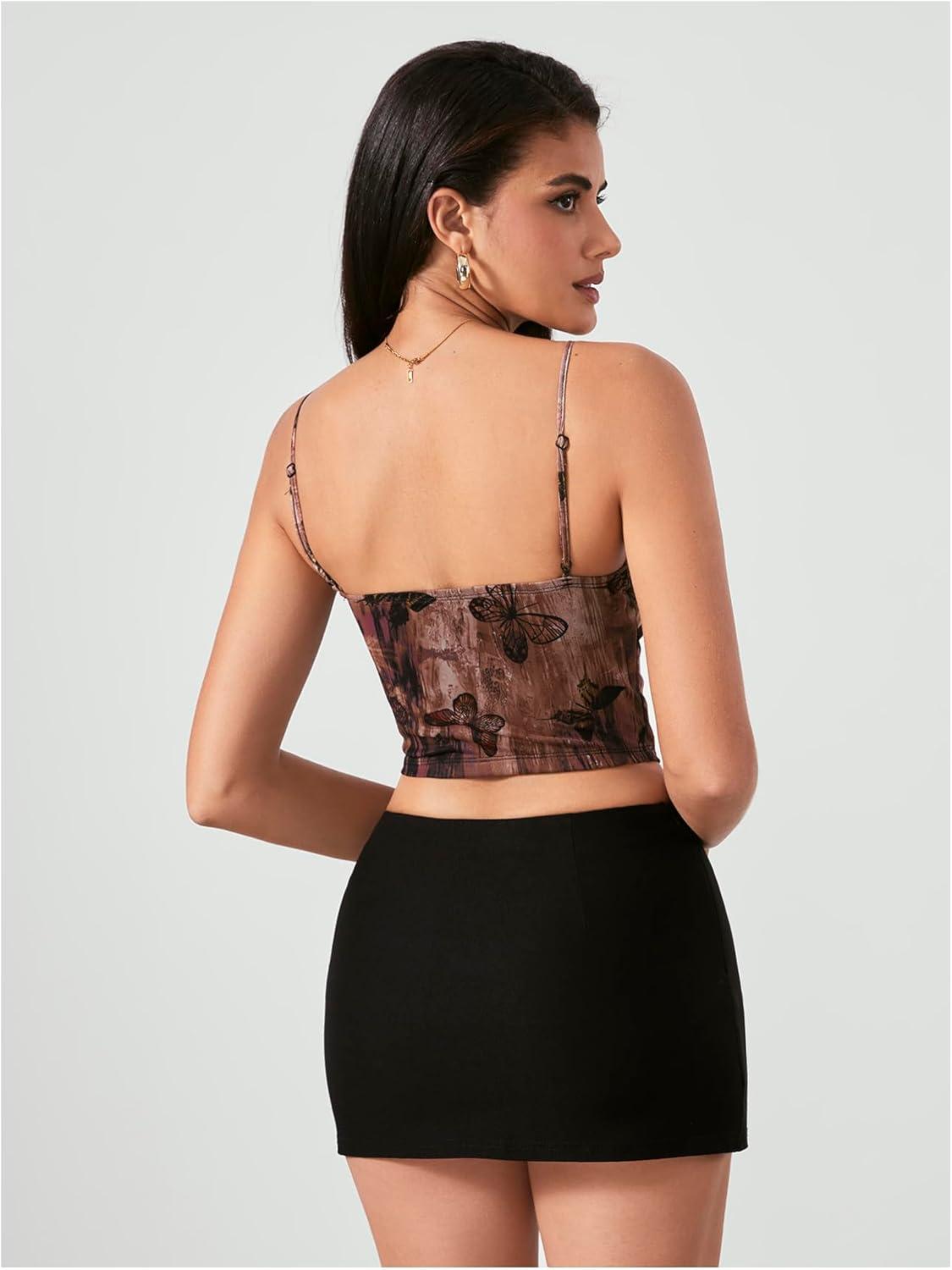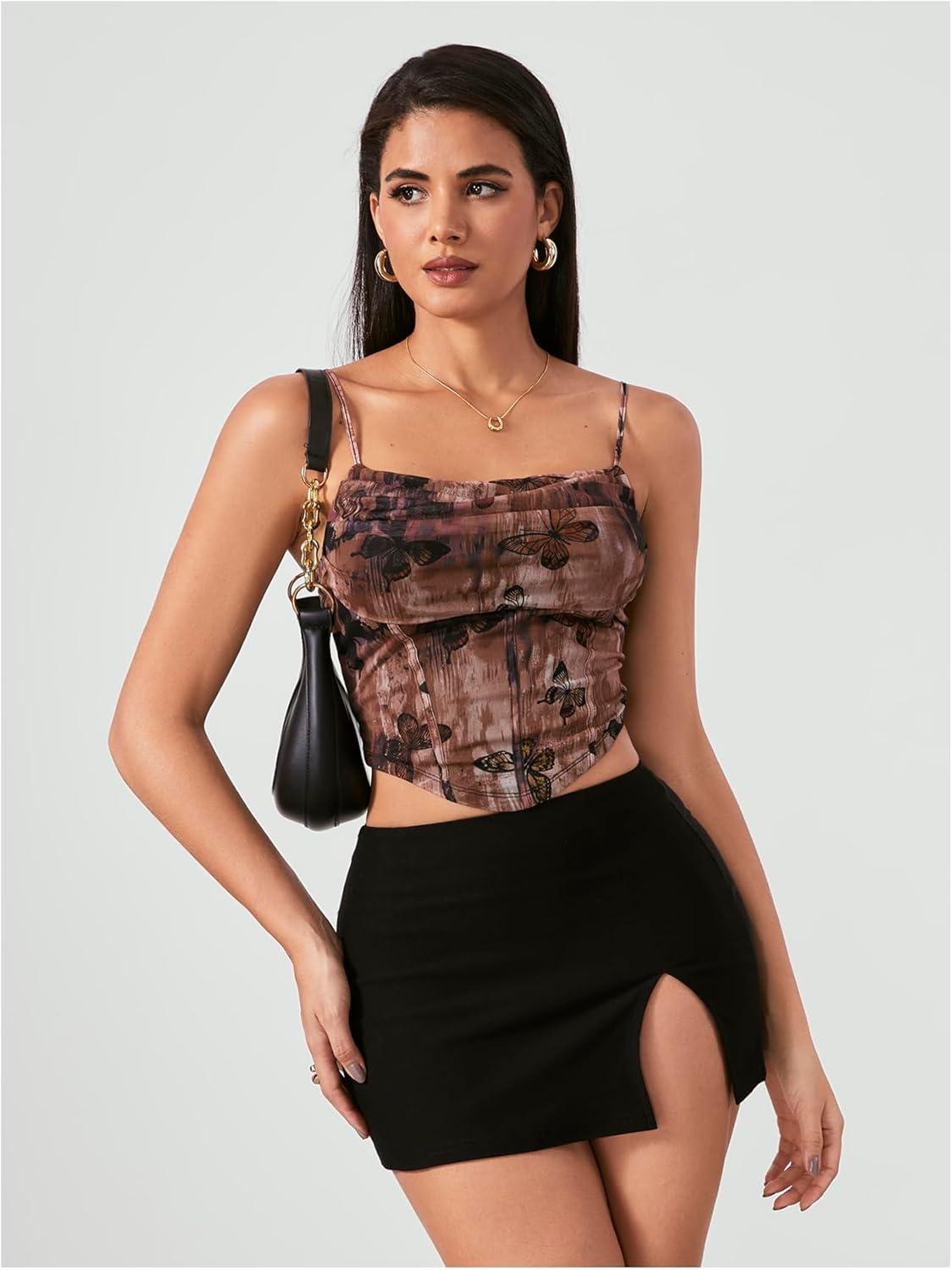 SOLY HUX Women’s Graphic Figure Ruffled Bust Bustier Renaissance Cami Top Sleeveless Slim Fit Y2K Corset Crop Tops(Dark Khaki Printed)