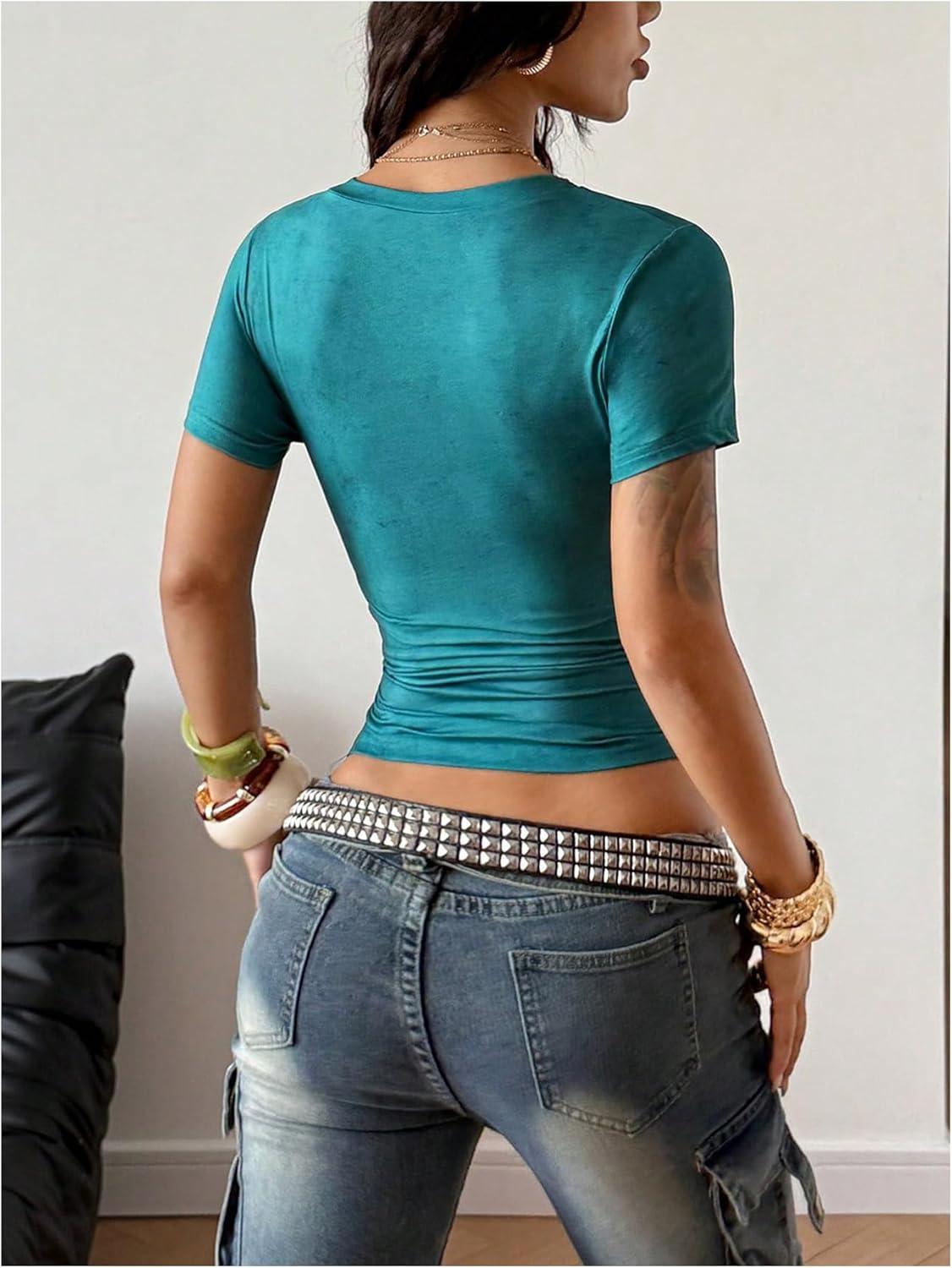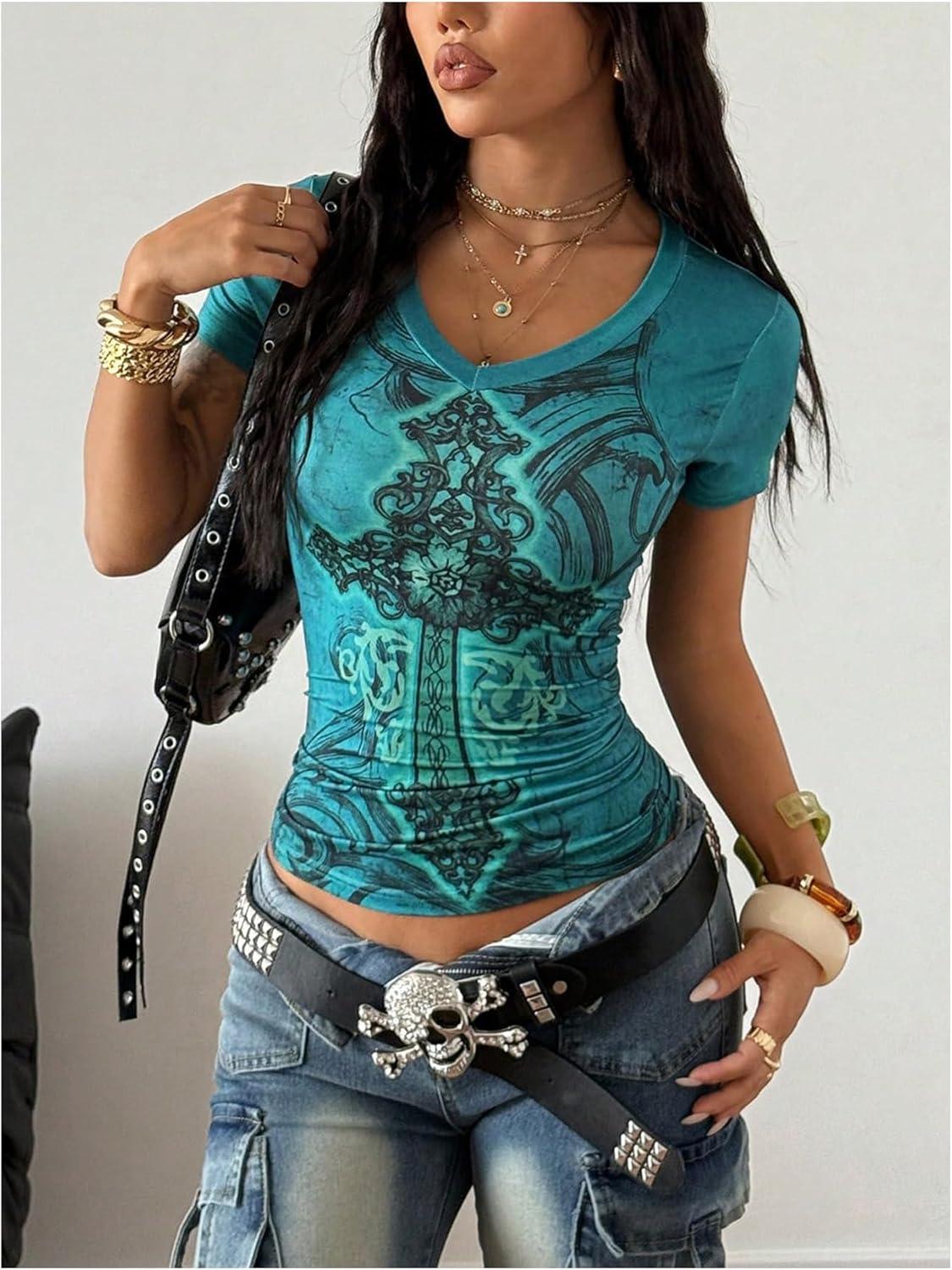 SOLY HUX Women’s Graphic Tees Y2K Vintage Gothic Tops 2000s Streetwear Shirt Emo Scene Alternative Clothes for Women(Teal Blue Graphic)