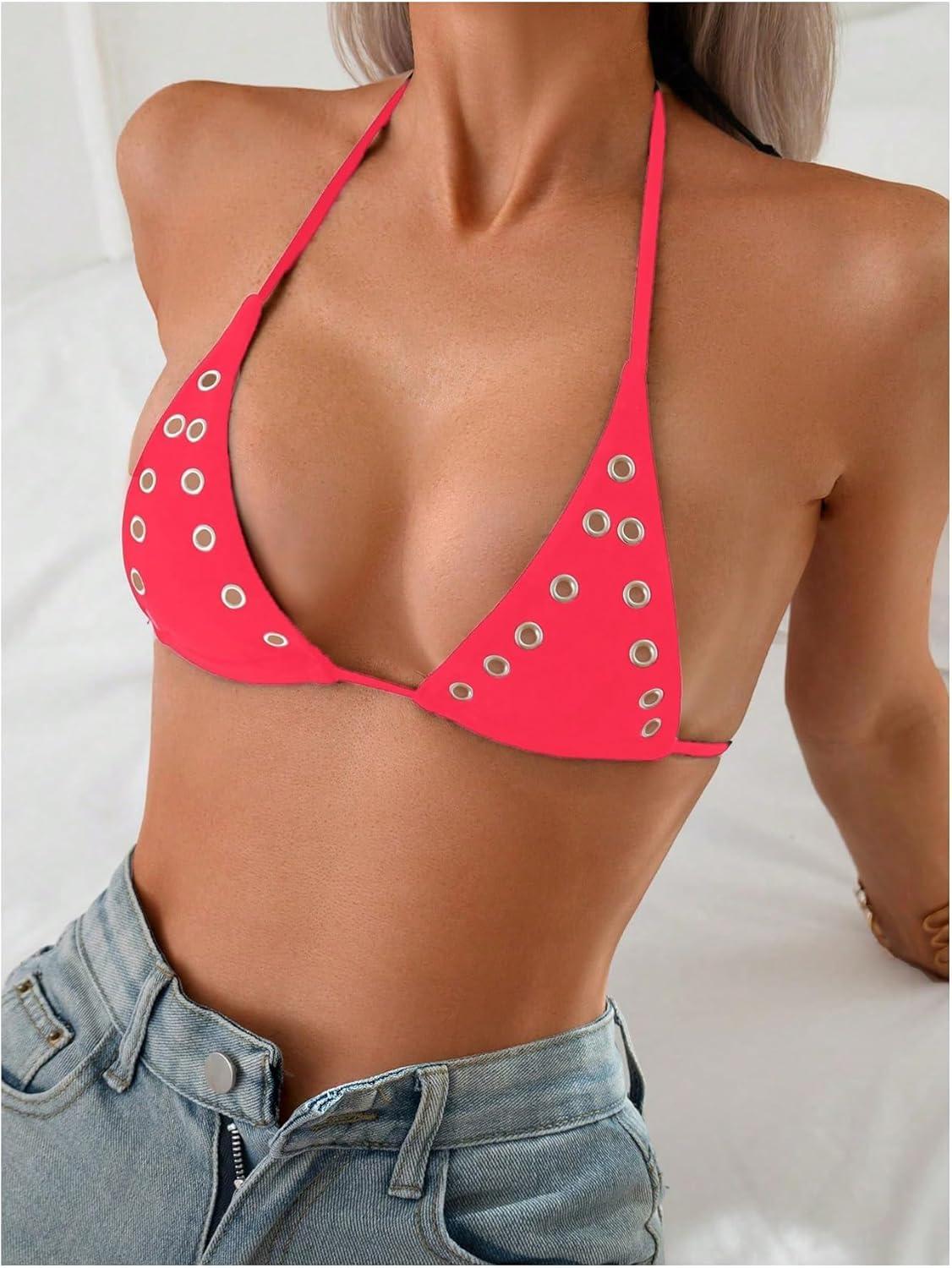 SOLY HUX Women’s Grommet Eyelet Halter Bikini Top Tie Backless Swim Tops Beach Wear(Pure Red)