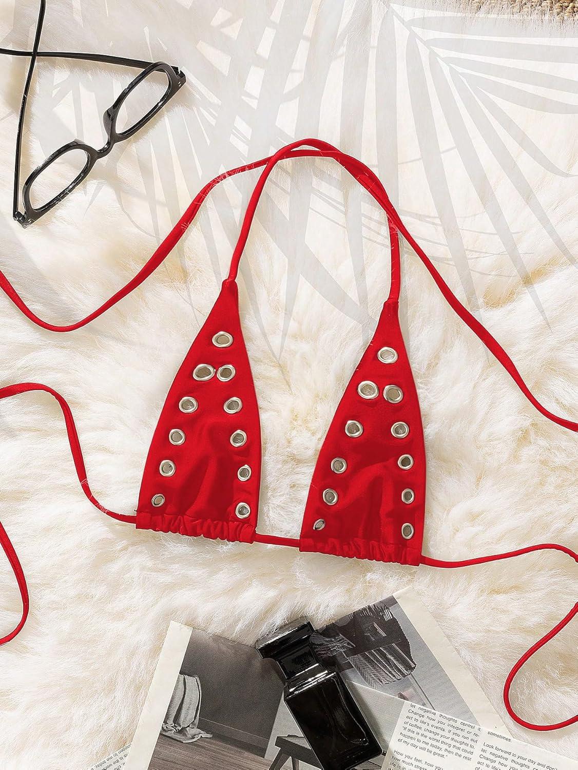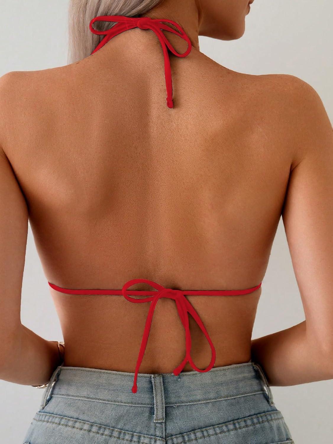 SOLY HUX Women’s Grommet Eyelet Halter Bikini Top Tie Backless Swim Tops Beach Wear(Pure Red)
