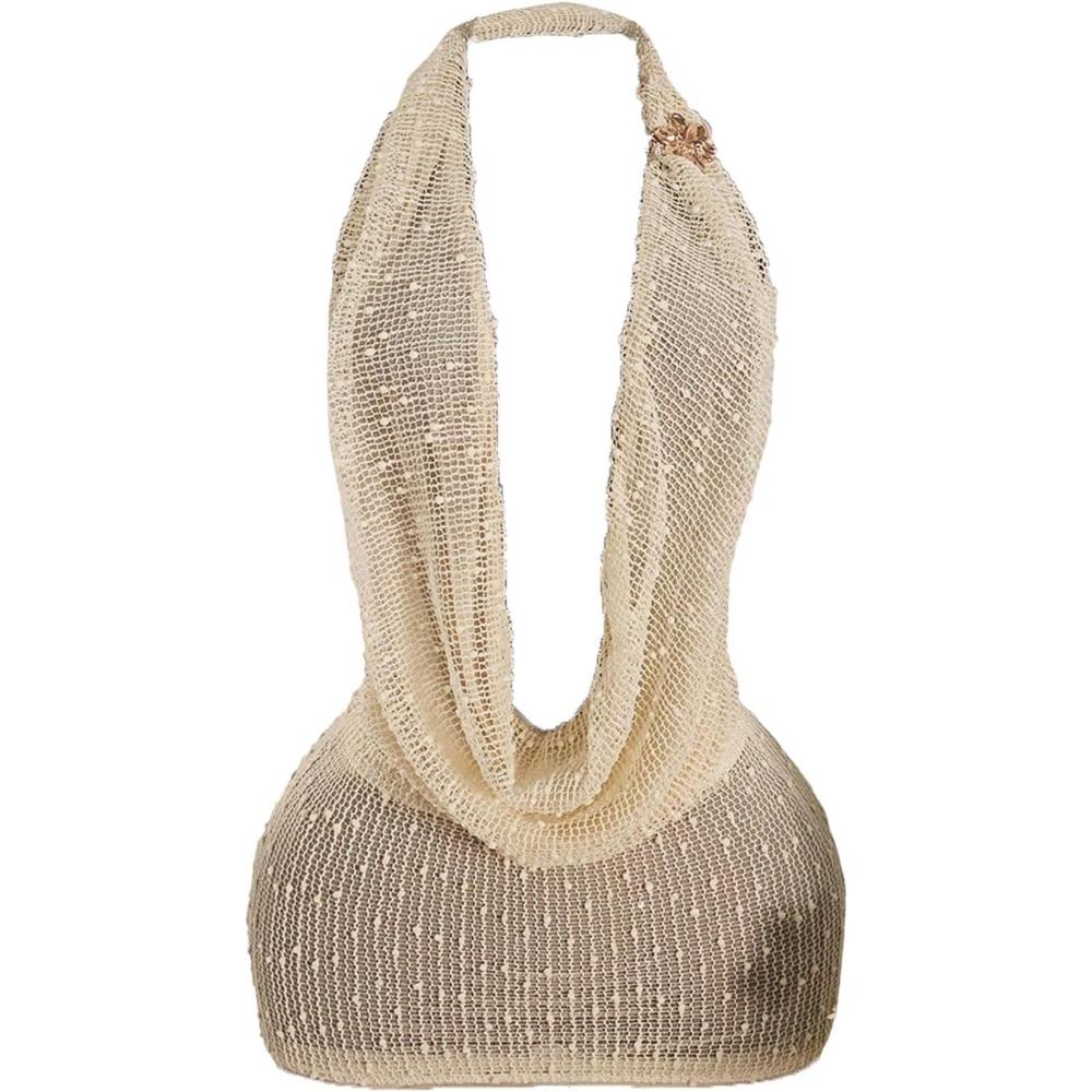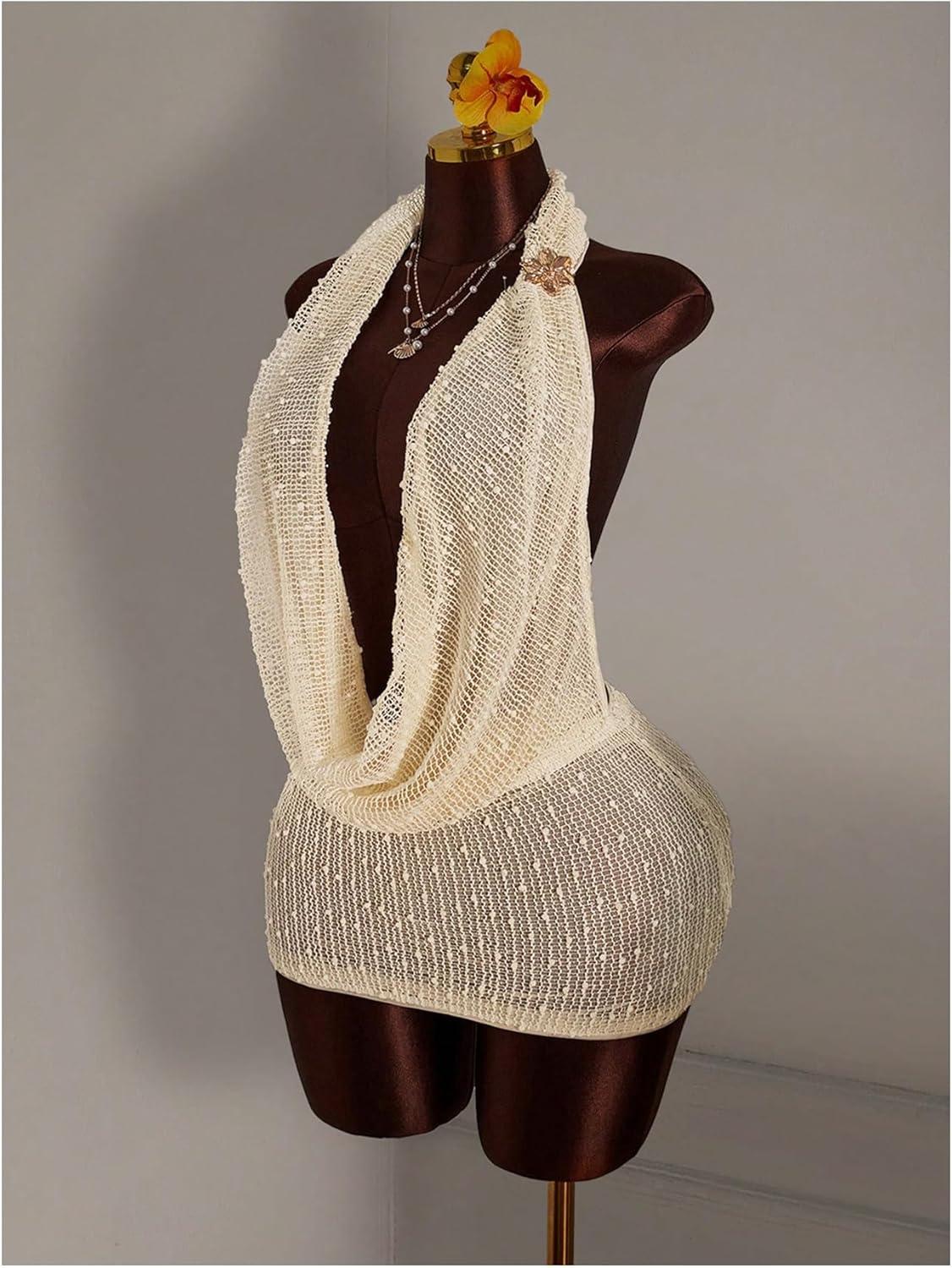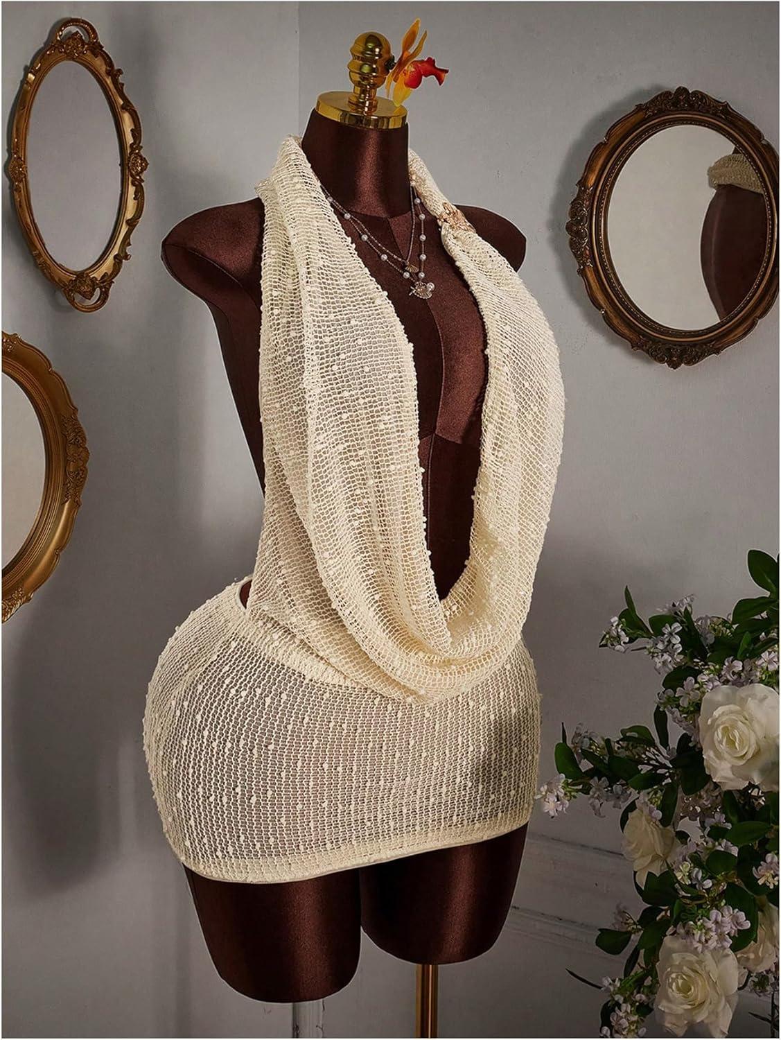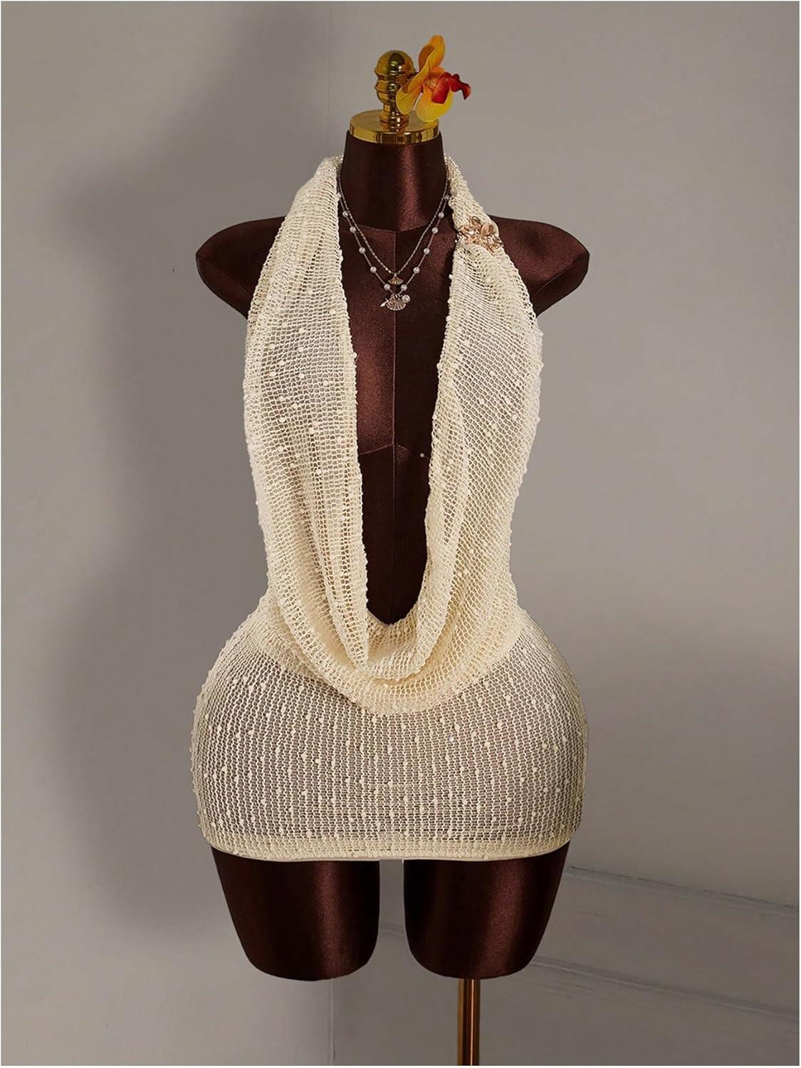 SOLY HUX Women’s Halter Mesh Mini Dress Sexy Deep V Neck Draped Sleeveless Backless Bodycon Club Party Dresses Plain Apricot XX-Small
