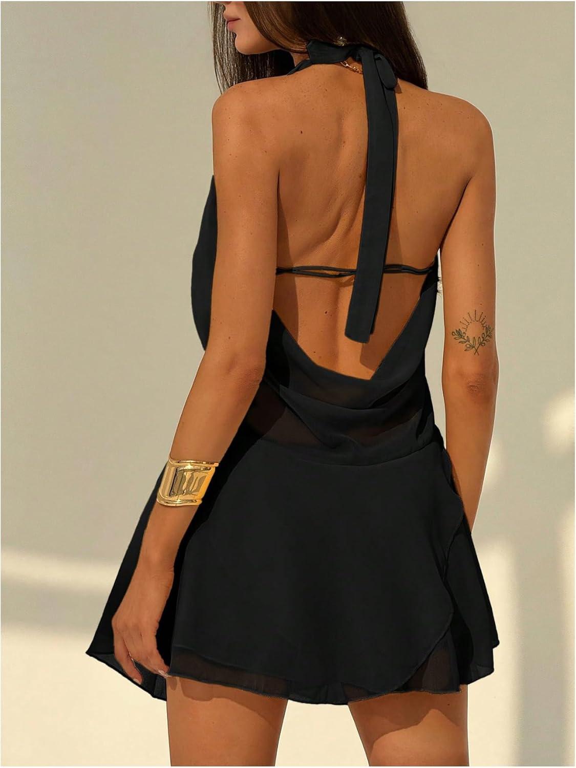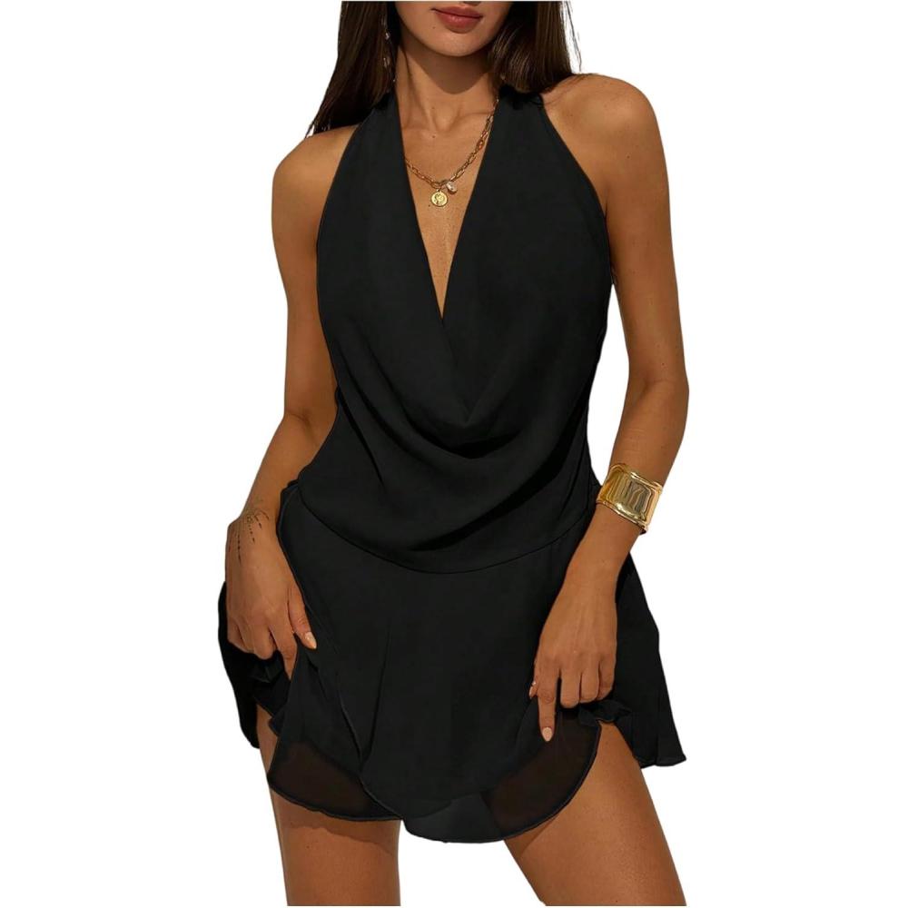 SOLY HUX Women’s Halter Mini Dress Deep V Neck Draped Ruffle Hem Backless Sleeveless Party Dresses(Plain Black)
