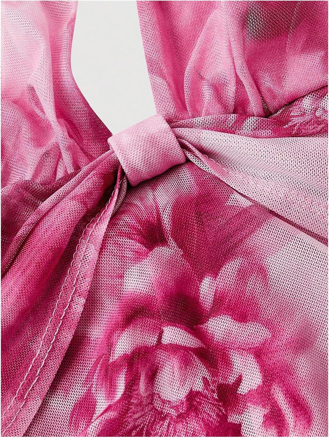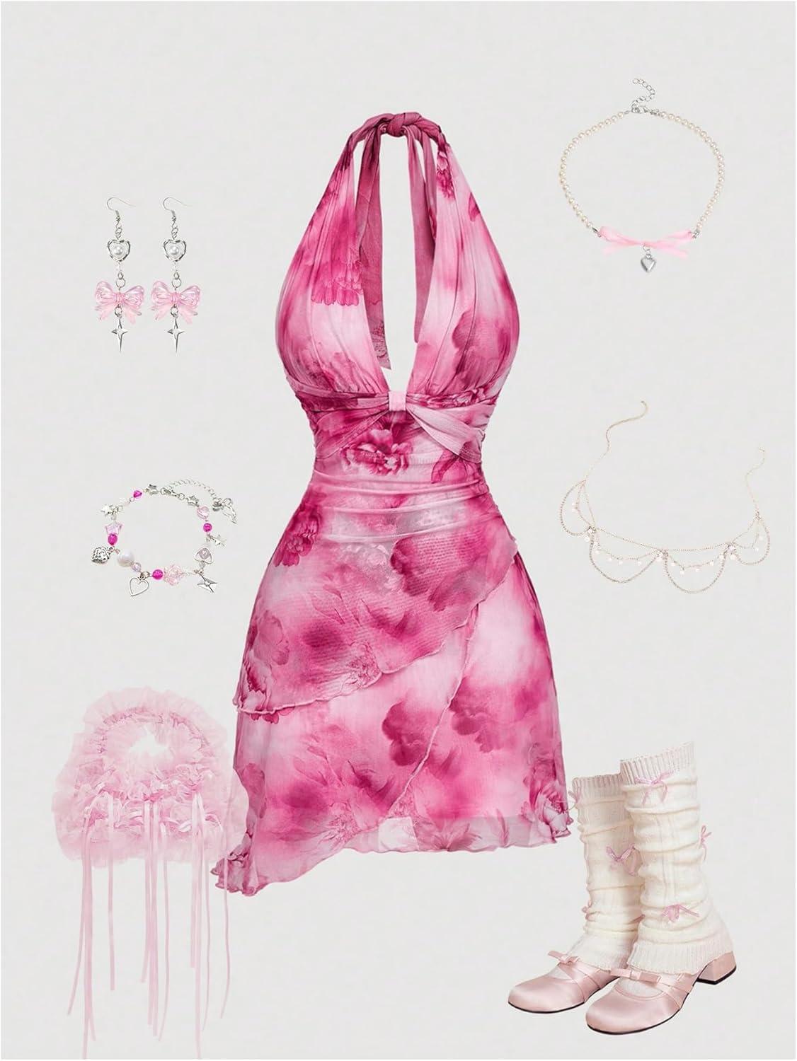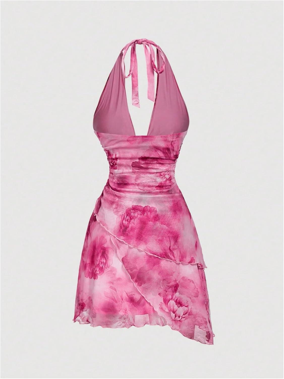SOLY HUX Women’s Halter Mini Dress Flowy Backless Deep V Neck Summer Casual Beach Dresses(Pink Multi)