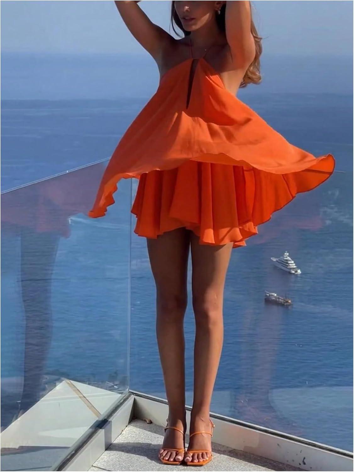 SOLY HUX Women’s Halter Neck Sleeveless Bow Tie Backless Flowy Mini Dress Beach Vacation Clothes(Solid Orange)