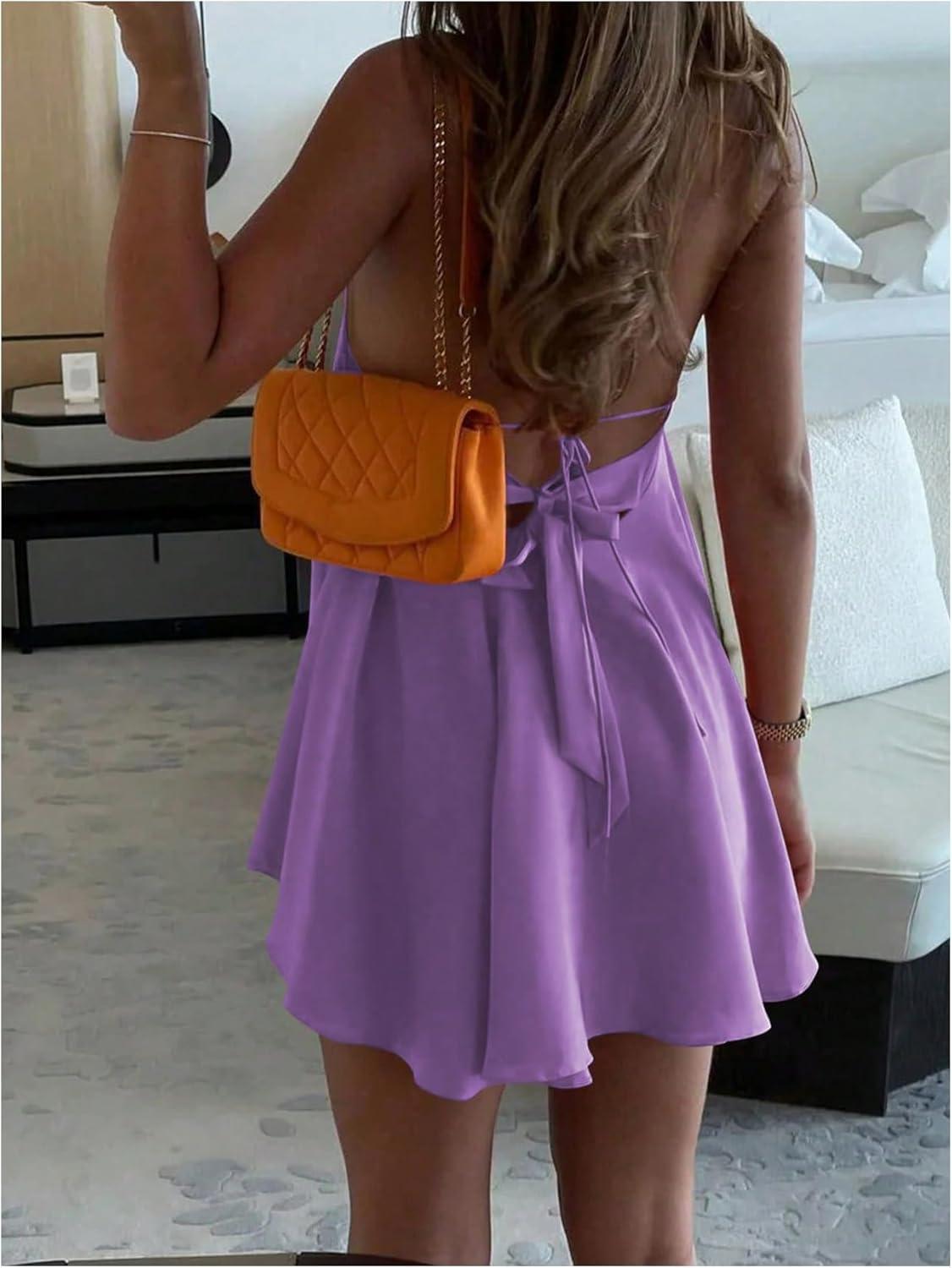 SOLY HUX Women’s Halter Neck Sleeveless Bow Tie Backless Flowy Mini Dress Beach Vacation Clothes(Solid Purple)