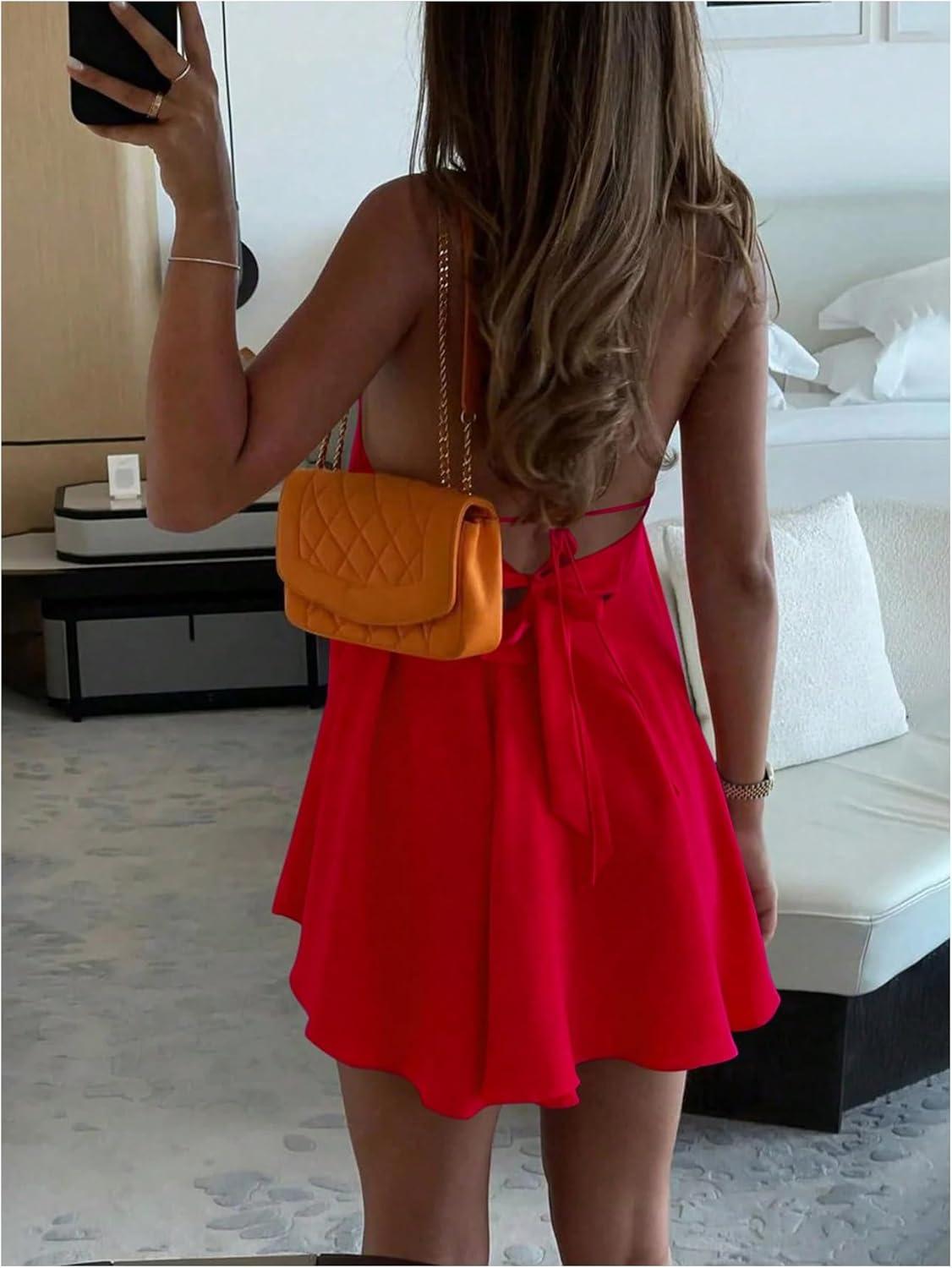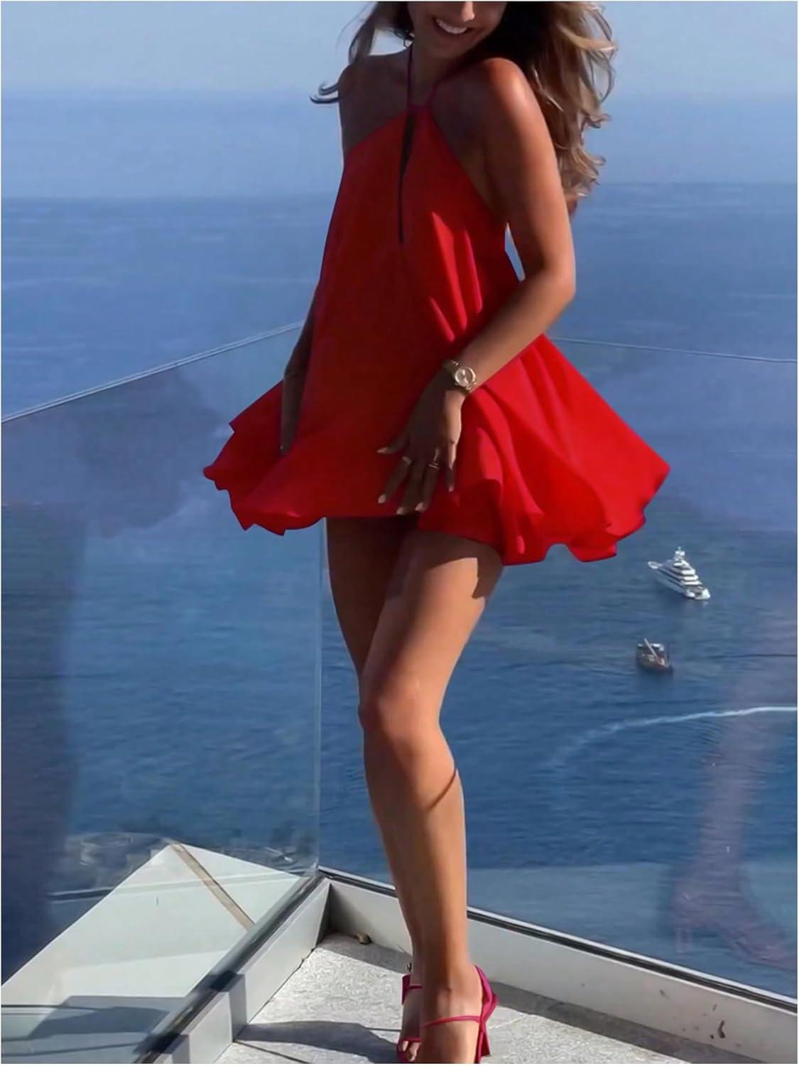 SOLY HUX Women’s Halter Neck Sleeveless Bow Tie Backless Flowy Mini Dress Beach Vacation Clothes(Solid Red)