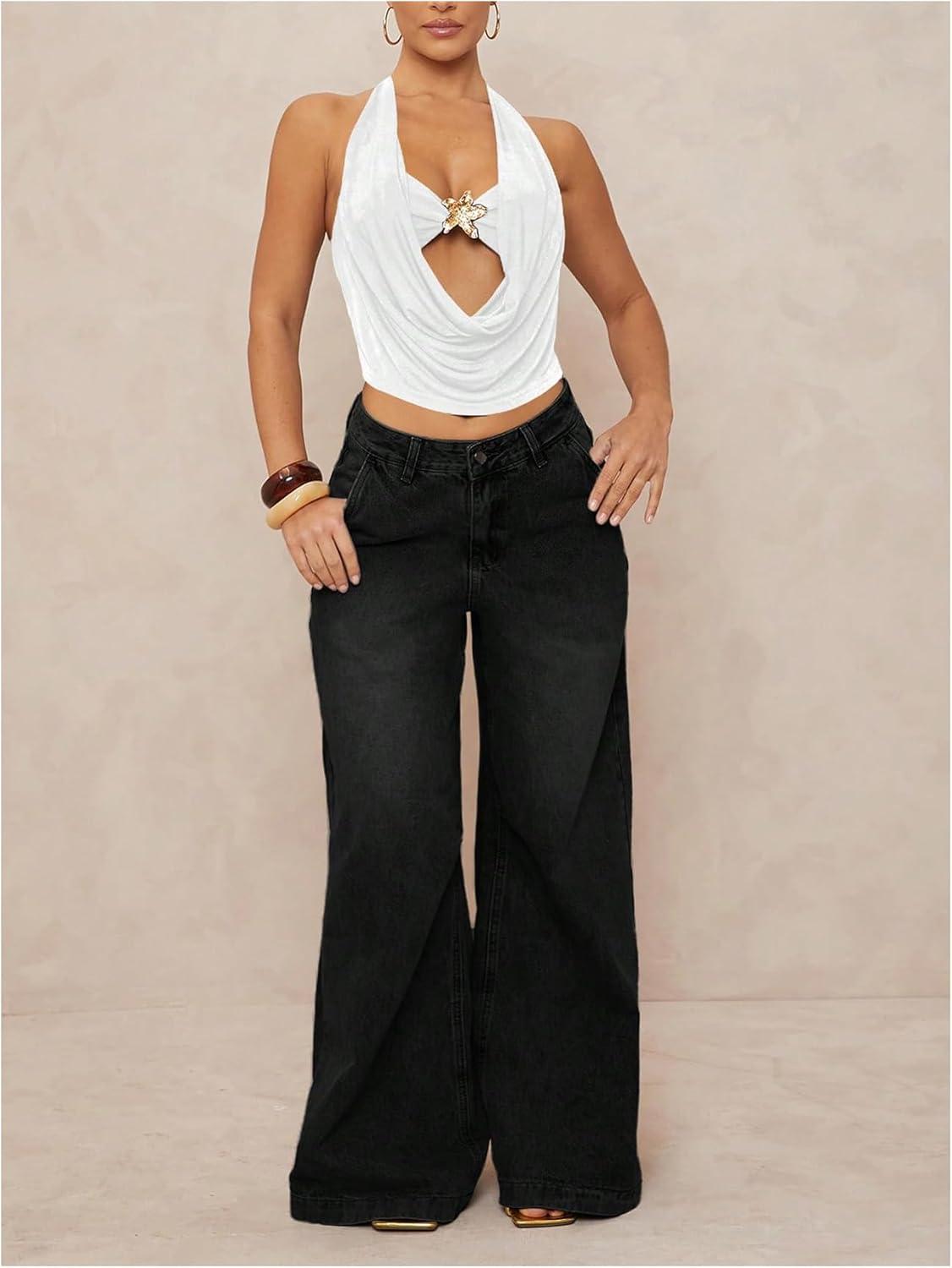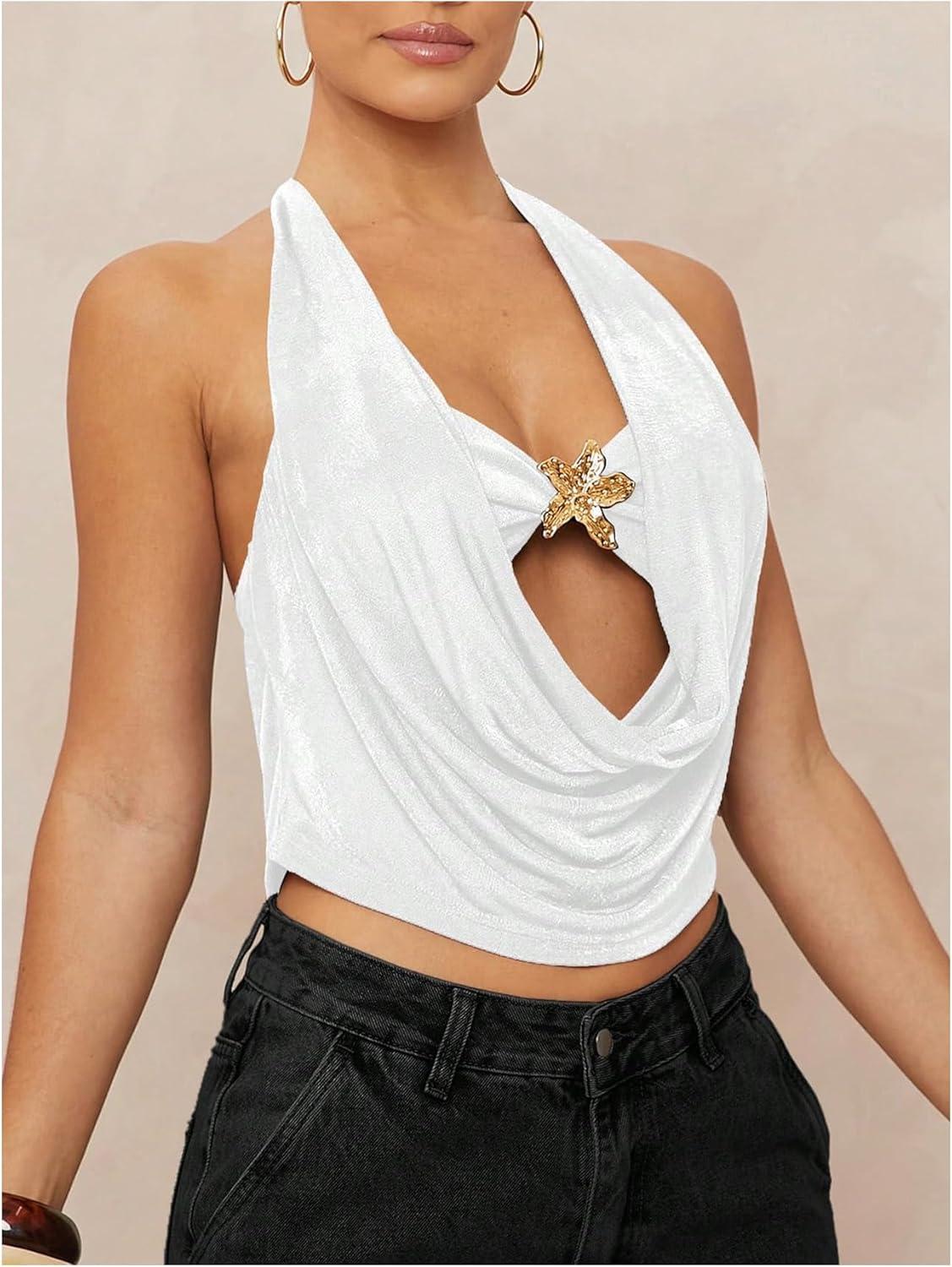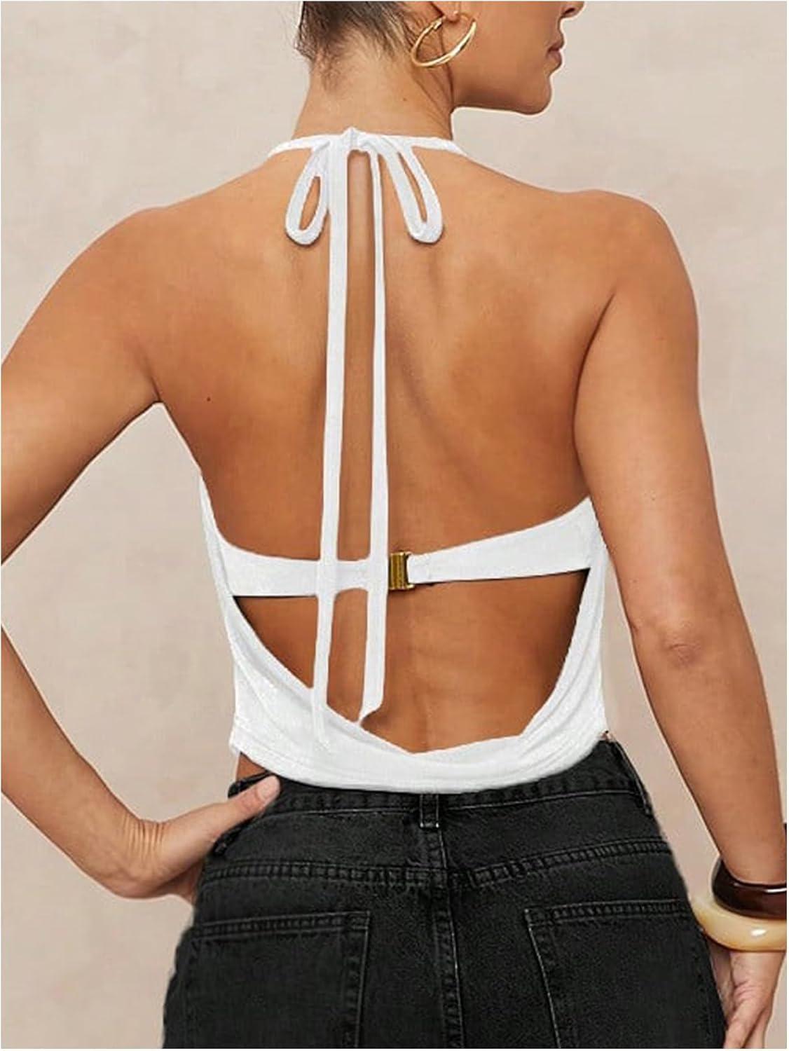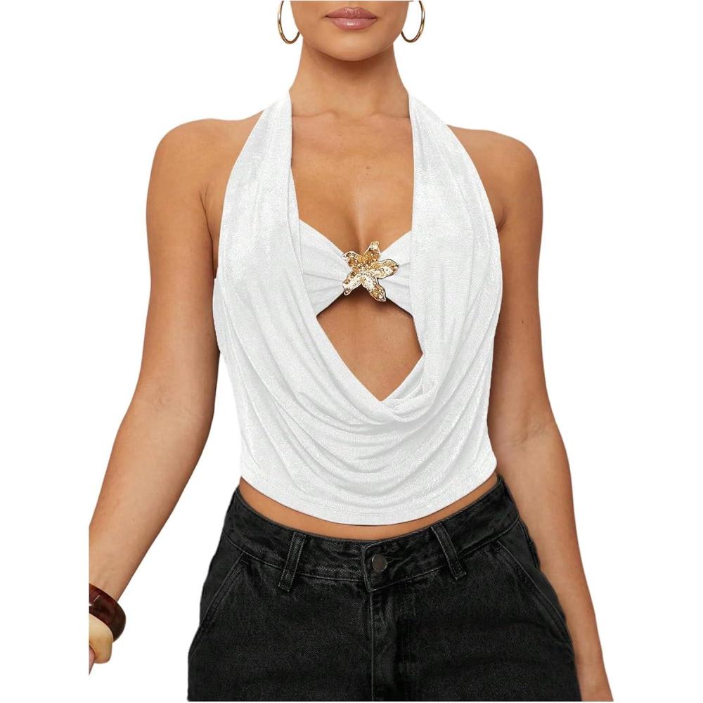 SOLY HUX Women’s Halter Top Cut Out Draped Front Sleeveless Tie Backless Crop Tank Tops(Solid White)