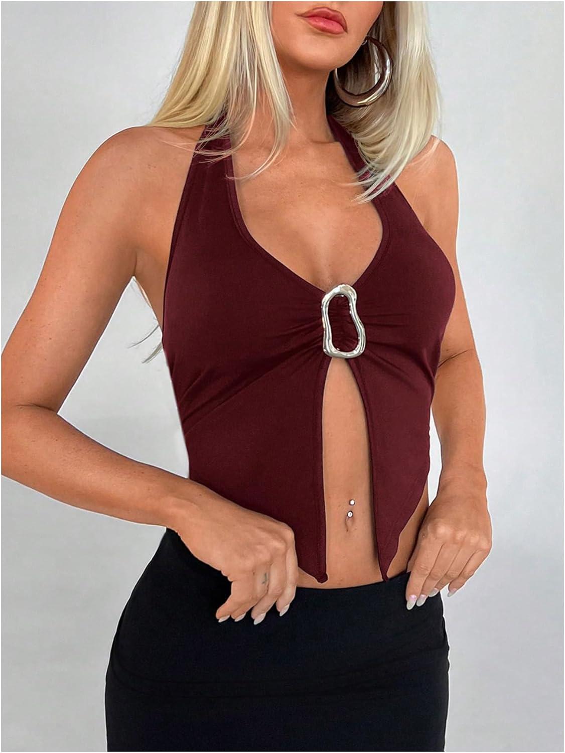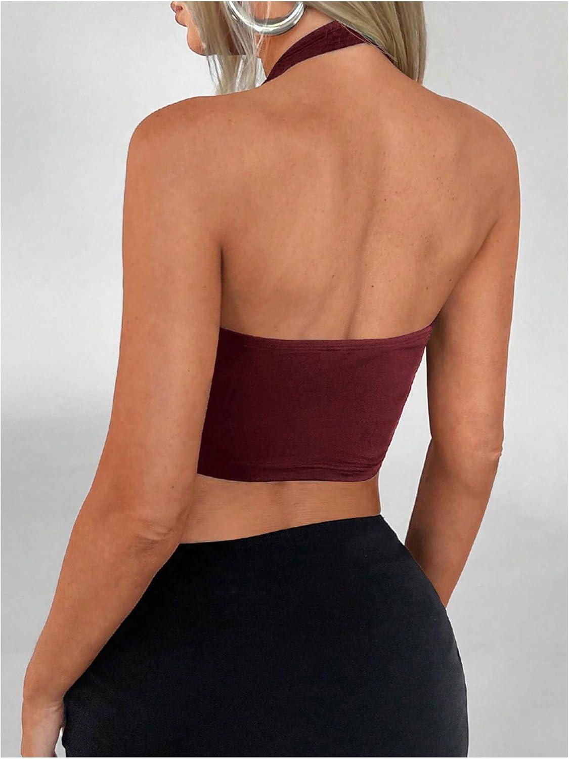 SOLY HUX Women’s Halter Top V Neck Sleeveless Split Hem Backless Y2k Crop Tank Tops(Solid Burgundy)