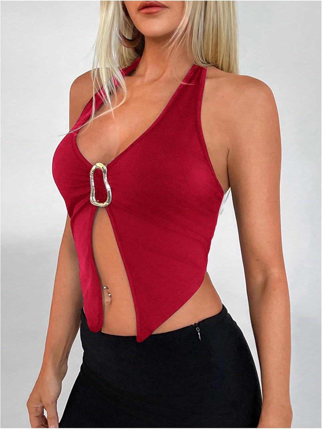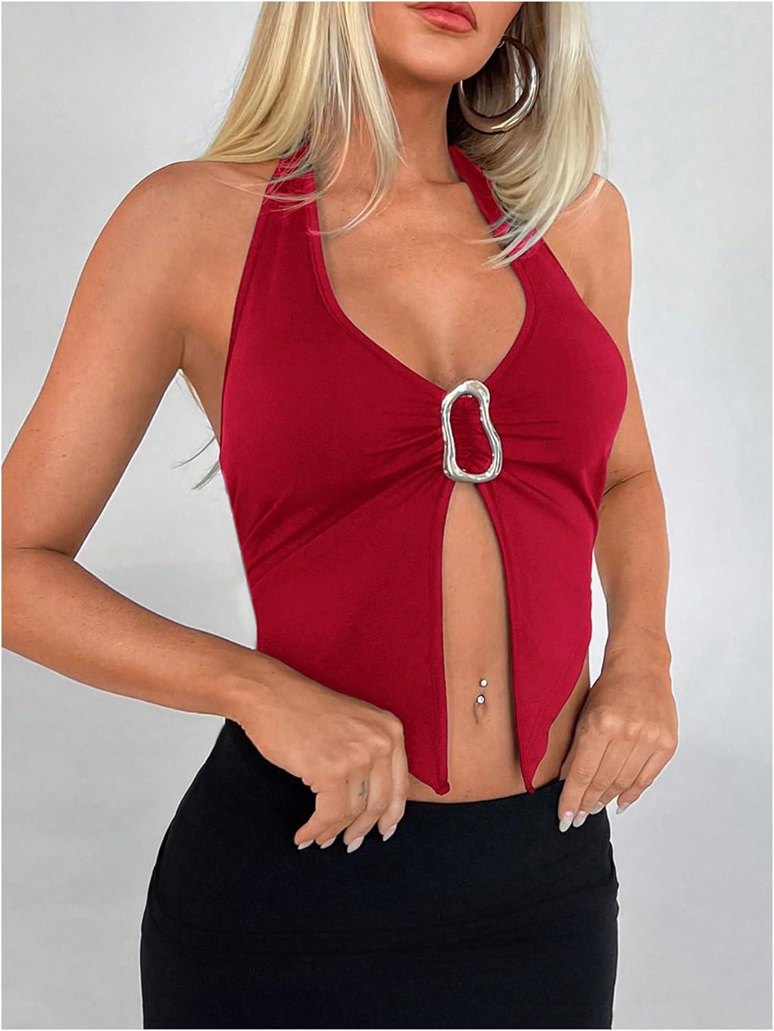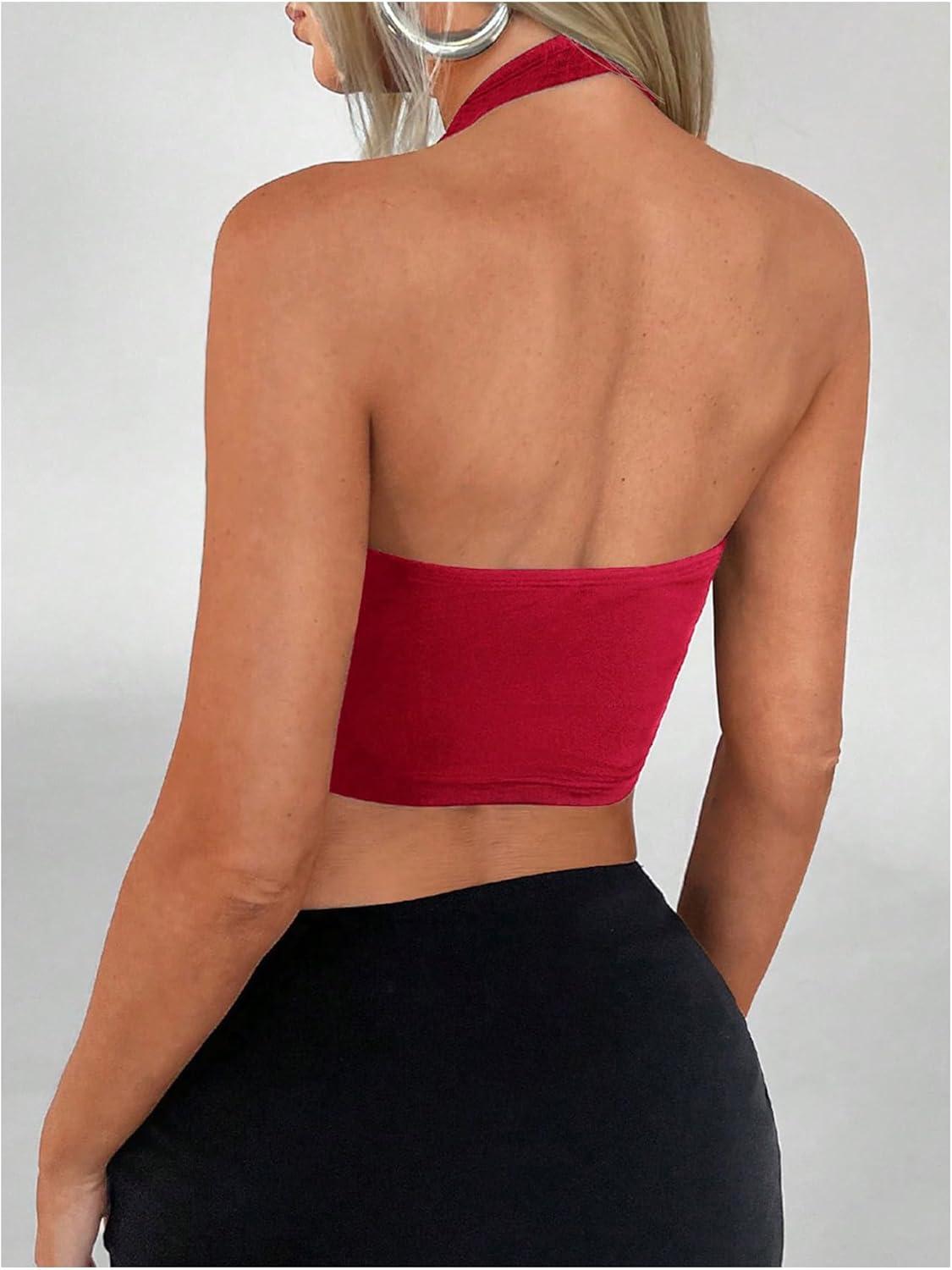 SOLY HUX Women’s Halter Top V Neck Sleeveless Split Hem Backless Y2k Crop Tank Tops(Solid Red)