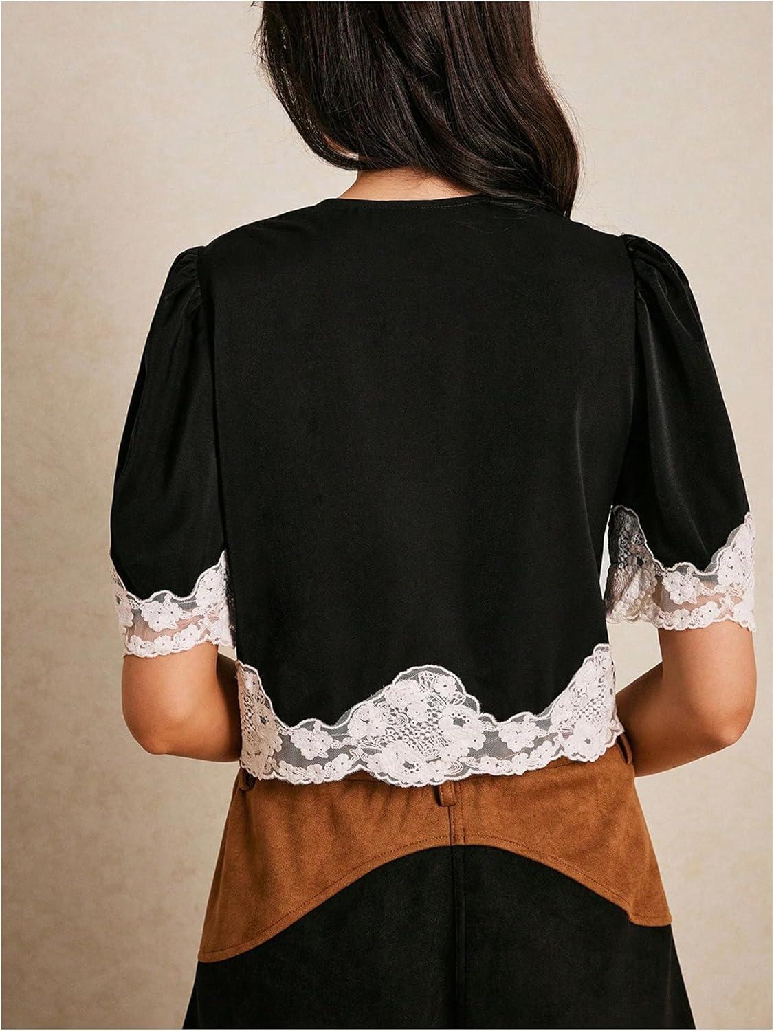 SOLY HUX Women’s Lace Crop Blouse Short Sleeve V Neck Button Down Shirts Elegant Tops(Black and White)