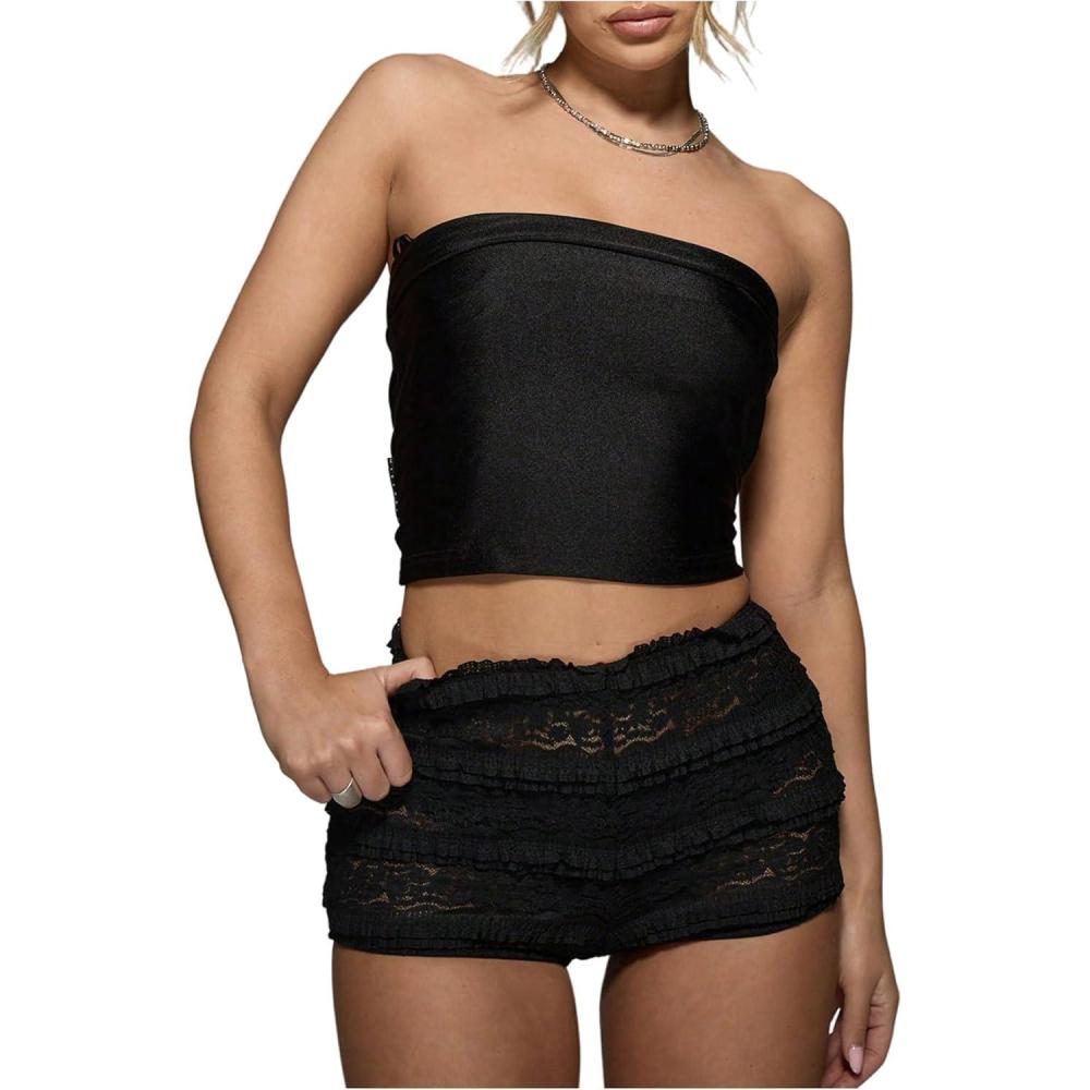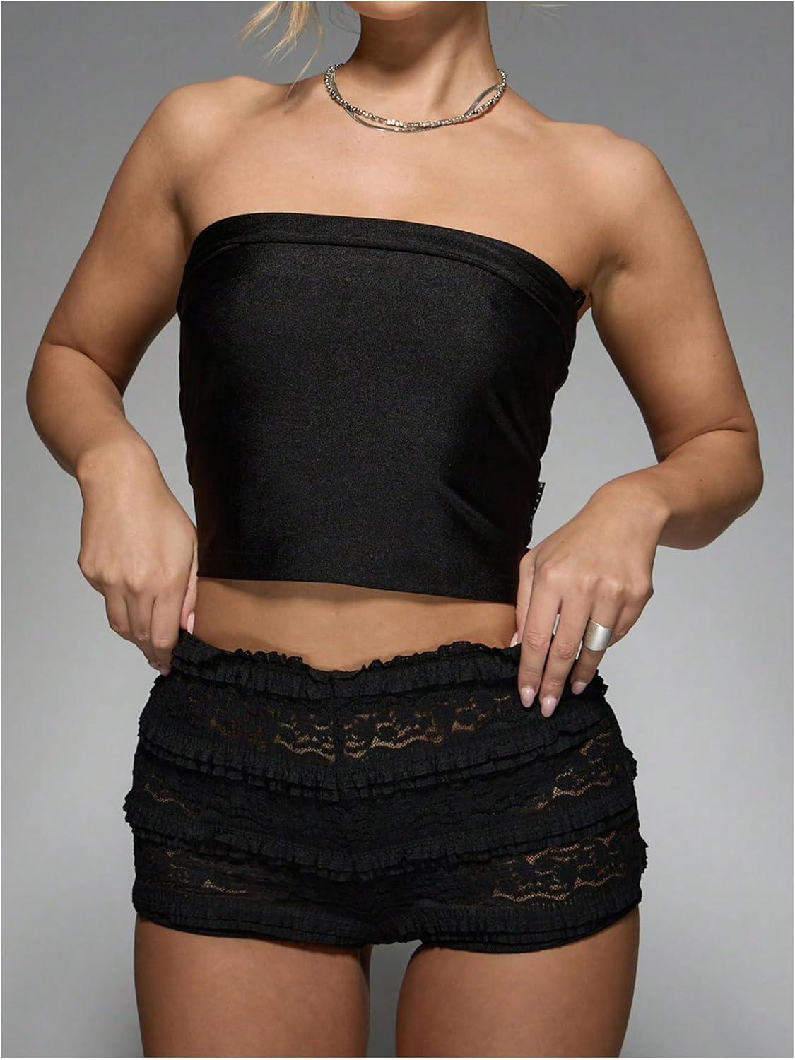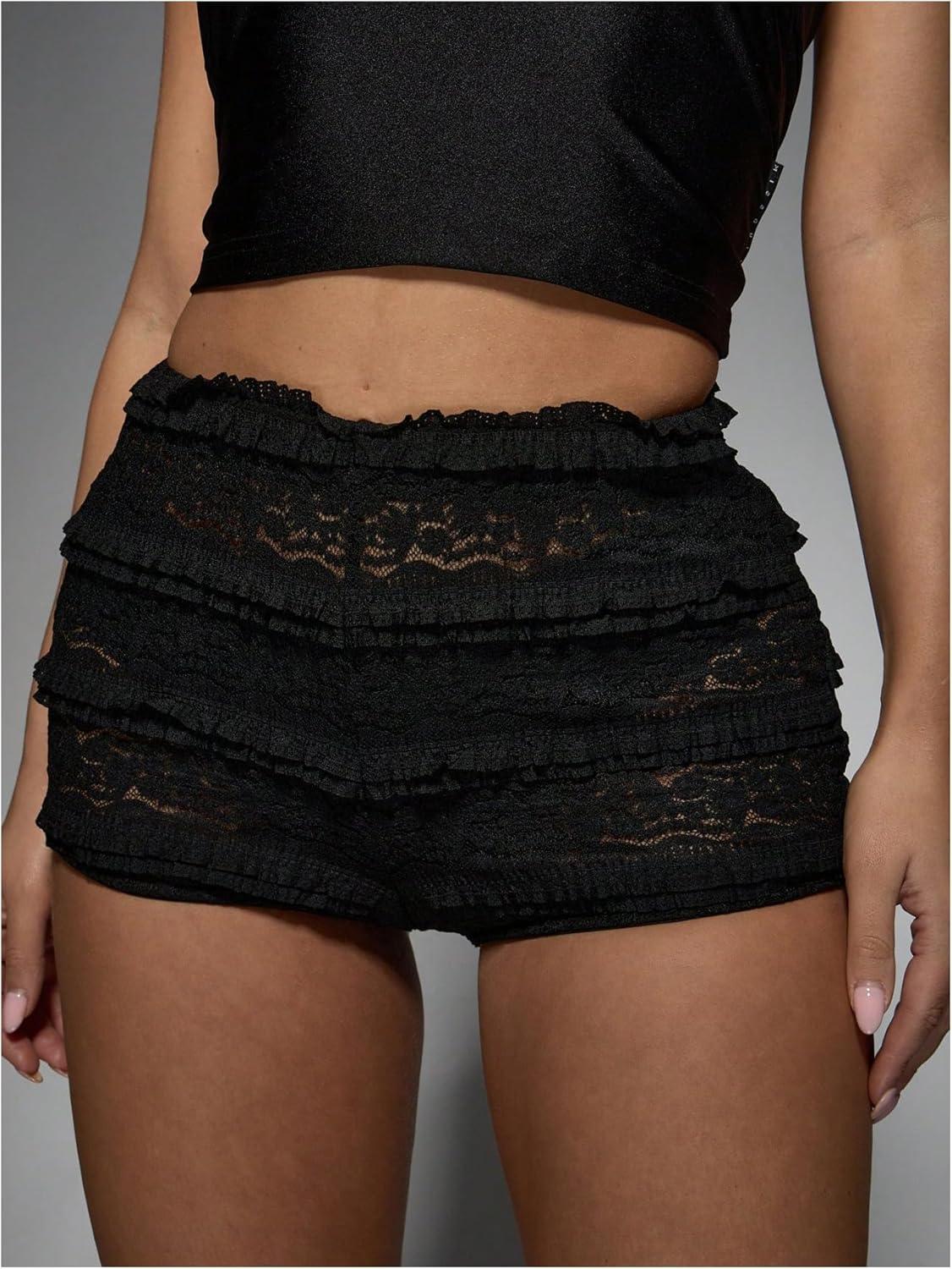 SOLY HUX Women’s Lace Ruffle Micro Shorts Y2k Elastic Low Rise Sheer Layered Mini Shorts Going Out Party Clubwear(Plain Black)