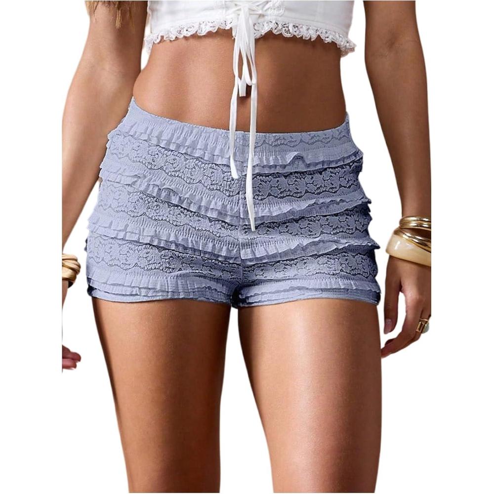 SOLY HUX Women’s Lace Ruffle Micro Shorts Y2k Elastic Low Rise Sheer Layered Mini Shorts Going Out Party Clubwear(Plain Light Blue)