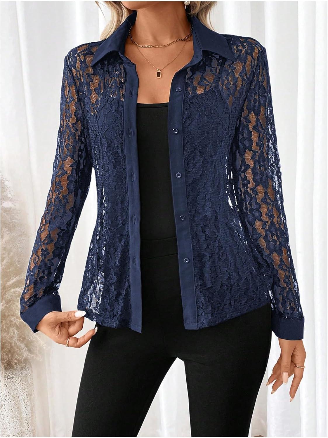 SOLY HUX Women’s Lace Sheer Button Down Blouse Long Sleeve Collared Shirts Old Money Outfits(Dark Blue)