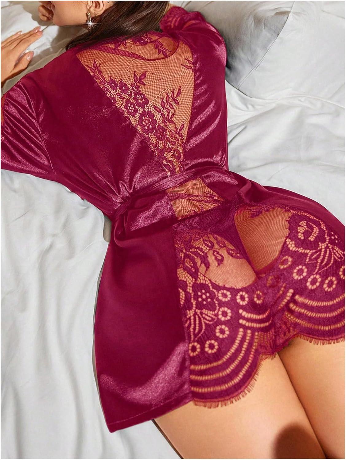SOLY HUX Women’s Lace Sheer Satin Robe Silk Kimono Bridesmaid Robes Sleepwear with Belted(Pure Burgundy)