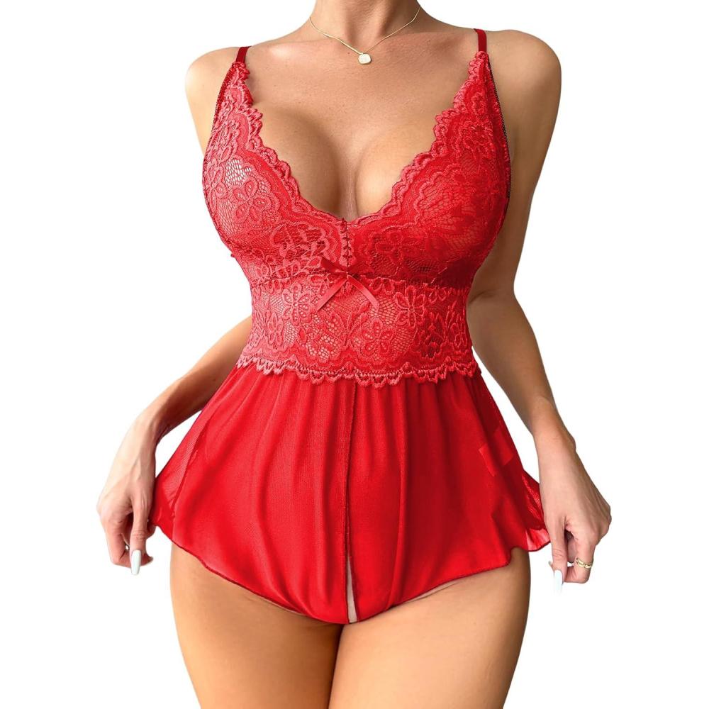 SOLY HUX Women’s Lace Teddy Lingerie Spaghetti Strap Bodysuit Babydoll Sleepwear(Solid Red)