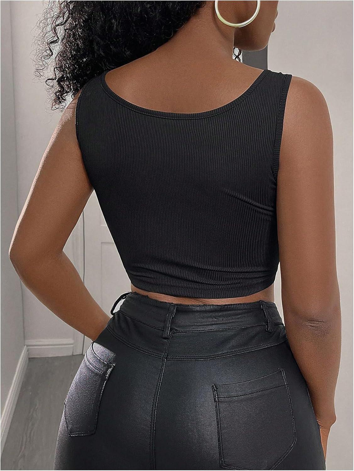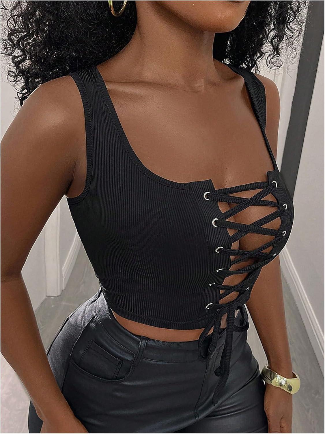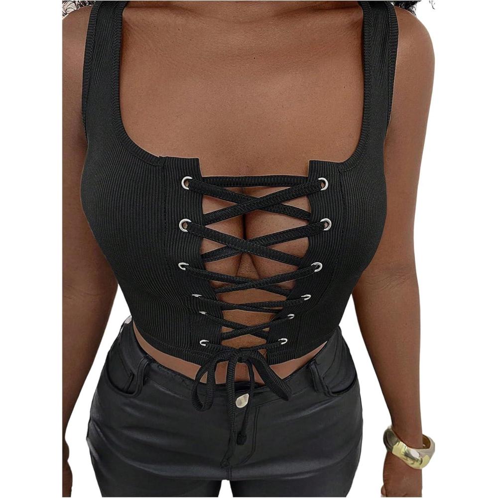 SOLY HUX Women’s Lace Up Crop Tank Tops Sleeveless Scoop Neck Ribbed Slim Fit Going Out Shirts(Plain Black)