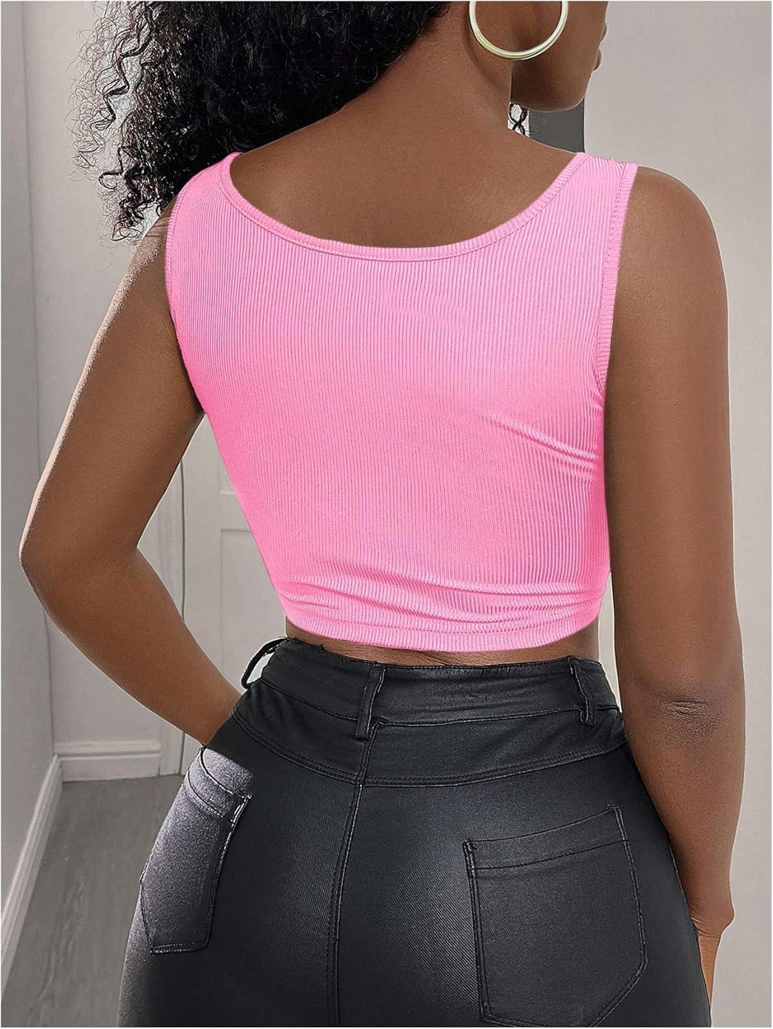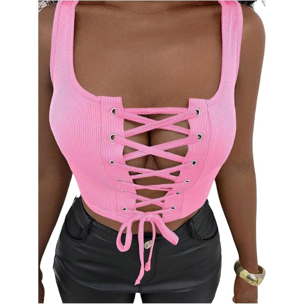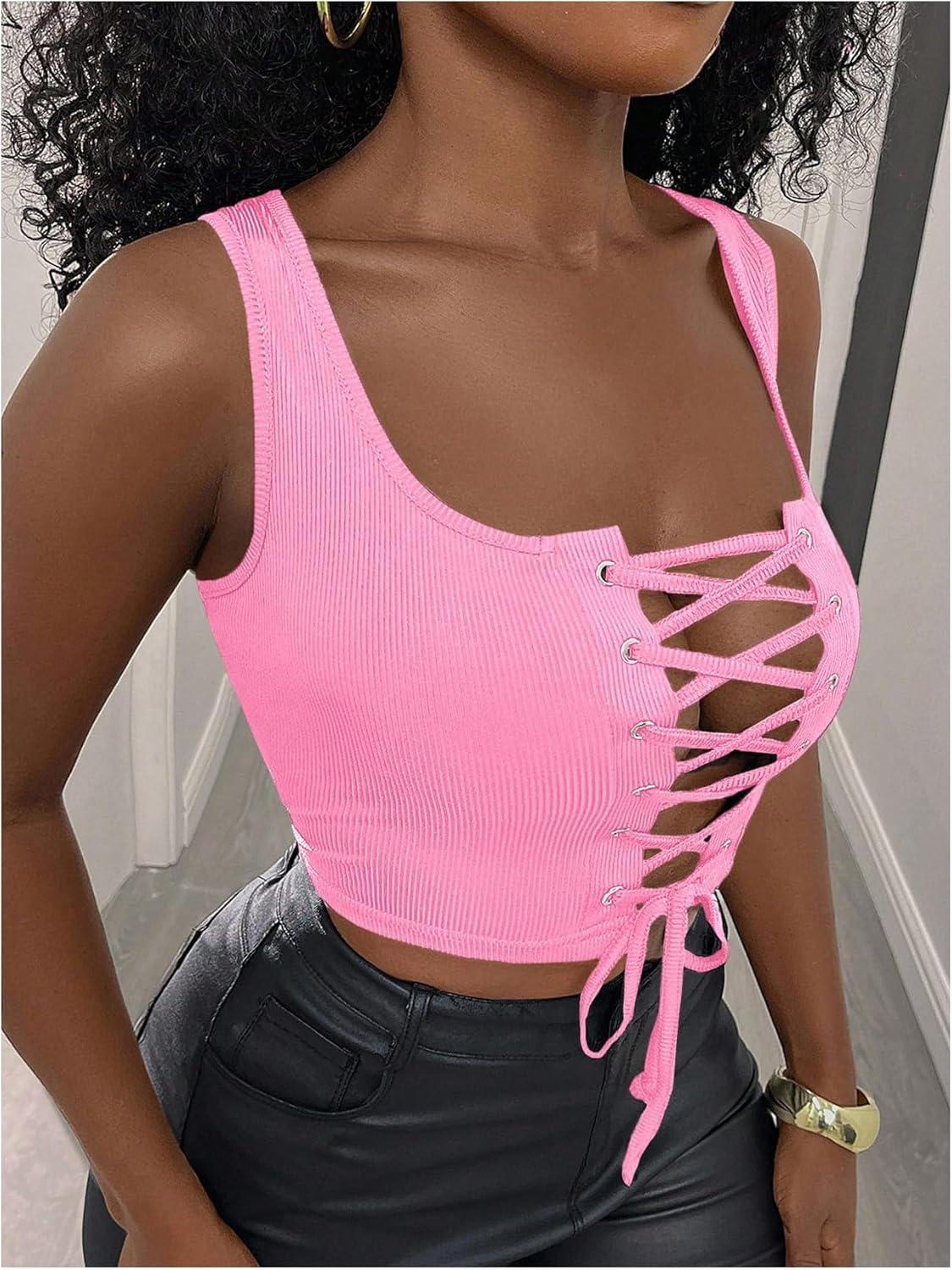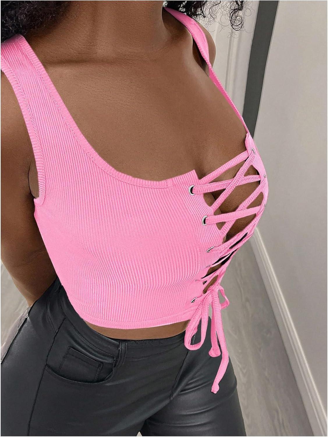 SOLY HUX Women’s Lace Up Crop Tank Tops Sleeveless Scoop Neck Ribbed Slim Fit Going Out Shirts(Plain Pink)