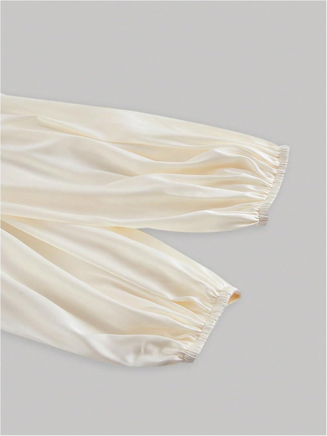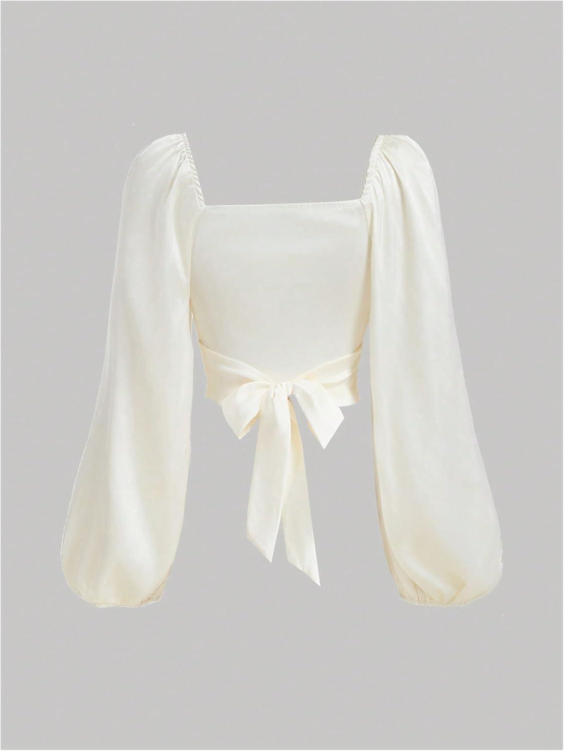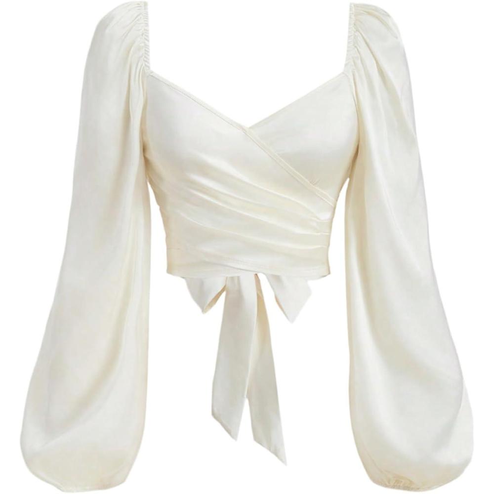 SOLY HUX Women’s Lantern Long Sleeve Wrap Ruched Bow Tie Blouse Sweetheart Neck Satin Going Out Crop Tops(Plain White)