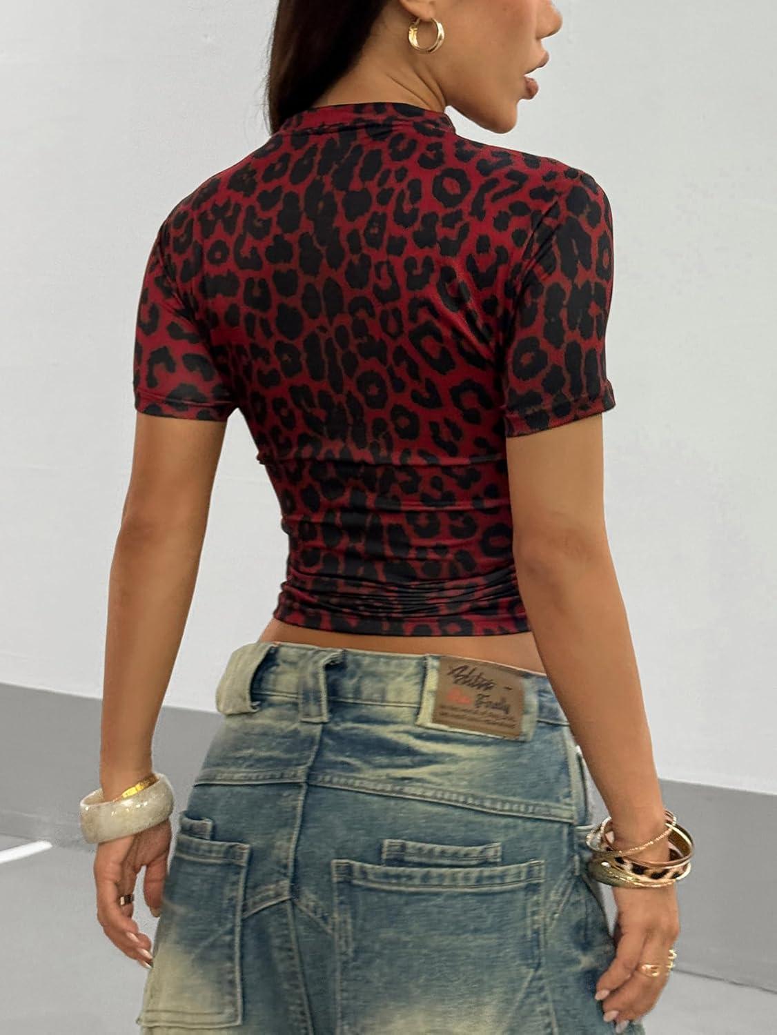 SOLY HUX Women’s Leopard Print Crop T-Shirt Short Sleeve Tight Fitted Y2k Tee Tops(Red Leopard)