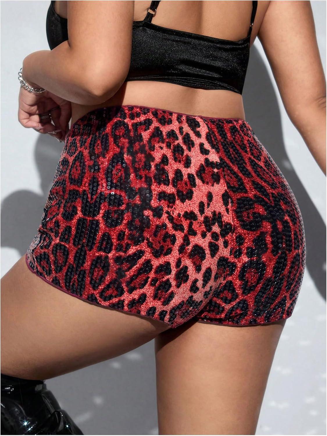 SOLY HUX Women’s Leopard Print Sparkly Sequin Shorts Y2k Low Rise Party Club Booty Shorts(Red Leopard)
