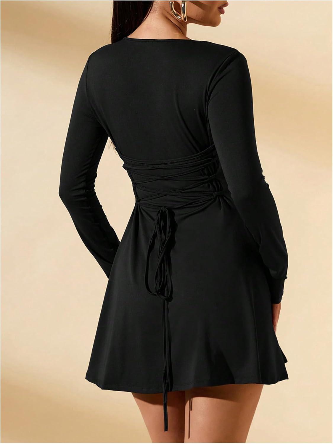 SOLY HUX Women’s Long Sleeve Mini Dress Elegant Lace Up Crew Neck Work Office Dresses(Plain Black)