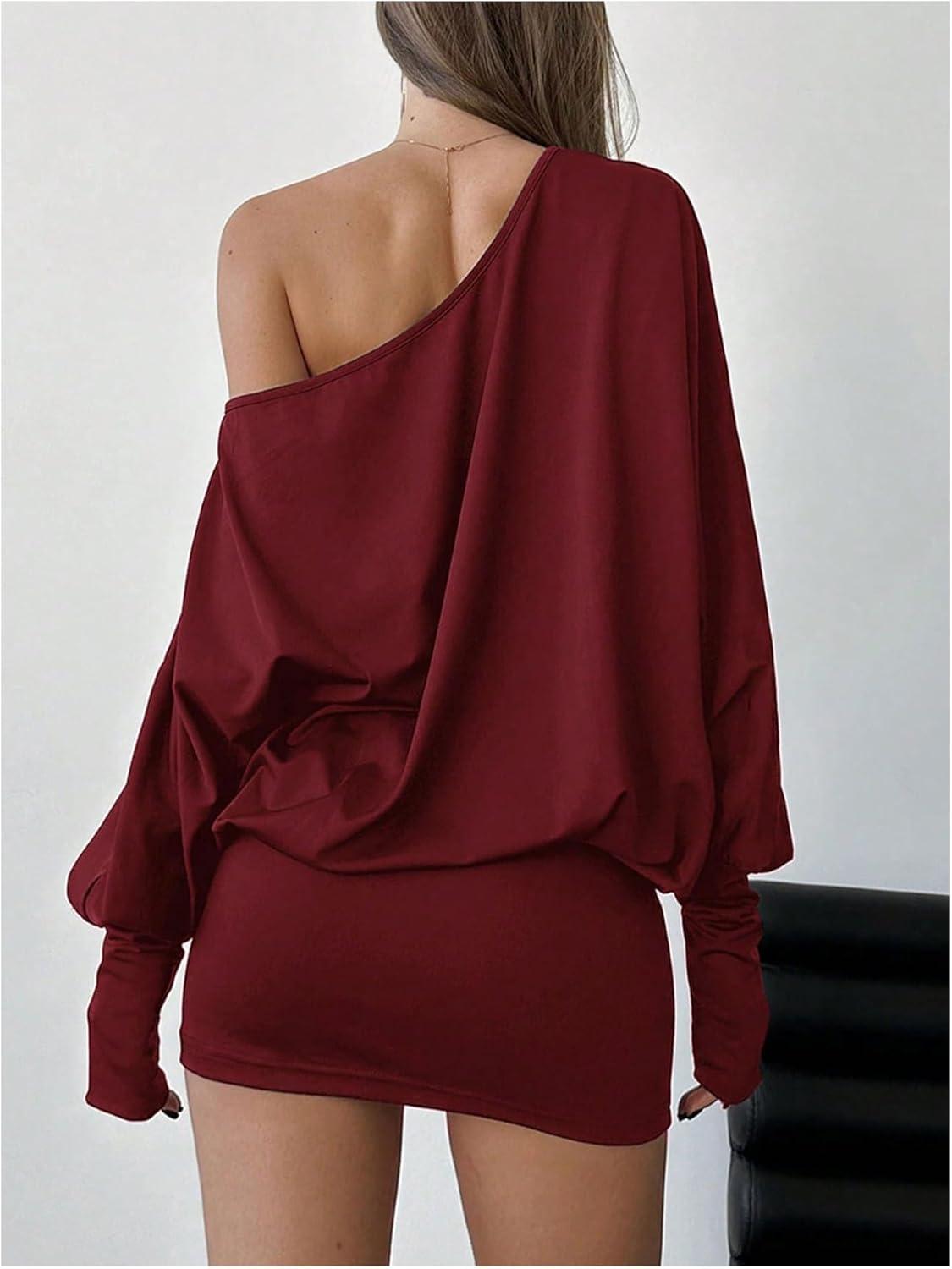SOLY HUX Women’s Long Sleeve Off The Shoulder Dress Y2k Mini Dress Streetwear Music Festival Outfits(Plain Burgundy)