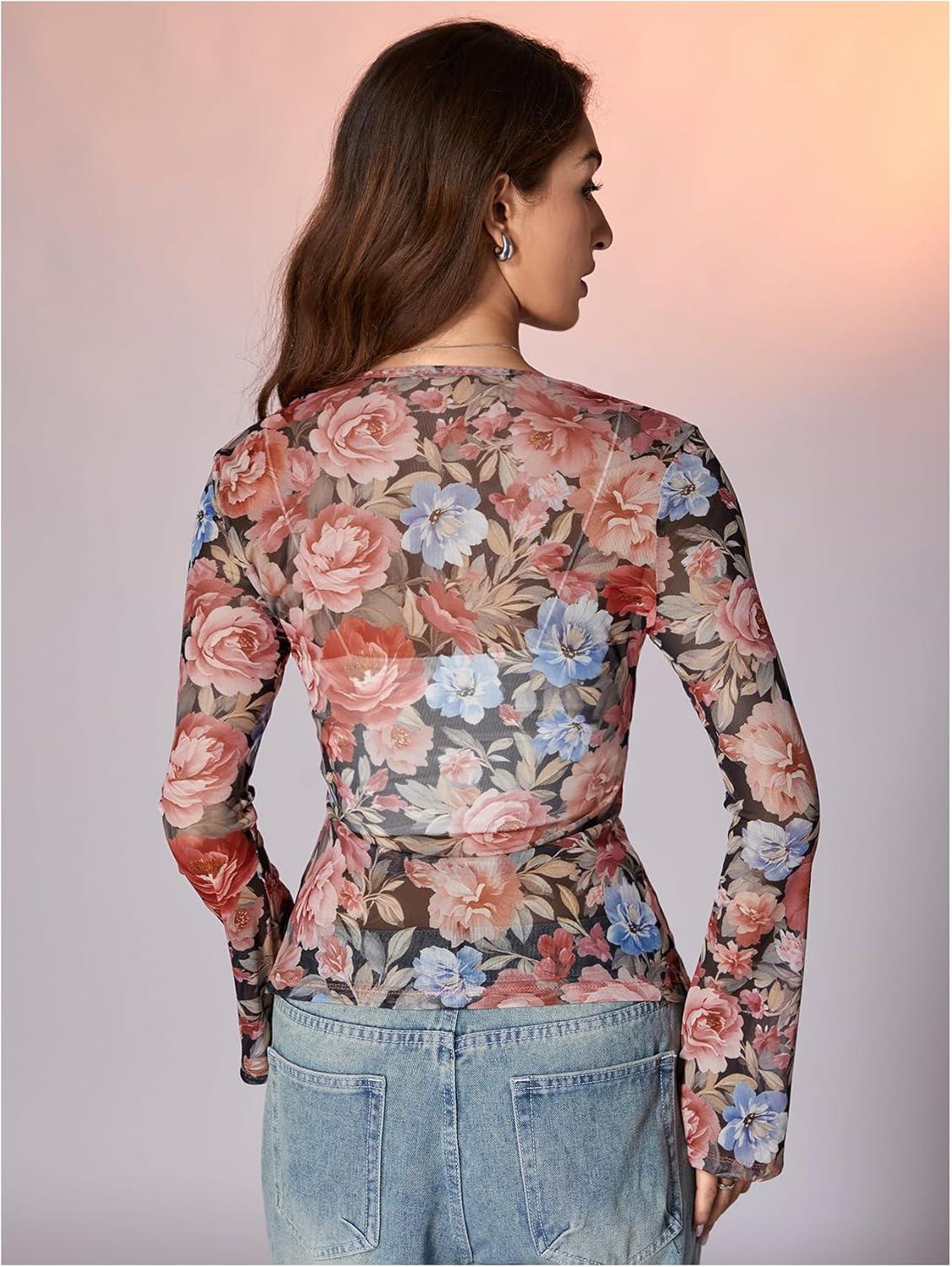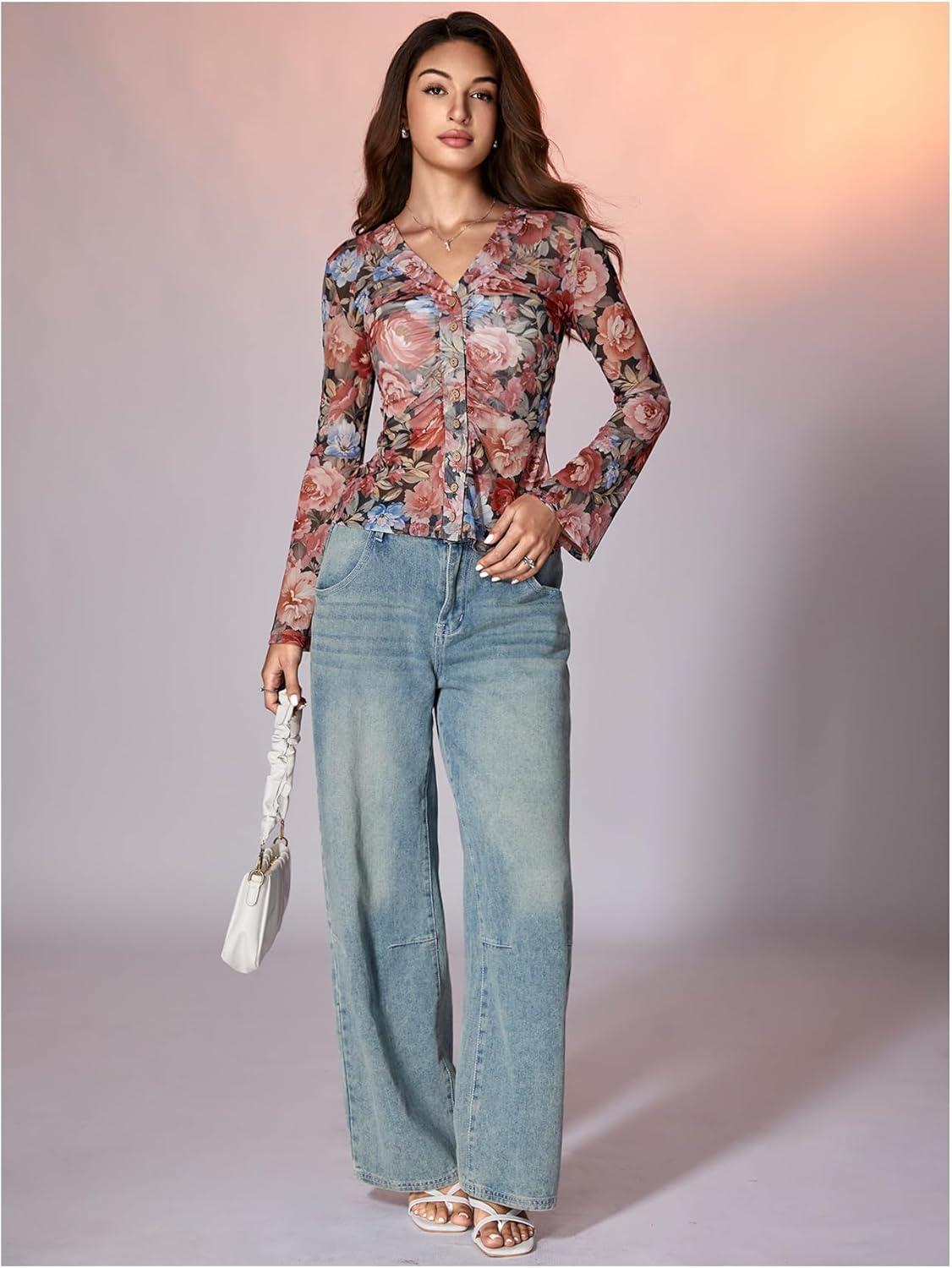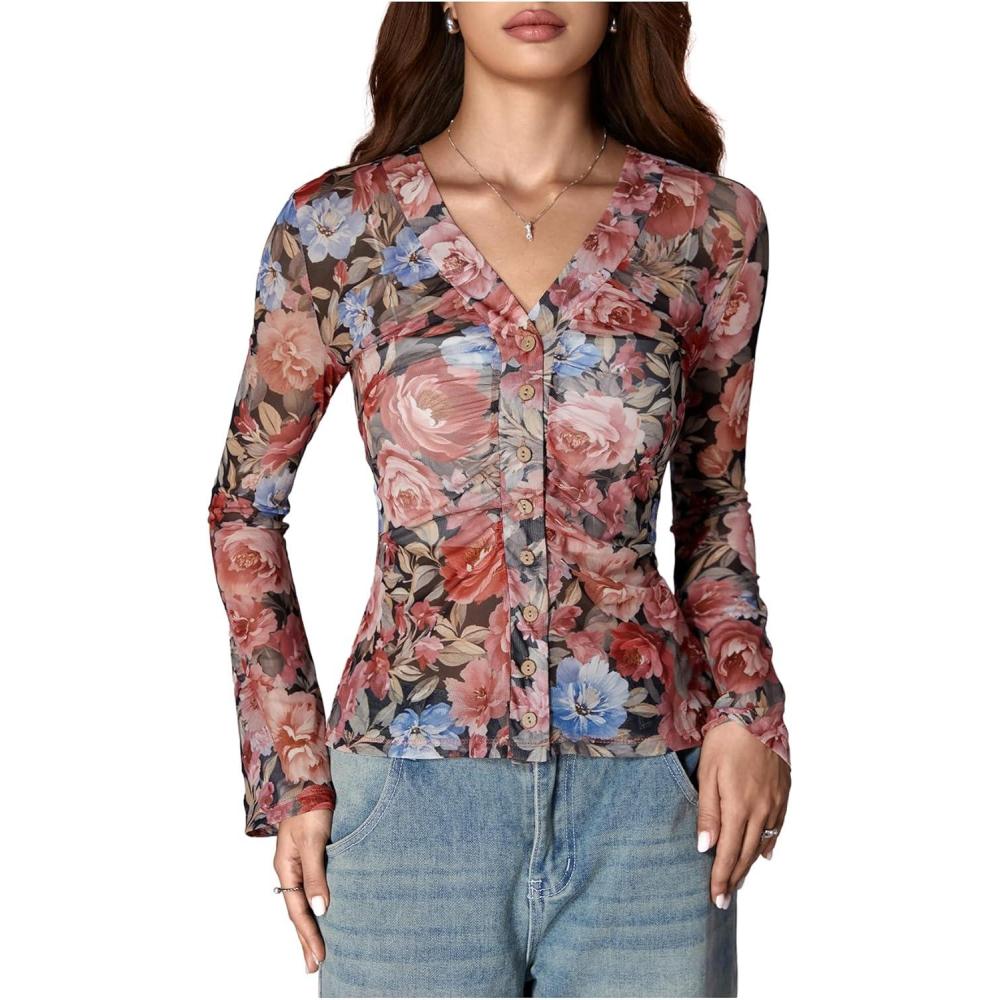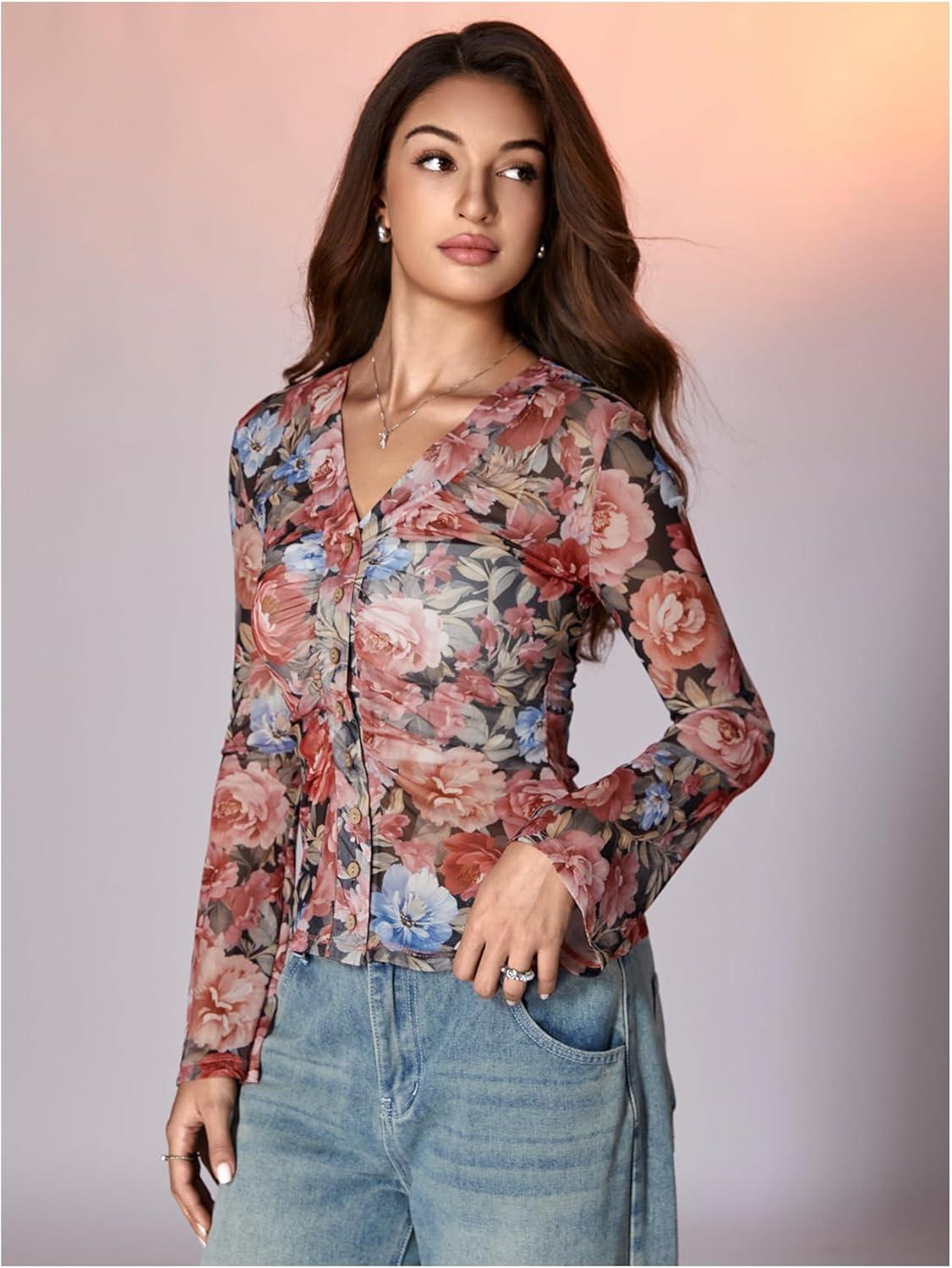 SOLY HUX Women’s Long Sleeve Shirts Boho Floral Print Blouses Button Down V Neck Fitted Tops(Multi Floral)