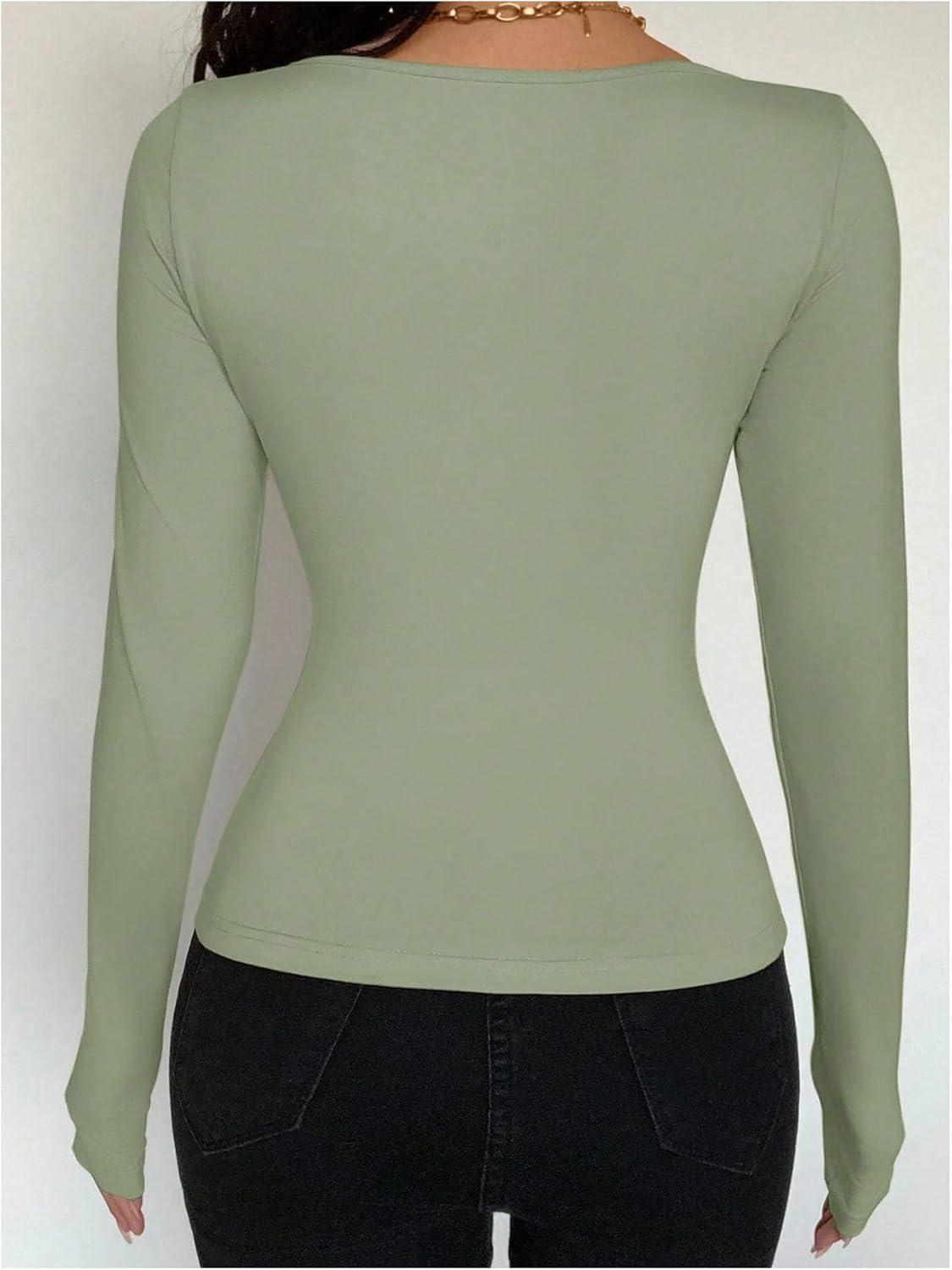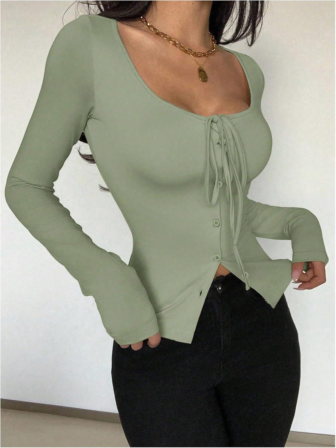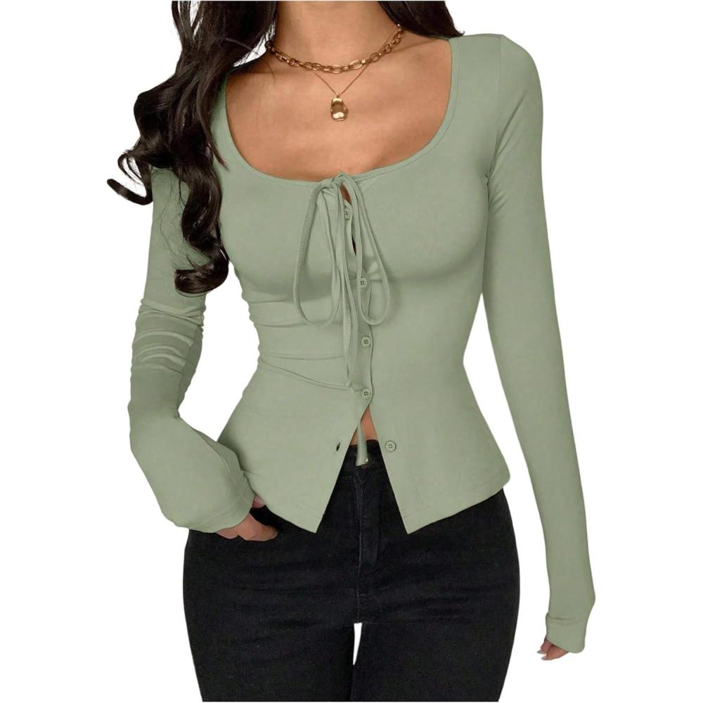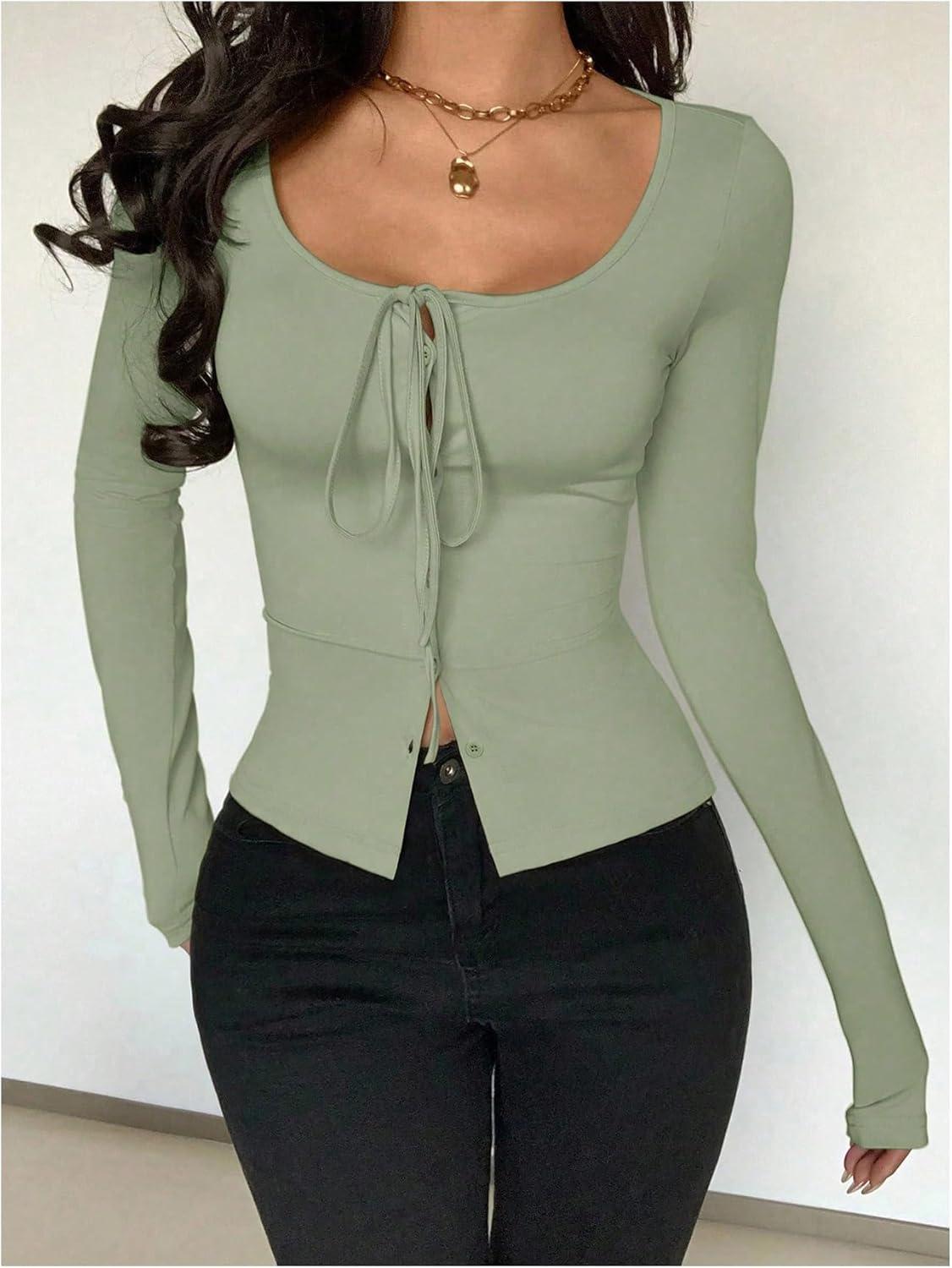 SOLY HUX Women’s Long Sleeve Shirts Bow Tie Button Down Scoop Neck T-Shirt Aesthetic Going Out Tops(Plain Green)