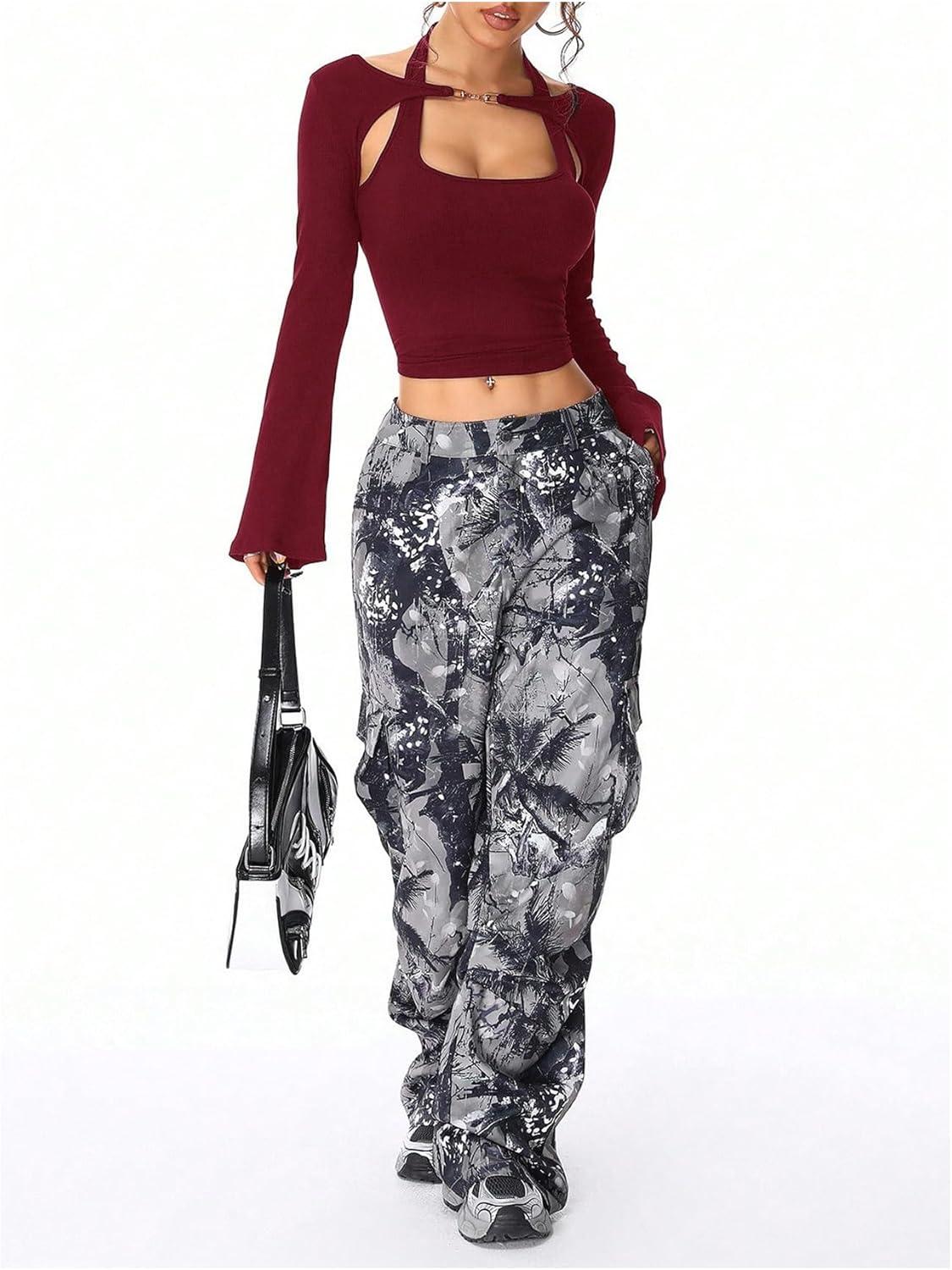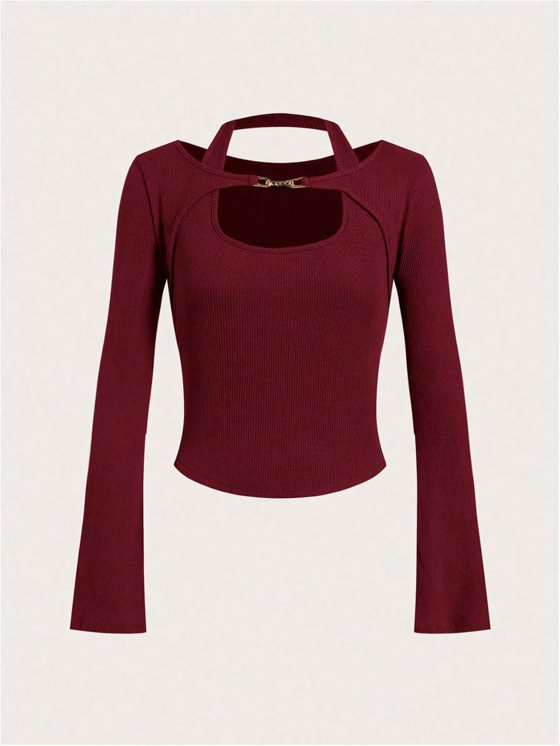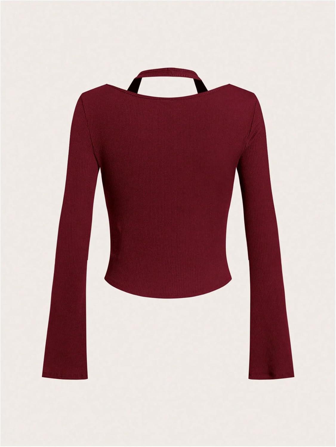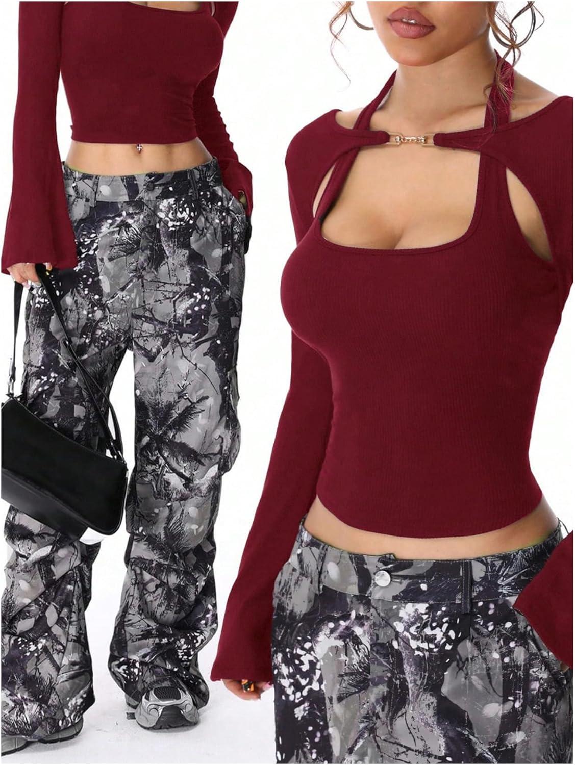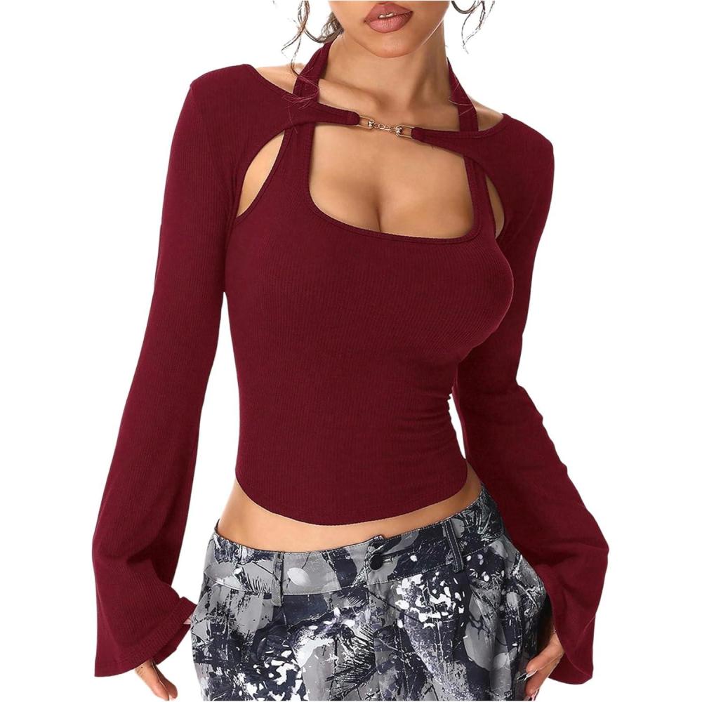 SOLY HUX Women’s Long Sleeve Shirts Y2k Crop Tops Halter Neck Fitted T-Shirt Going Out Tees(Pure Burgundy)