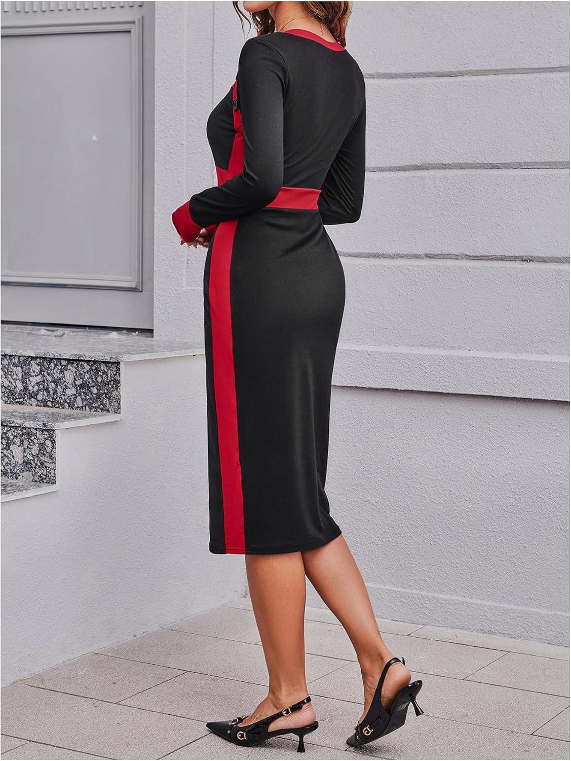 SOLY HUX Women’s Long Sleeve Square Neck Bodycon Elegant Midi Dress Pencil Cocktail Party Dresses(Burgundy and White)