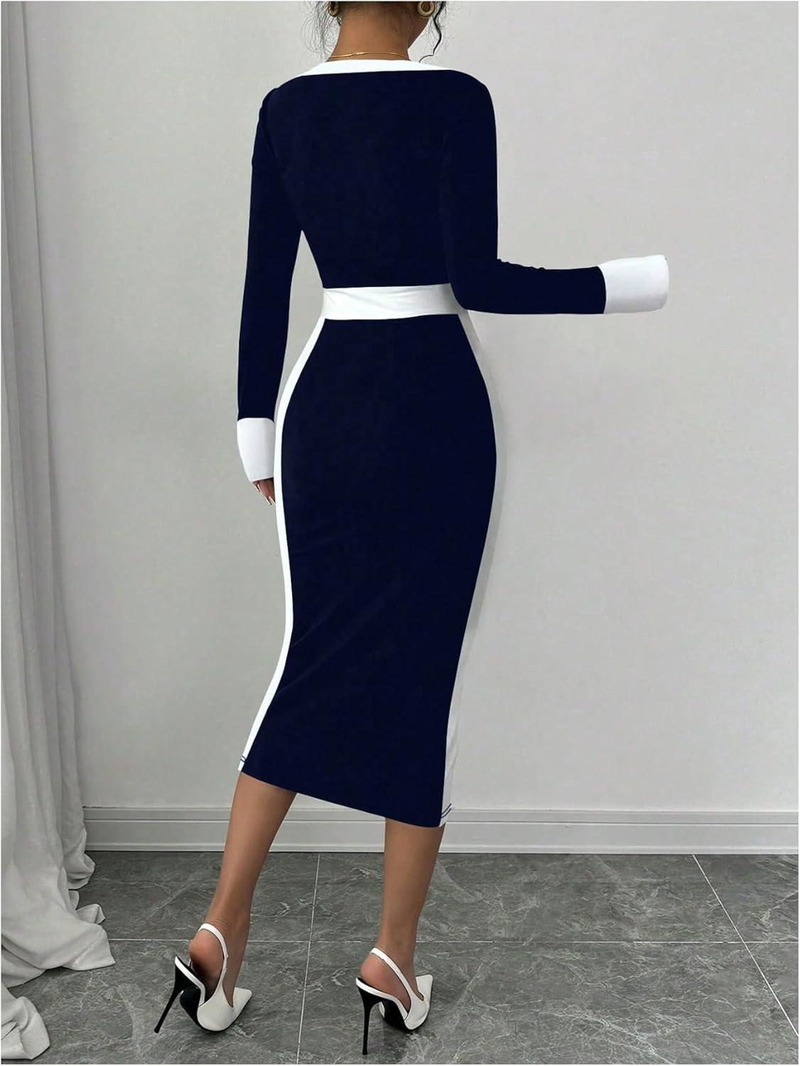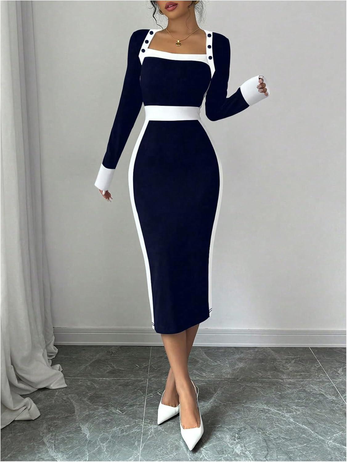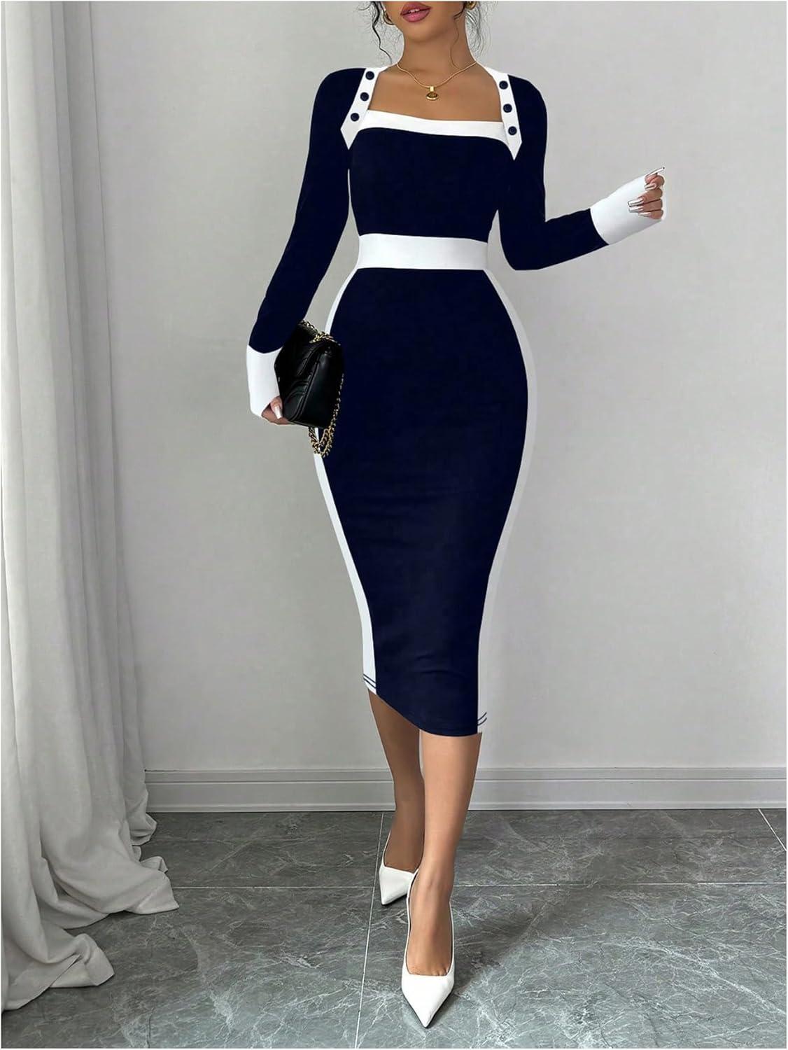 SOLY HUX Women’s Long Sleeve Square Neck Bodycon Elegant Midi Dress Pencil Cocktail Party Dresses(Dark Blue and White)
