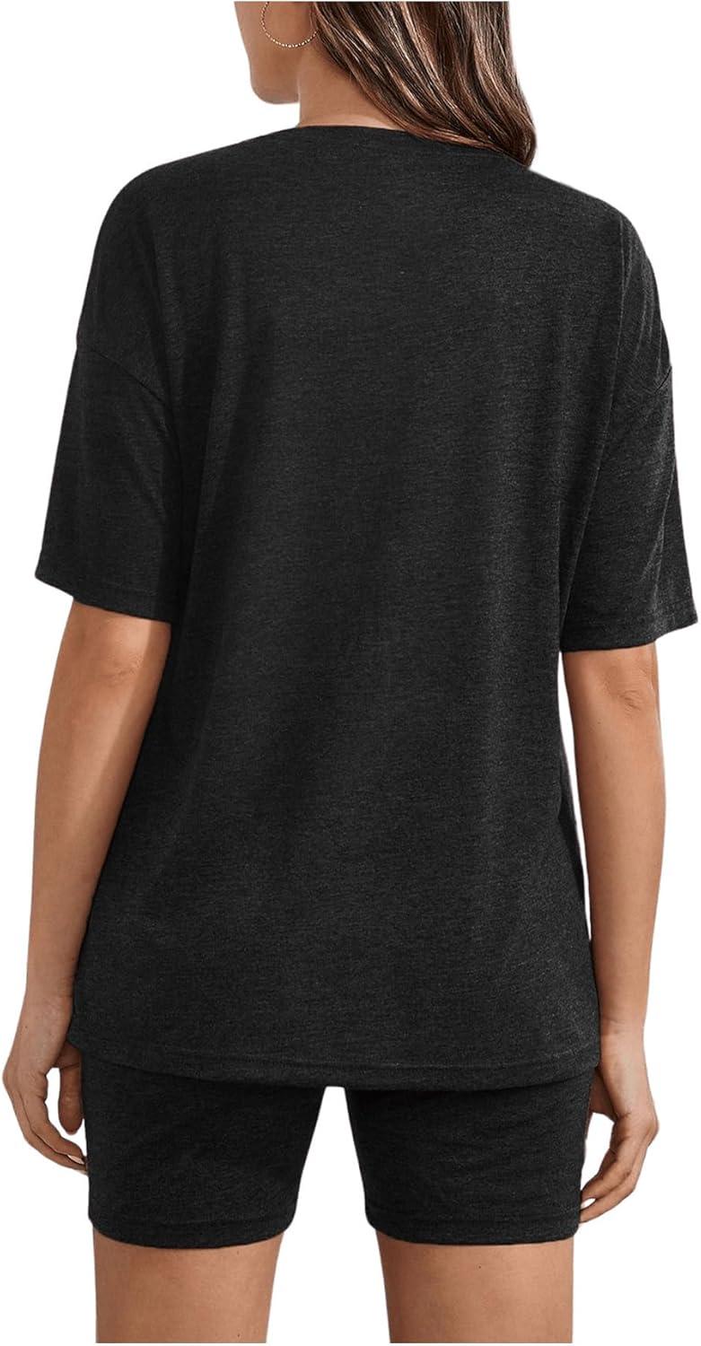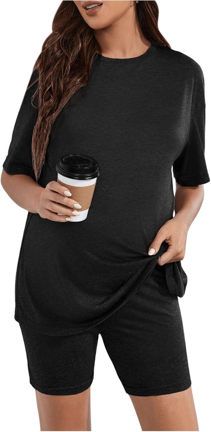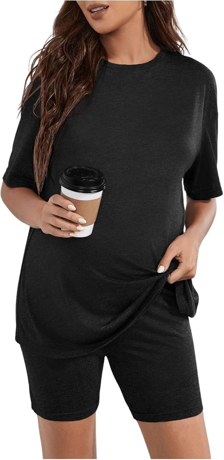 SOLY HUX Women’s Maternity Sets 2 Piece Pajamas Outfits Short Sleeve Top and Adjustable Elastic Waist Shorts(Black)