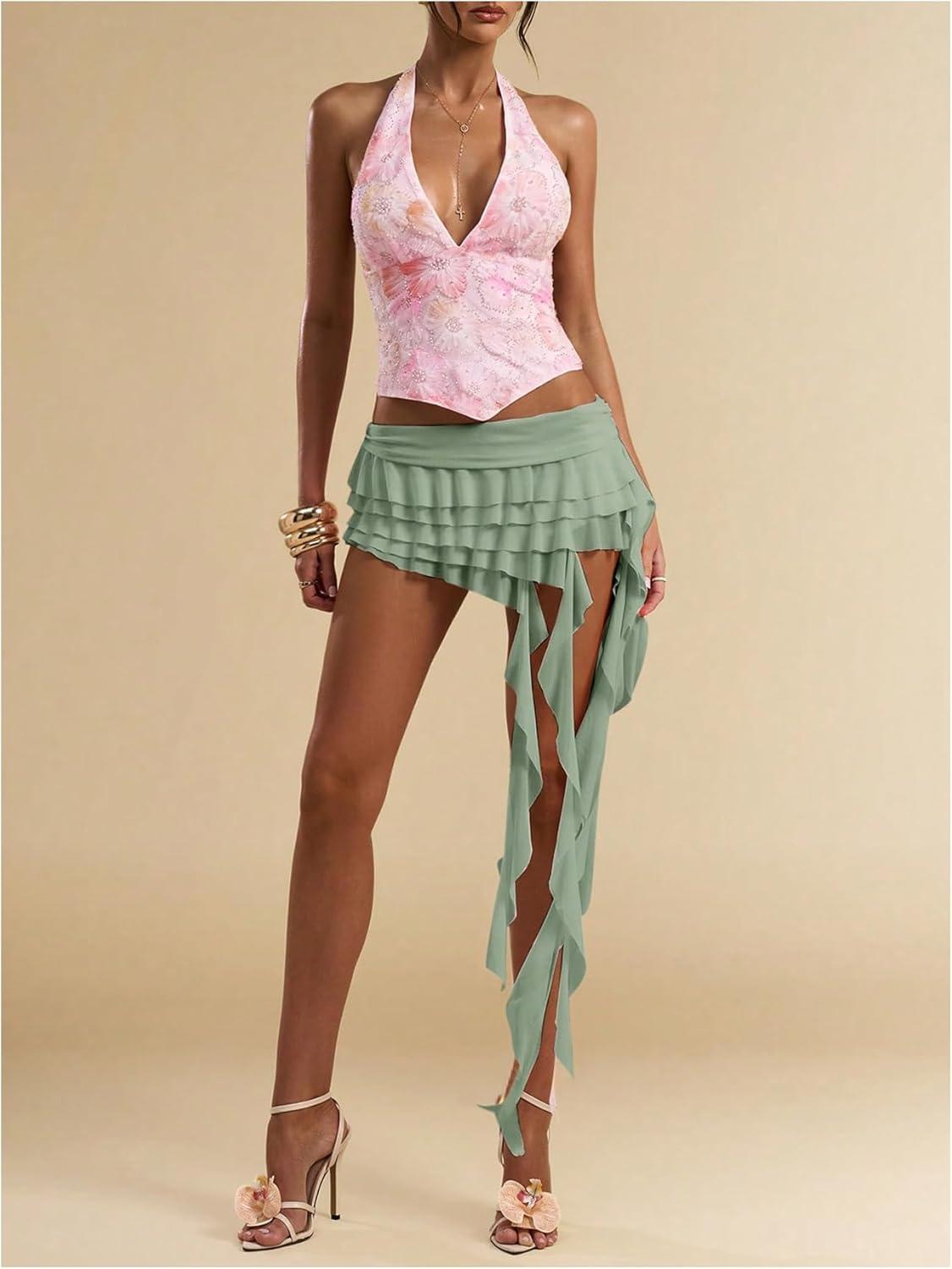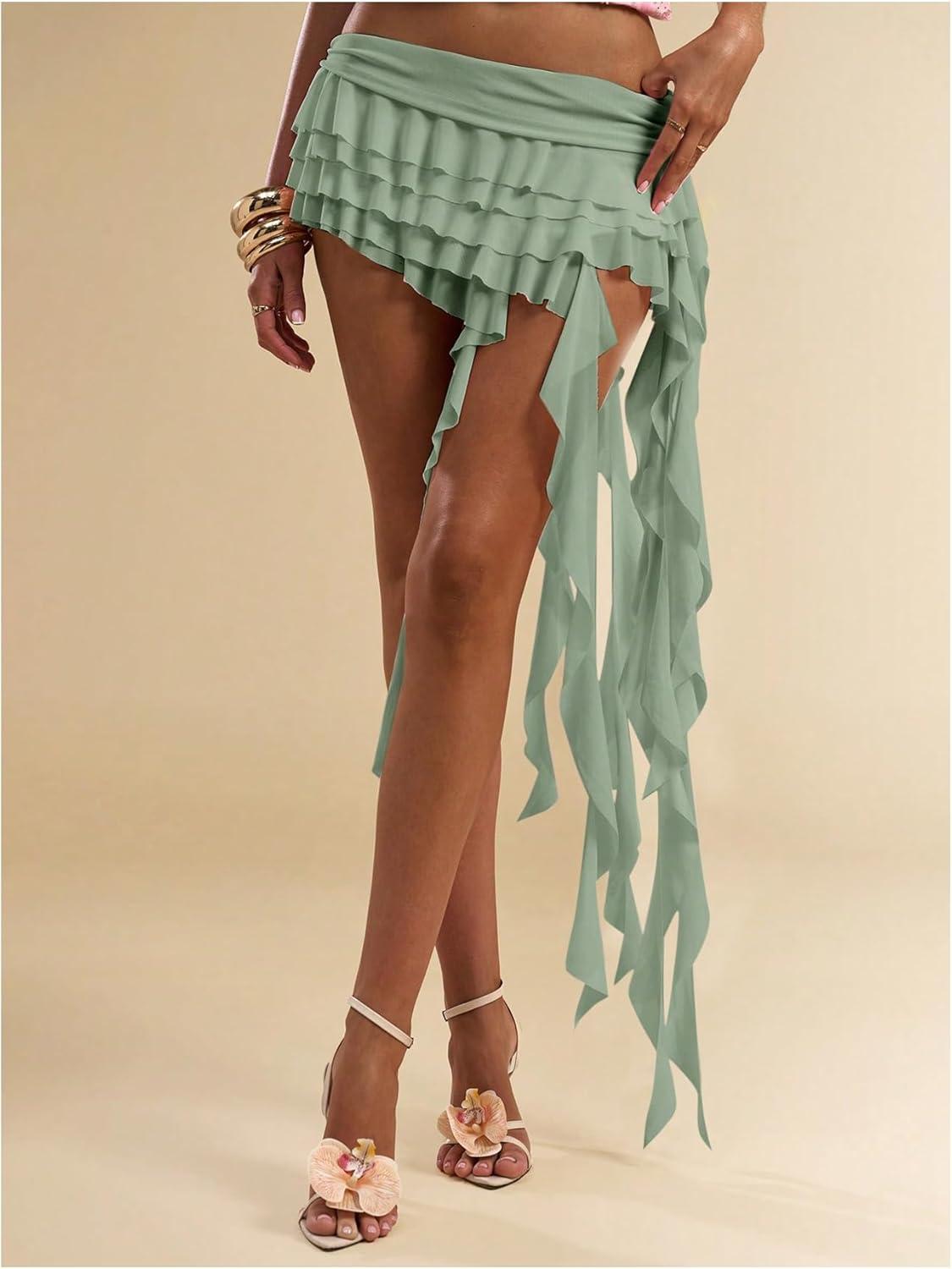 SOLY HUX Women’s Mesh Irregular Ruffle Trim Layered Y2k Mini Skirt Concert Music Festival Date Outfits(Mint Green)
