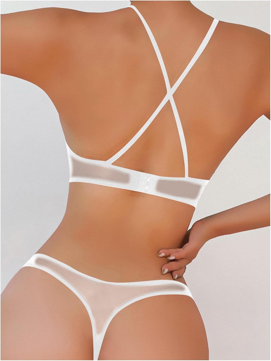 SOLY HUX Women’s Mesh Solid Sheer See Through Lingerie Set Sexy Lace Bra and Panty 2 Piece(Solid White)