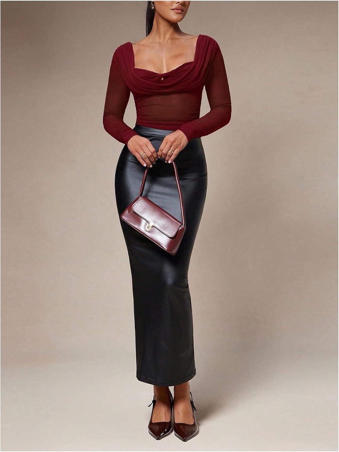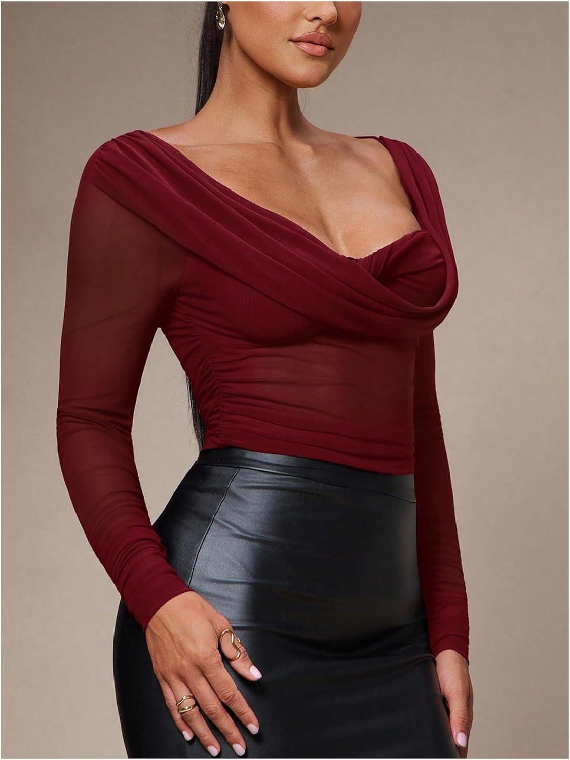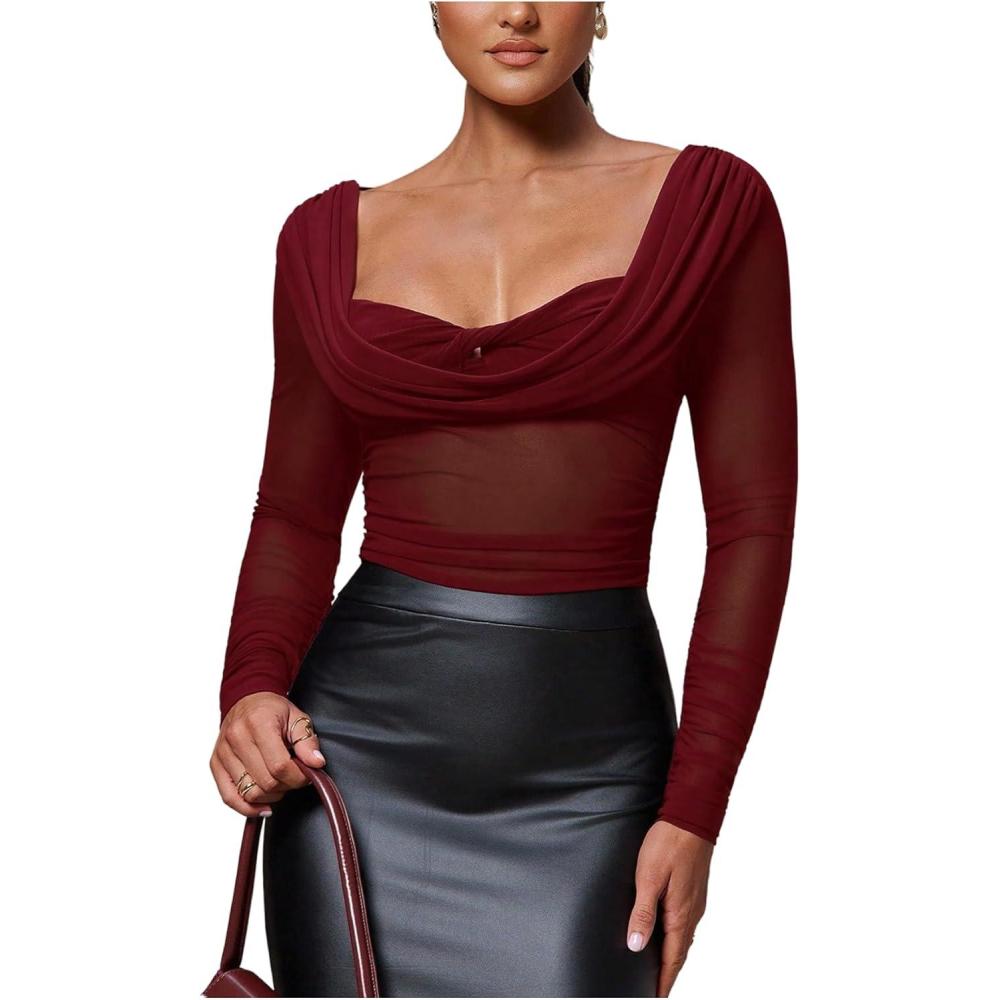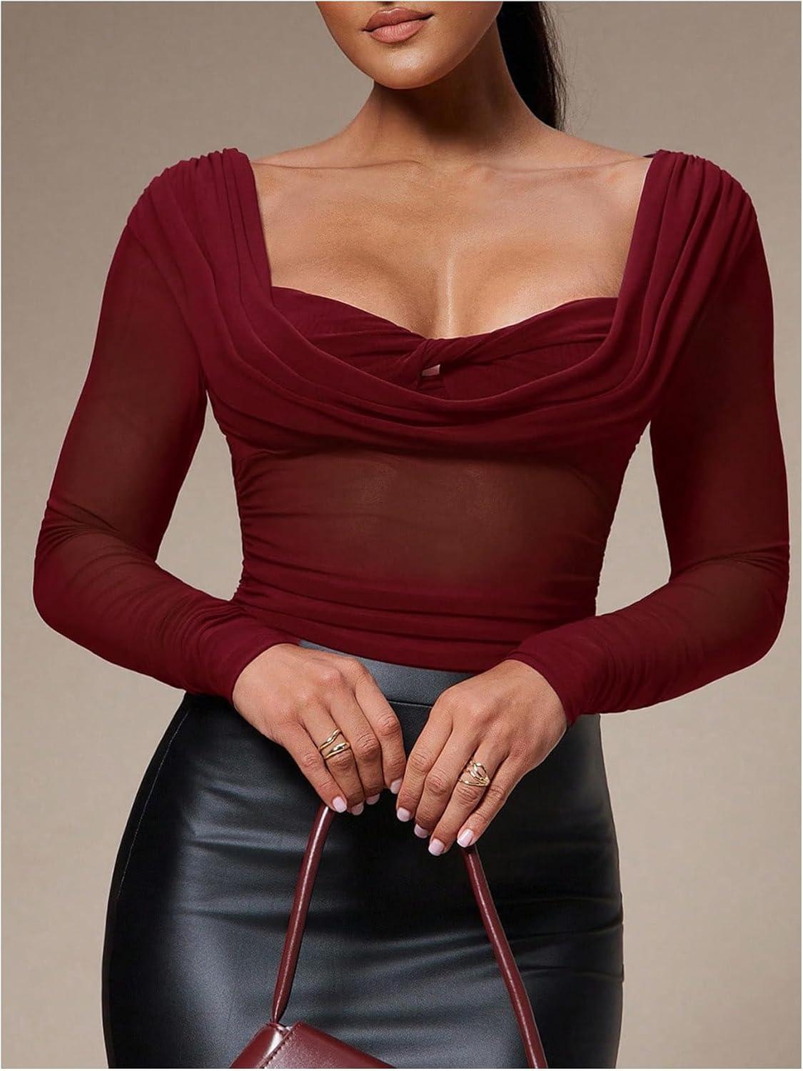 SOLY HUX Women’s Mesh T Shirt Long Sleeve Sweetheart Neck Twist Draped Ruched Sheer Tee See Through Going Out Tops(Plain Burgundy)