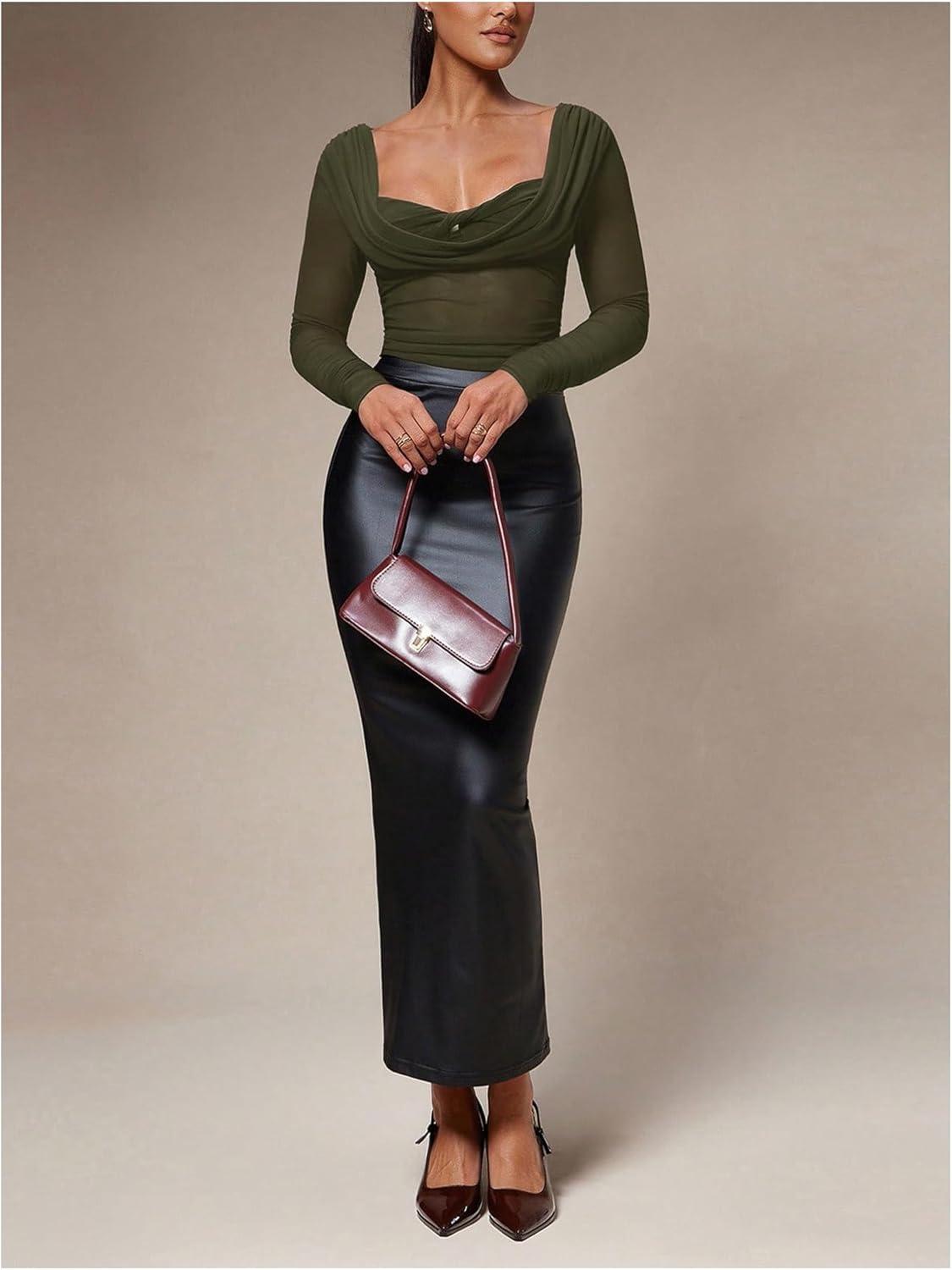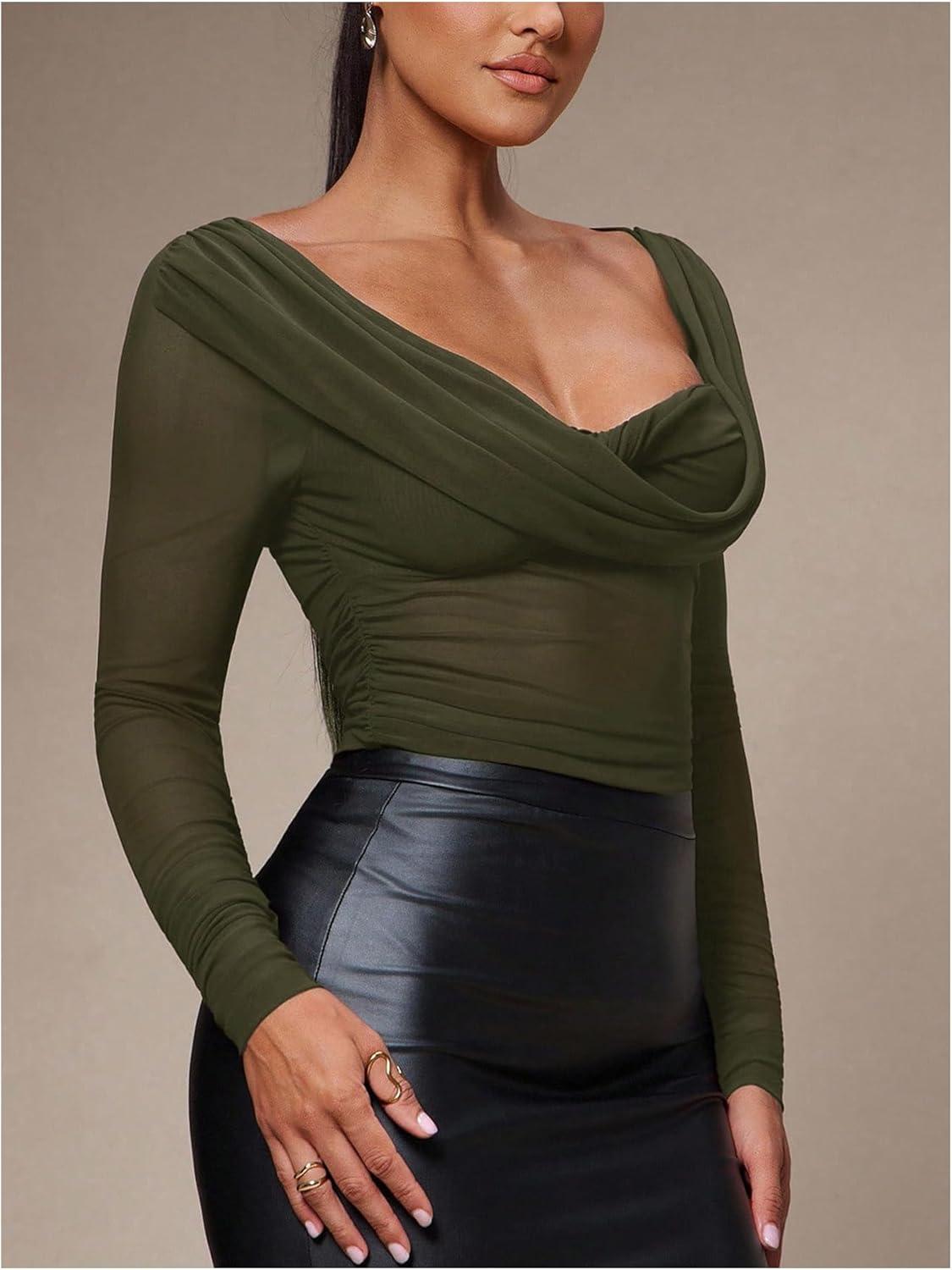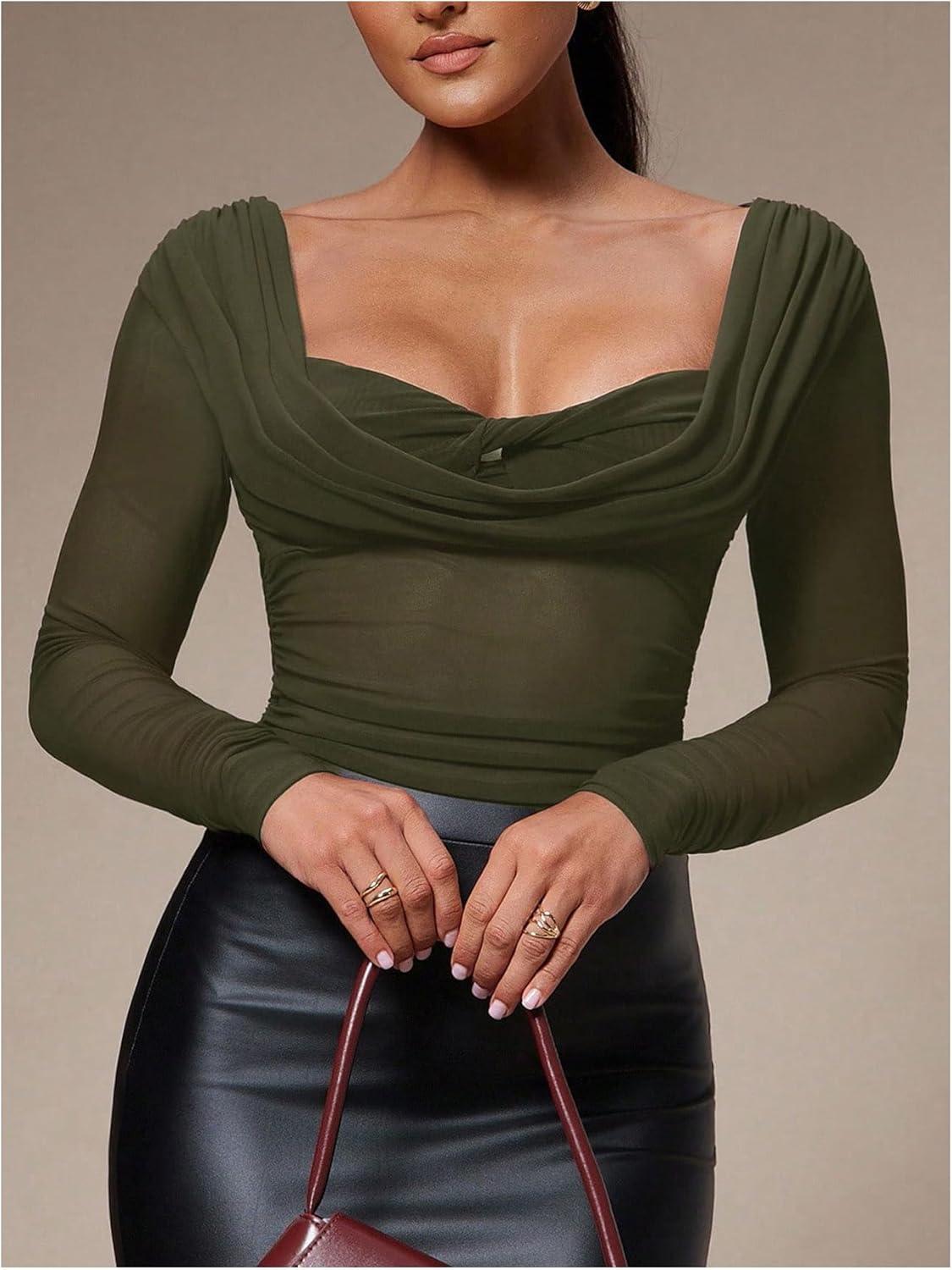 SOLY HUX Women’s Mesh T Shirt Long Sleeve Sweetheart Neck Twist Draped Ruched Sheer Tee See Through Going Out Tops(Pure Army Green)