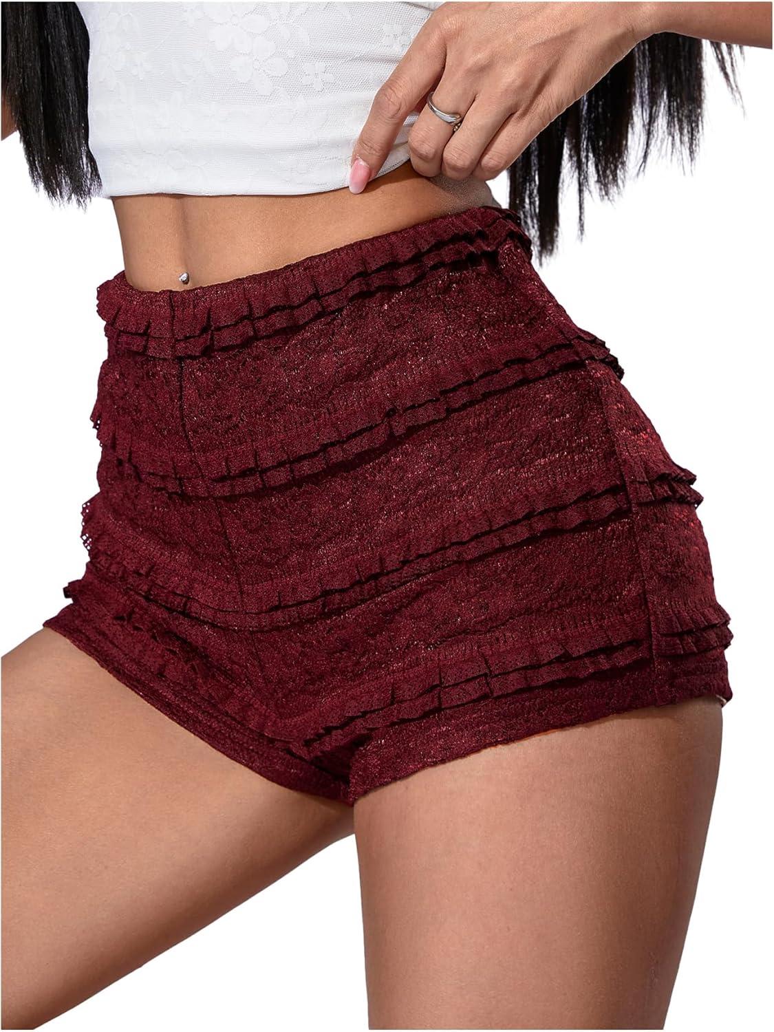 SOLY HUX Women’s Micro Ruffle Shorts Lace Bloomers Y2k Low Rise Layered Mini Shorts(Plain Burgundy)