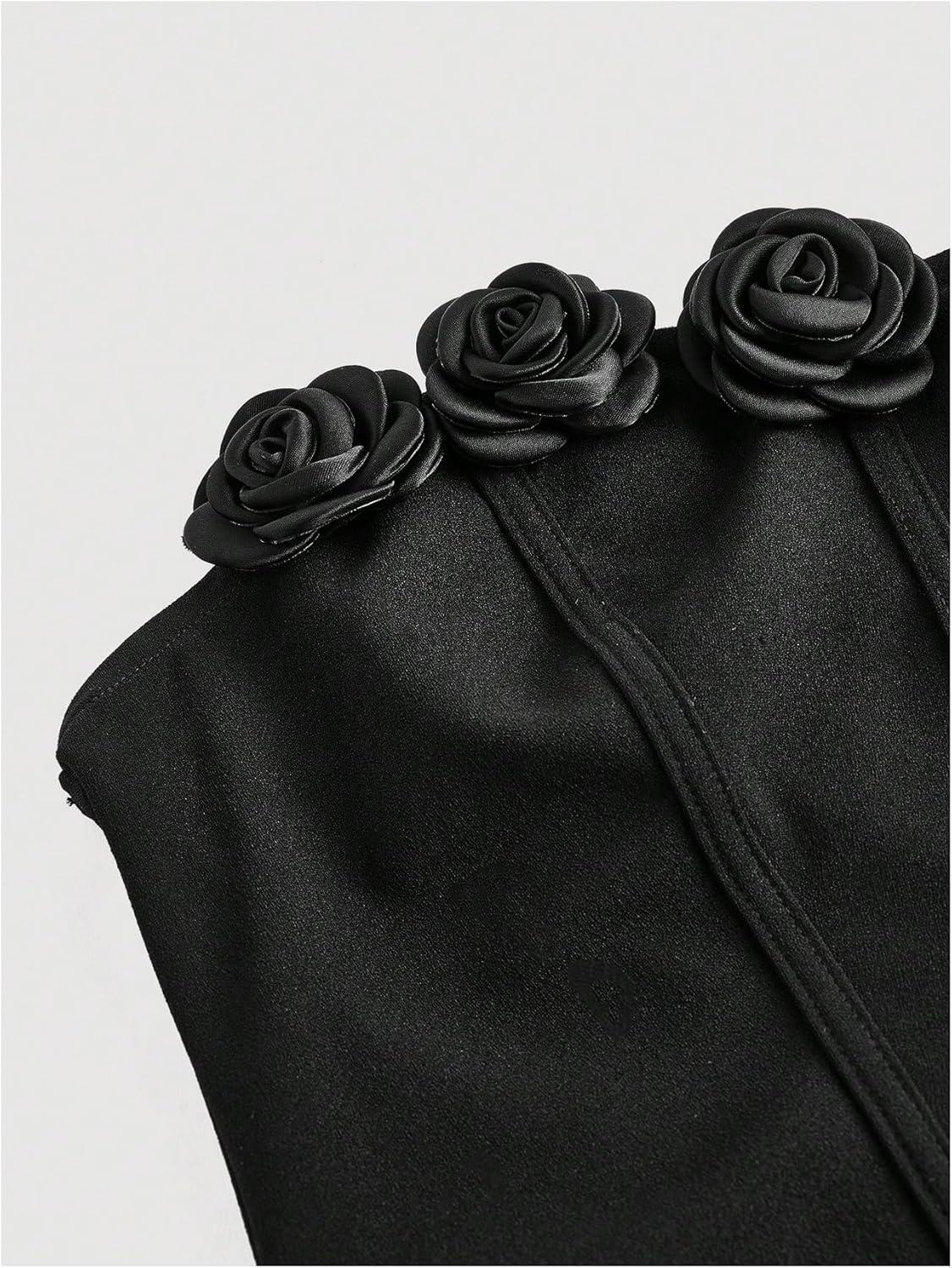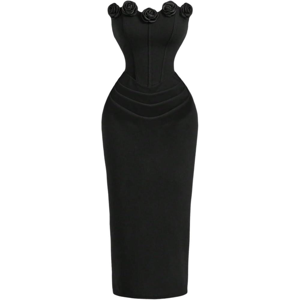 SOLY HUX Women’s Midi Dress Floral Appliques Ruched Strapless Sleeveless Split Bodycon Tube Dresses(Solid Black)