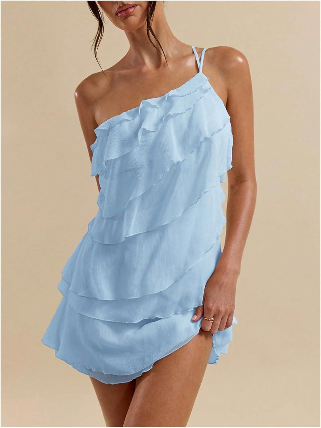 SOLY HUX Women’s Mini Dress One Shoulder Ruffle Mesh Dresses Layered Backless Vacation Party Sundresses(Light Blue)