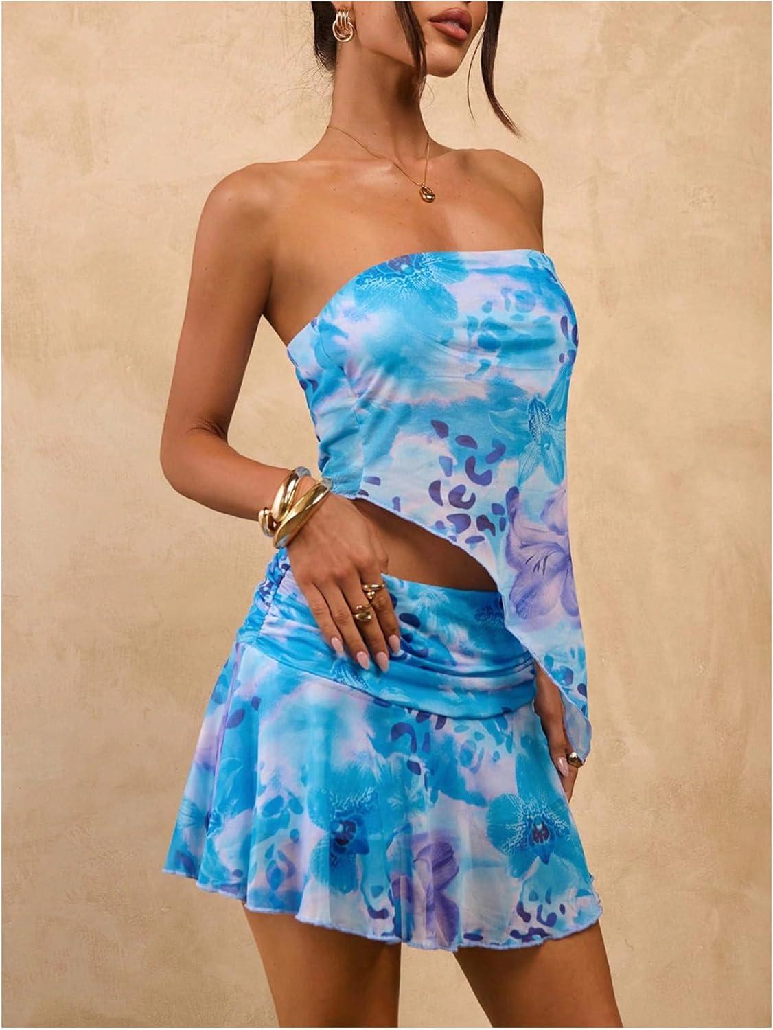 SOLY HUX Women’s Mini Skirt Set 2 Piece Floral Print Tube Top Skirts Going Out Outfits Beach Vacation Clothes(Blue Floral)
