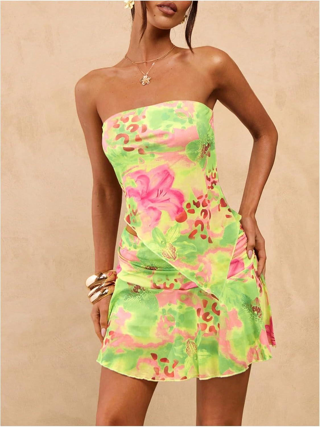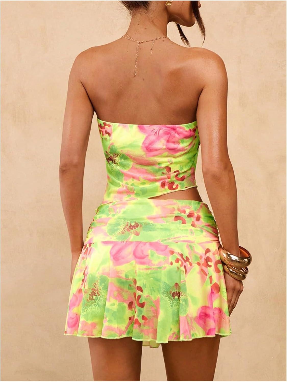 SOLY HUX Women’s Mini Skirt Set 2 Piece Floral Print Tube Top Skirts Going Out Outfits Beach Vacation Clothes(Mint Green)