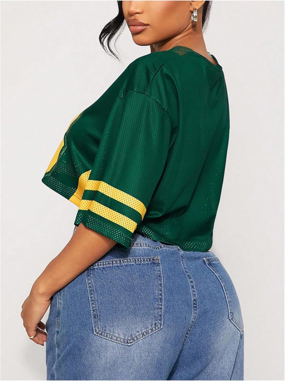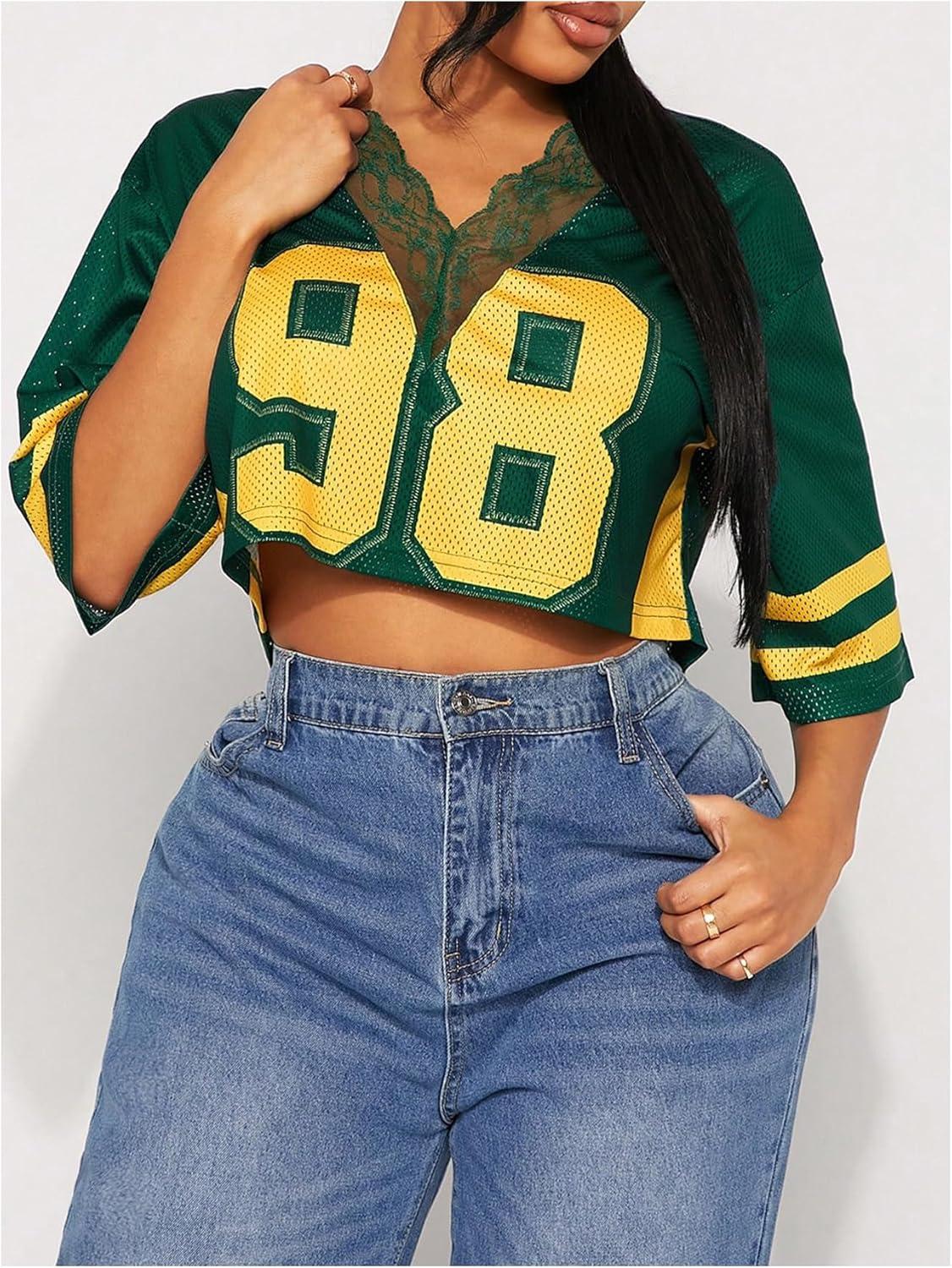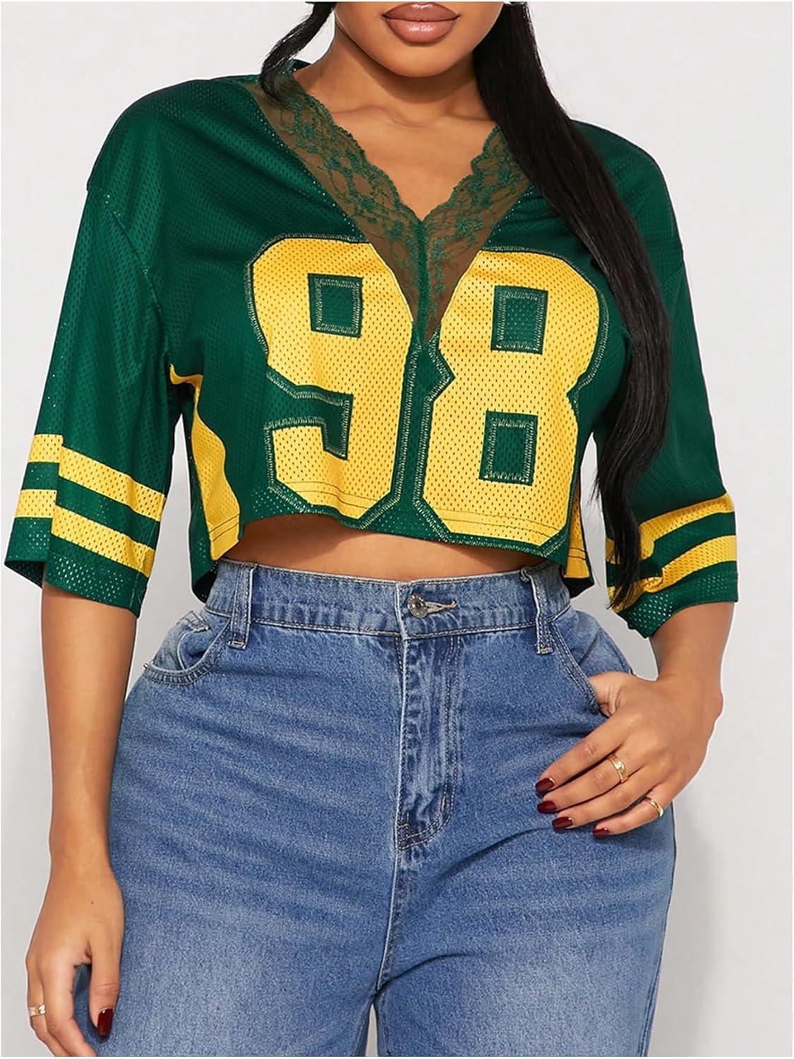 SOLY HUX Women’s Number Graphic Tees Lace V Neck Half Sleeve Crop Tops Jersey Shirt Y2k Streetwear(Green Number)